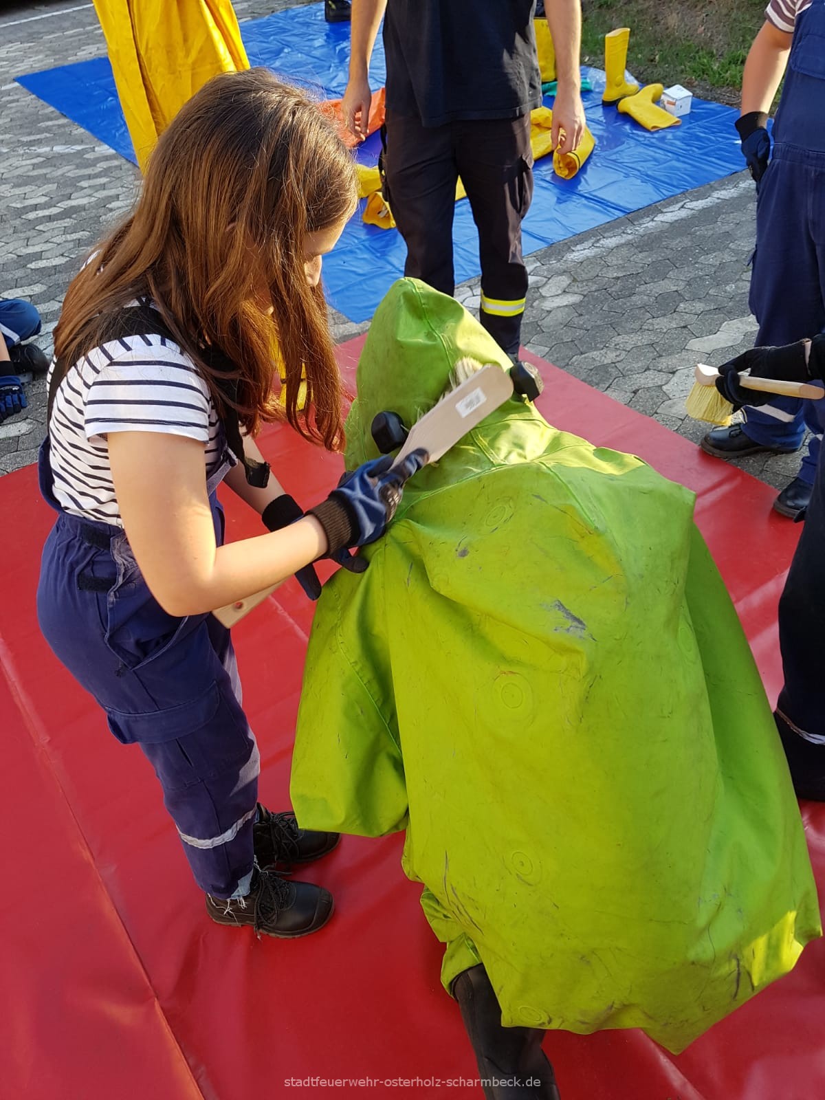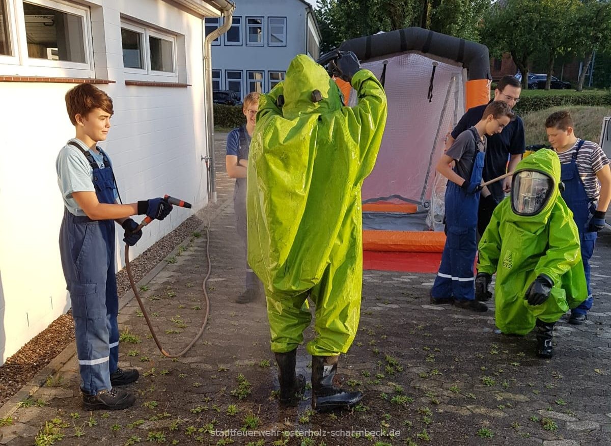 Die Jugendfeuerwehr Osterholz-Scharmbeck hat bei passenden Wetter, die Grundlagen Gefahrgut zum Dienstthema. Dieses mal war der Schwerpunkt auf Dekontamination. (Reinigung der Einsatzkräfte nach dem Gefahrguteinsatz)