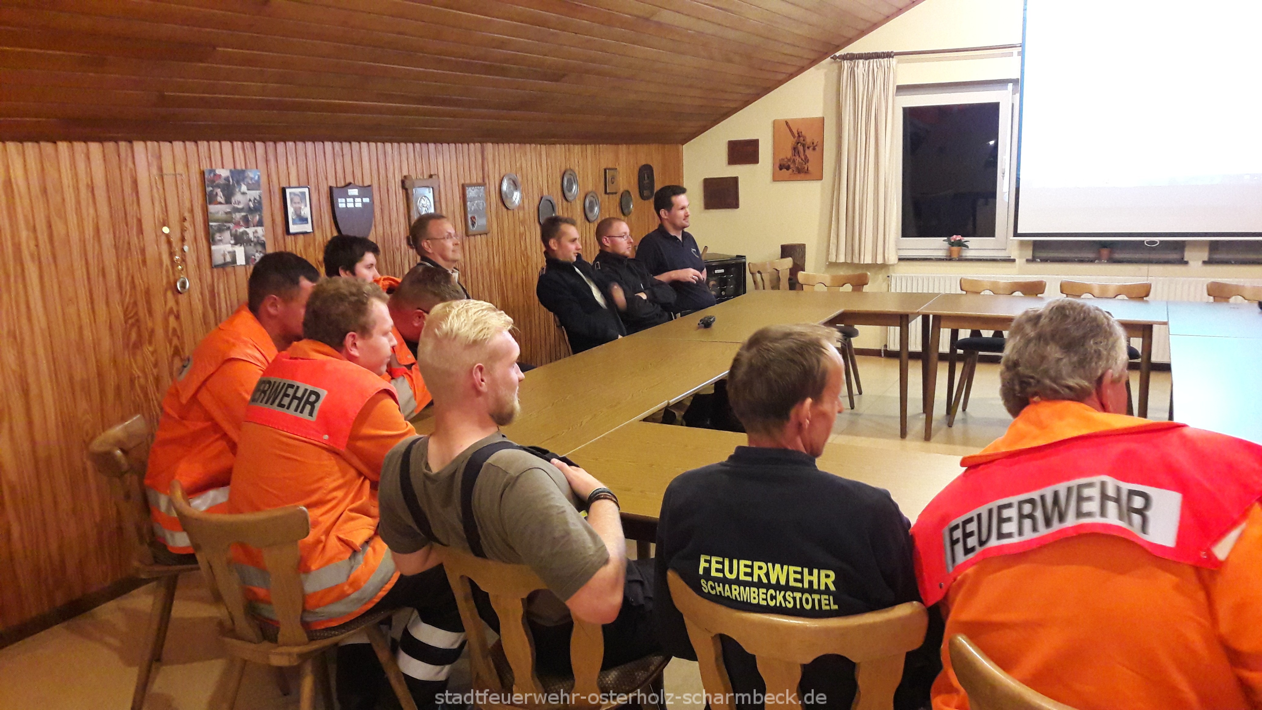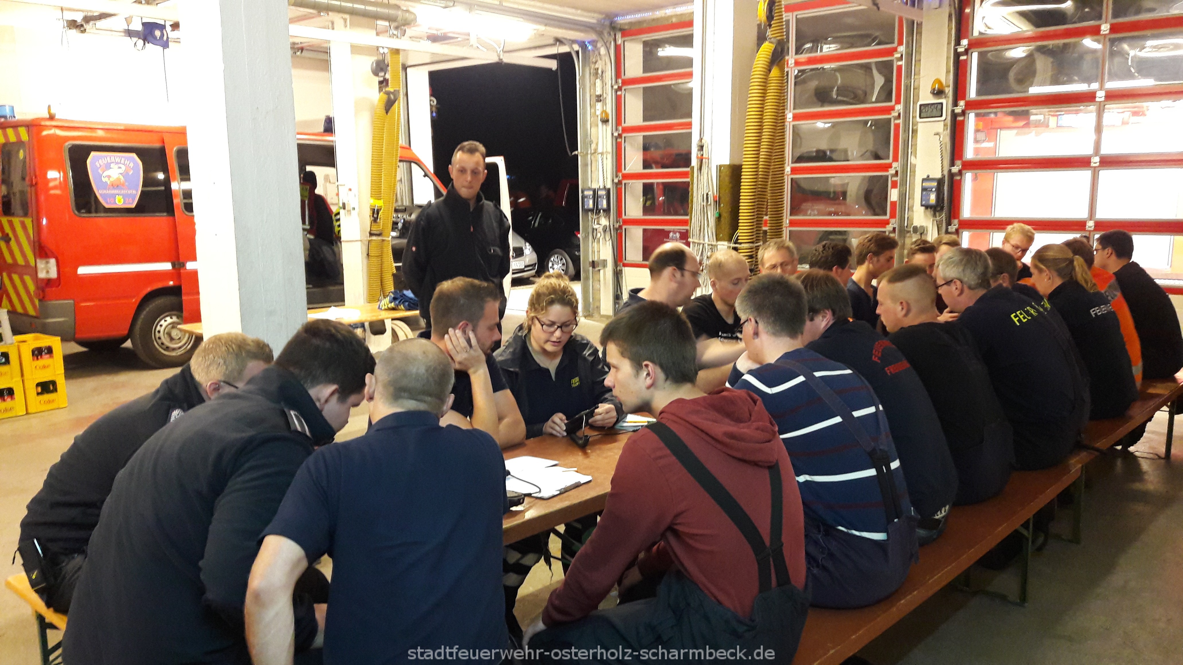 Ausrichter war in diesem Jahr die Ortsfeuerwehr Scharmbeckstotel, an deren Feuerwehrhaus sich alle einfanden, um dort an einem Ausbildungsabend teilzunehmen. In diesem Jahr wurde erstmalig der Schwerpunkt auf die Funktionen des Digitalfunks gesetzt. In zwei Gruppen wurden sowohl Bedienerinformationen geschult, insbesondere die grundsätzliche Handhabung der Geräte, aber auch ein kleiner Informationsteil über das neu eingeführte Digitalfunkkonzept sowie die Führungseinheit. Der erst vor wenigen Jahren eingeführte Digitalfunk, bietet den Einsatzkräften ein breites Spektrum an Möglichkeiten im Einsatz damit zu agieren. Ähnlich einem heutigen Smartphone, gibt es eine vielfältige Menüführung, mit der man nicht bloß funken kann, sondern auch telefonieren, Textnachrichten versenden kann und vieles mehr. Die neuen Geräte sind unter anderem in der Lage über weitere Distanzen zu funken und auch in großen Kelleranlagen kann durch gezieltes aufstellen von weiteren Geräten die Verständigungen ermöglicht werden. Diese Funktionen sind zum Teil komplex und müssen immer wieder geübt werden, um das sichere Vorgehen im Einsatz damit zu ermöglichen. Im Bereich des neuen Digitalfunkkonzeptes wurden neue Möglichkeiten geschaffen, um Einsätze mit Hilfe der Funkgeräte noch effektiver abzuarbeiten, was mit einer kleinen Übung veranschaulicht wurde. Ebenso die Führungseinheit bietet bei großen Einsätzen, insbesondere auch die immer häufiger werdenden Sturmeinsätze, eine zielgerichtete Kommunikation zur Entlastung der Einsatzleitung vor Ort, als auch der Leitstelle in Bremerhaven.