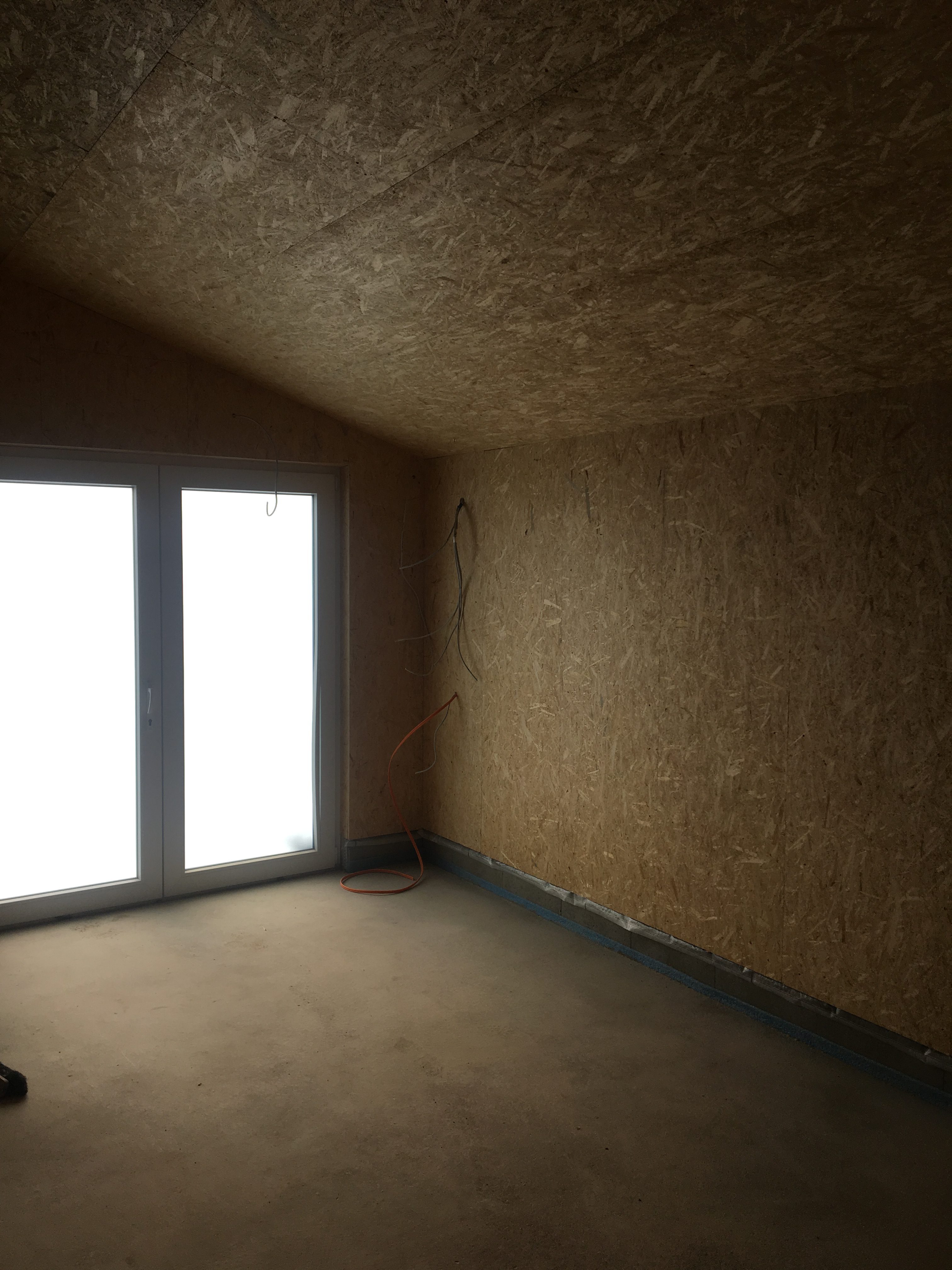 Die Werkstatt, welche hinter der Alten Fahrzeughalle entstanden ist, wurde mit OSB-Platten verkleidet.Die Elektro und Heizungsinstallation ist auch hier schon weit Fortgeschritten.
