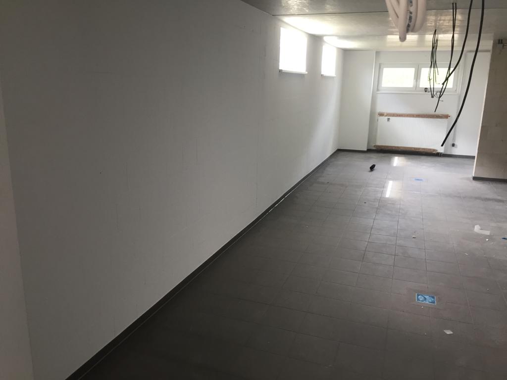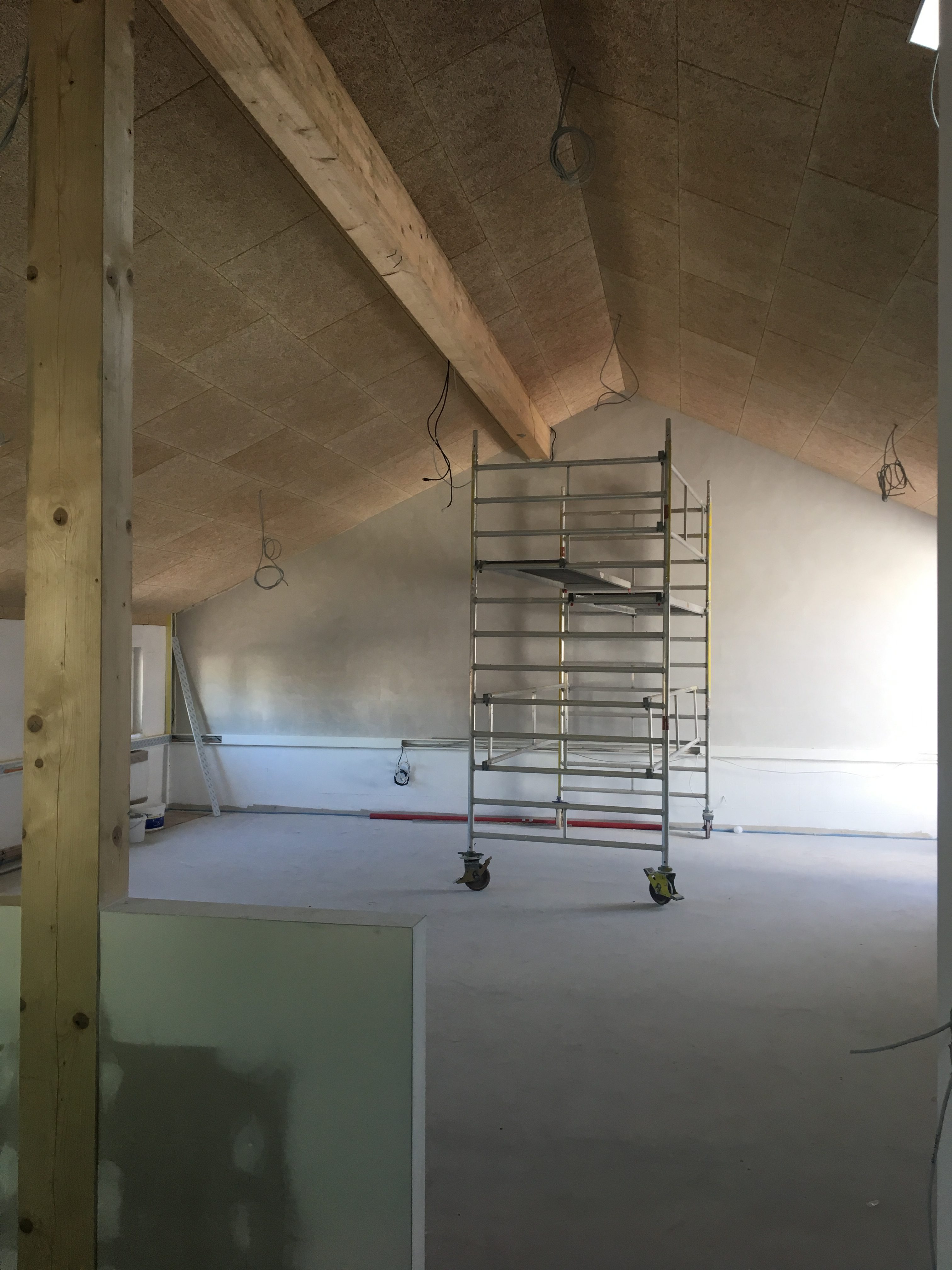 Im Obergeschoss, im zukünftigen Schulungs- und Dienstraum wurden die Wände gestrichen, sowie teilweise verspachtelt. Ebenfalls wurde die Decke mit Schallschutzplatten verkleidet.