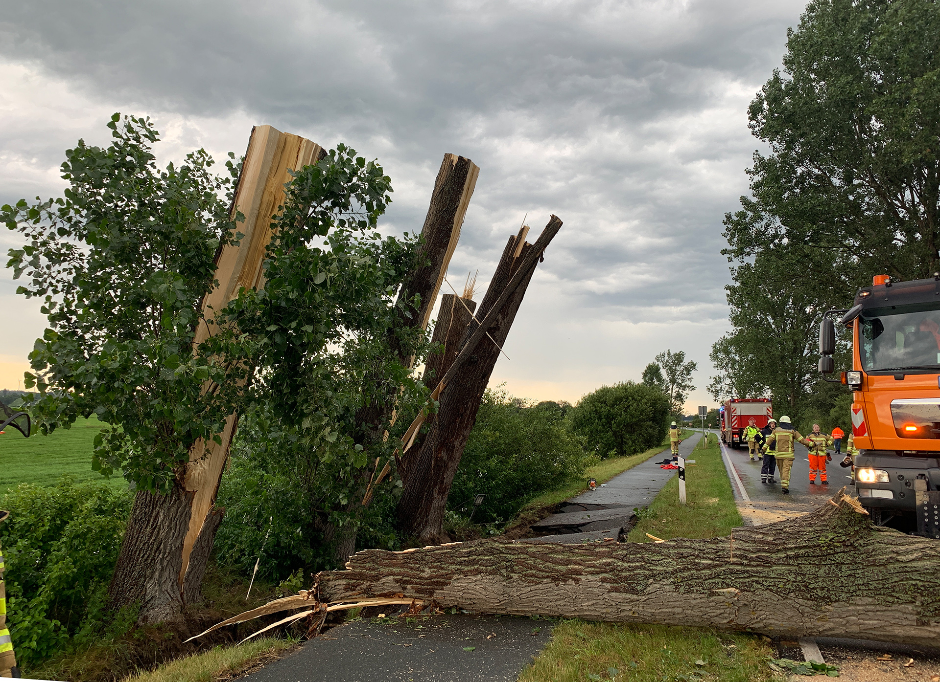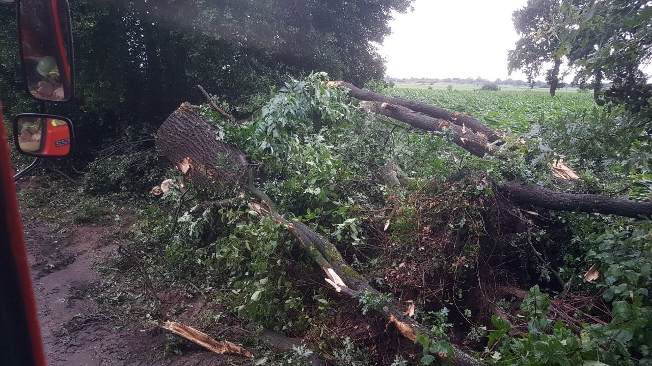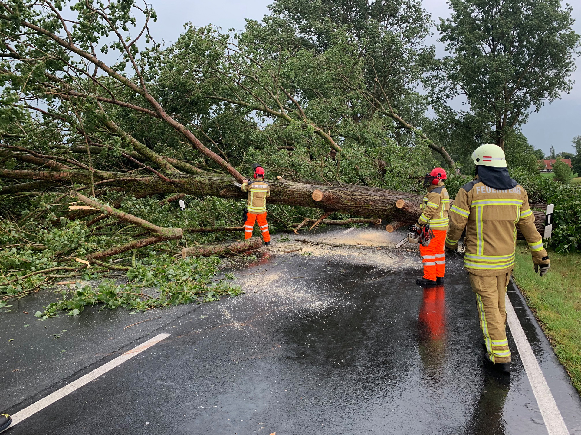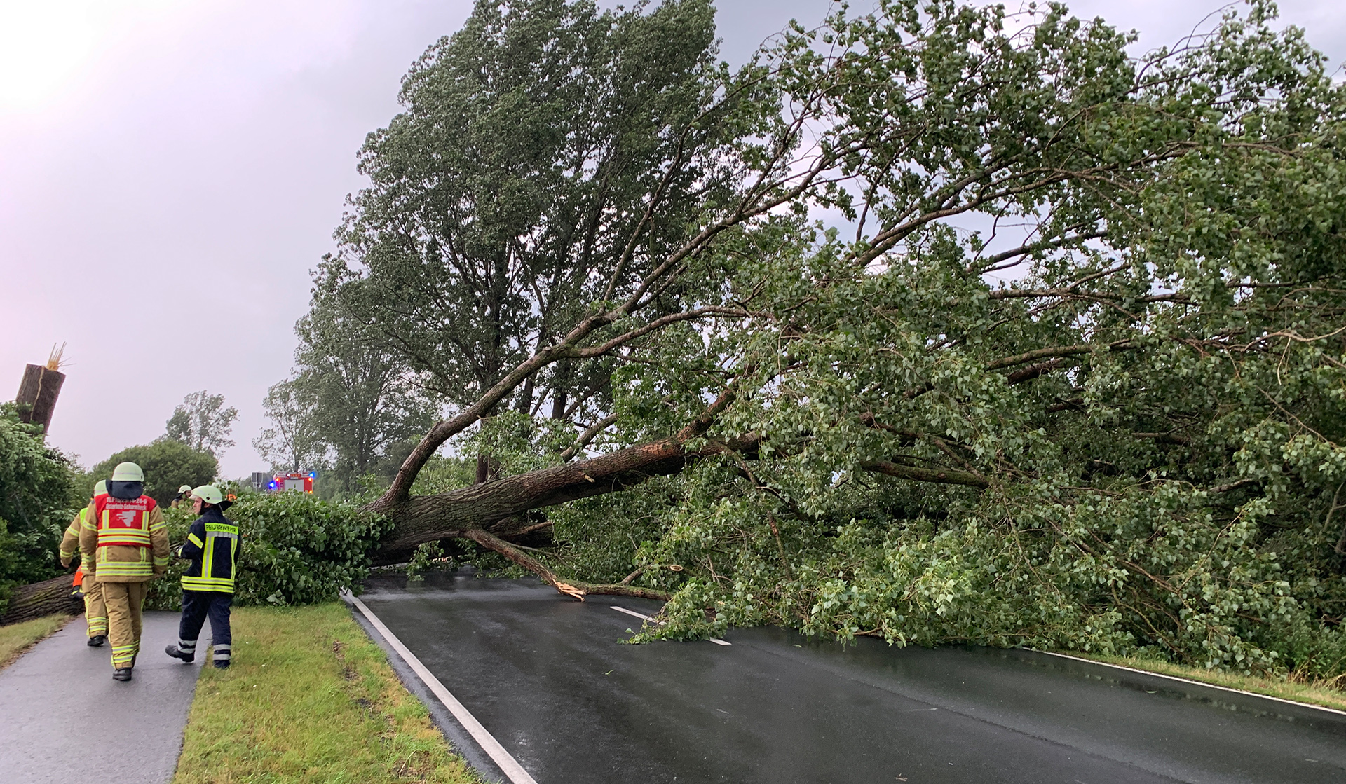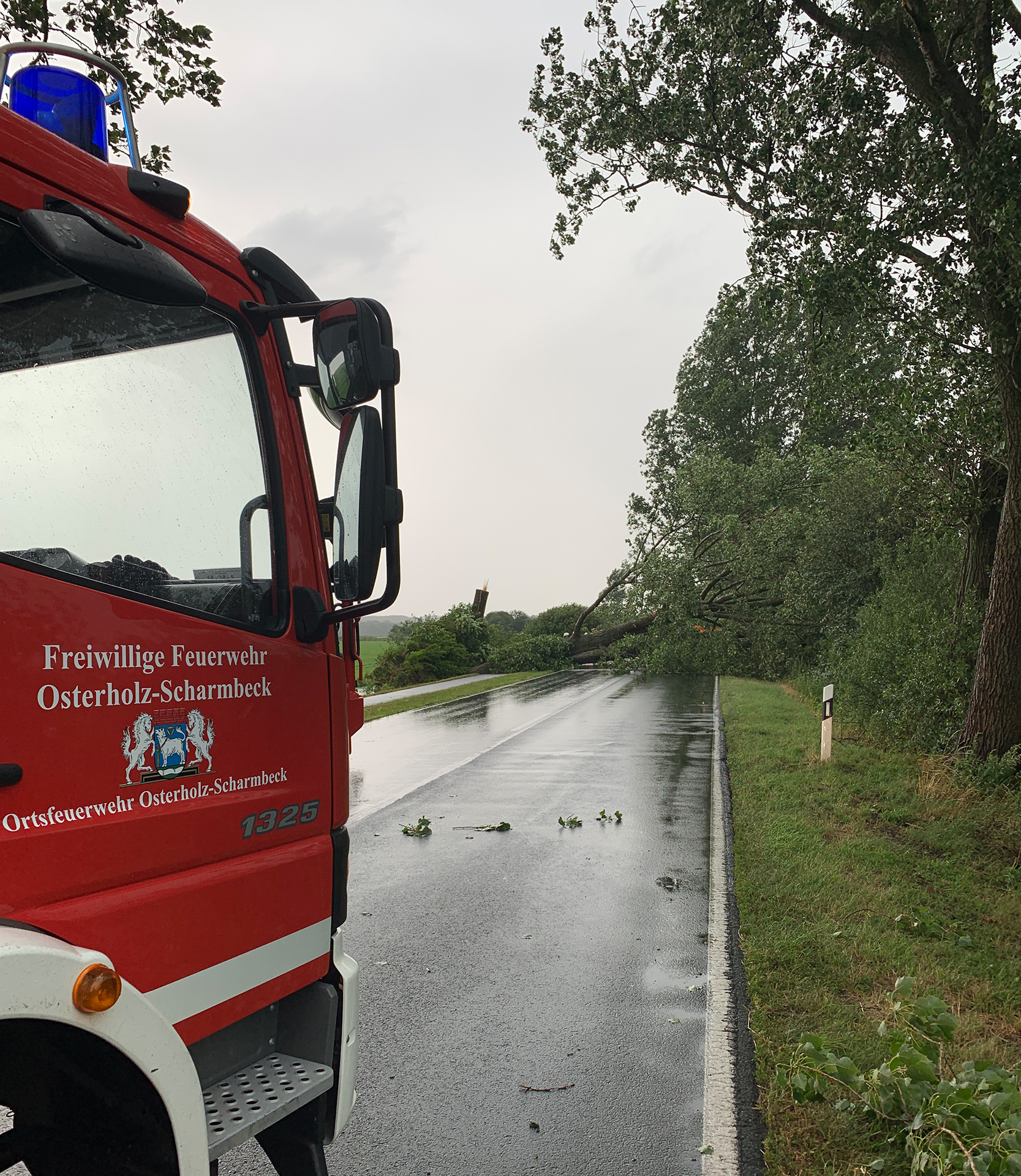 Die erste Alarmierung erreichte die Ortsfeuerwehr Osterholz-Scharmbeck kurz nach 15 Uhr. Mehrere massive Bäume waren umgestürzt und blockierten die K9 zwischen Hafenstraße und Tietjens Hütte. Mit Motorsägen wurden die Bäume zerteilt und mit Unterstützung der Kreisstraßenmeisterei gelang es, die Straße zu räumen – diese bleibt allerdings aufgrund der Beschädigungen bis auf Weiteres gesperrt.