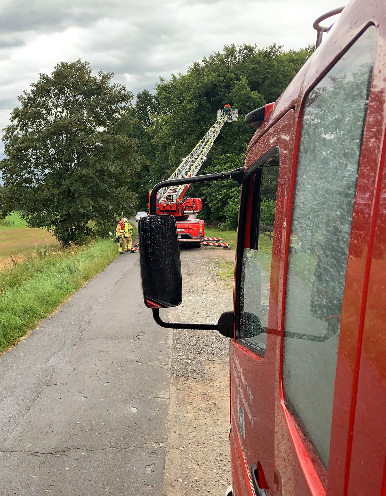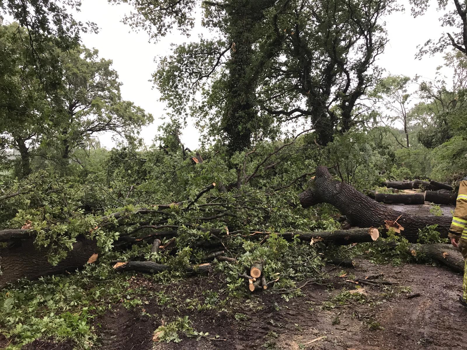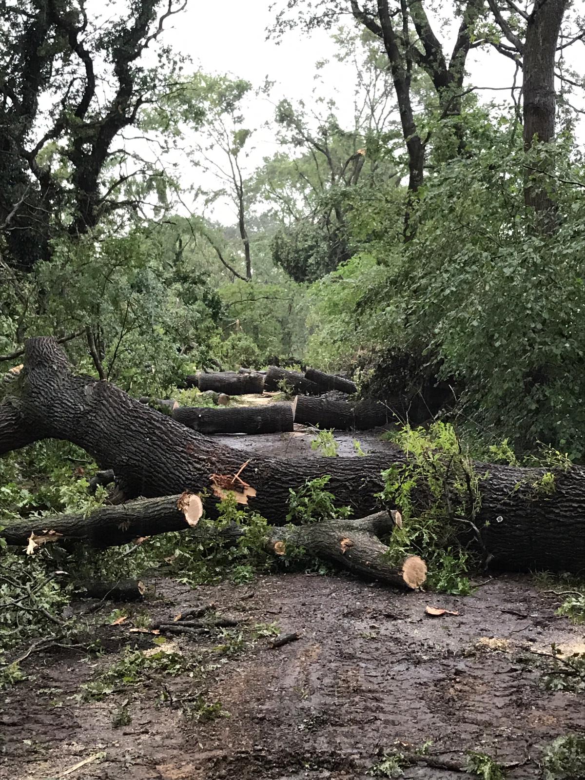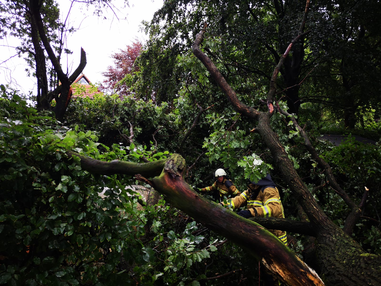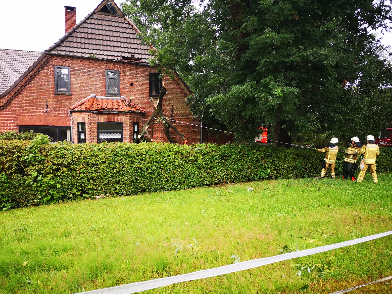 Die erste Alarmierung erreichte die Ortsfeuerwehr Osterholz-Scharmbeck kurz nach 15 Uhr. Mehrere massive Bäume waren umgestürzt und blockierten die K9 zwischen Hafenstraße und Tietjens Hütte. Mit Motorsägen wurden die Bäume zerteilt und mit Unterstützung der Kreisstraßenmeisterei gelang es, die Straße zu räumen – diese bleibt allerdings aufgrund der Beschädigungen bis auf Weiteres gesperrt.