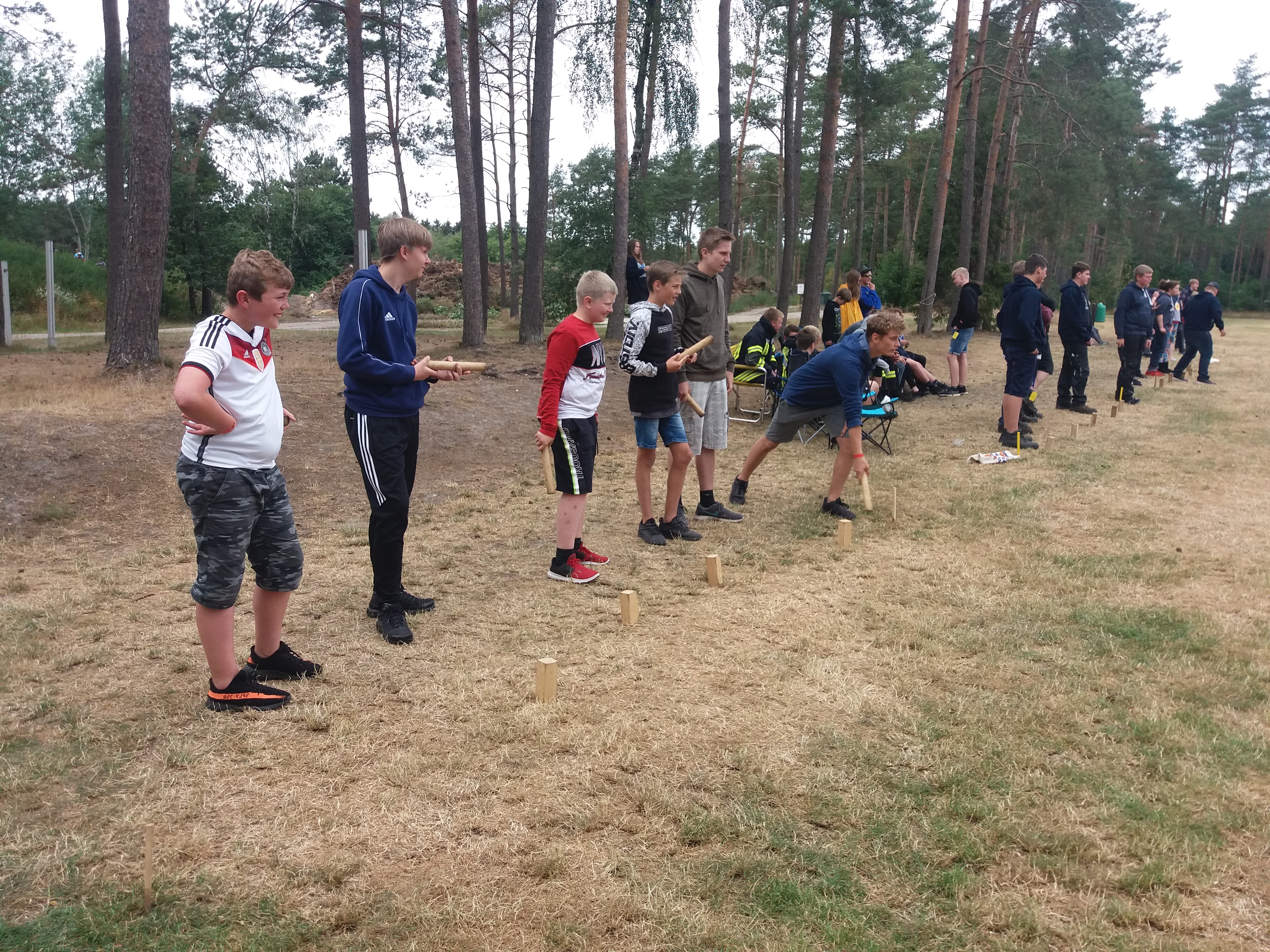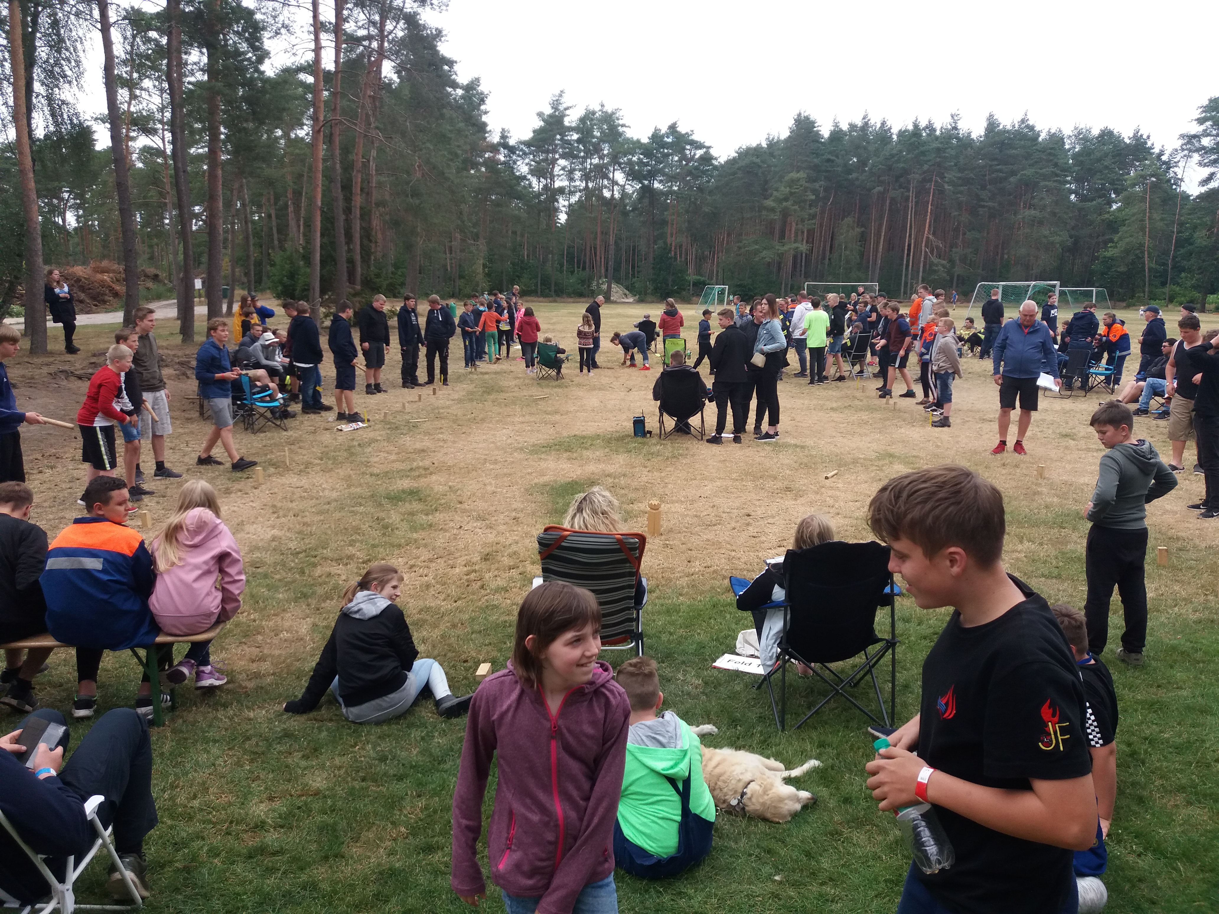 Jetzt geht es los, wir treffen uns auf dem Sportplatz um Wikingerschach zu spielen. Mit 21 Gruppen aus denn 15 Jugendfeuerwehren spielen wir in einem Turnier gegen einander. Das Turnier ging über den ganzen Tag. Nur unterbrochen durch das Mittagessen (Sahneschnitzel mit Spätzle) und die Mittagspause.