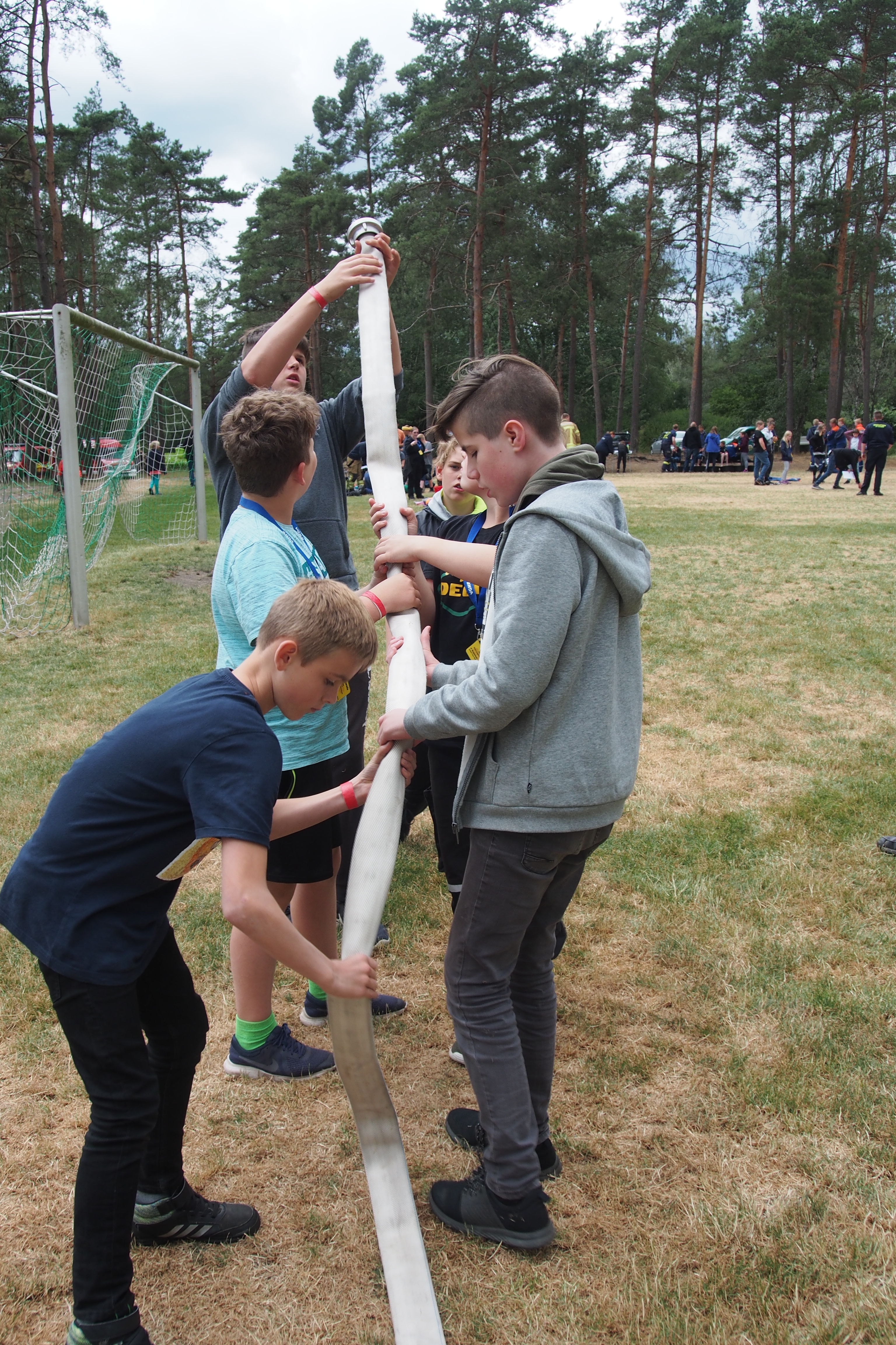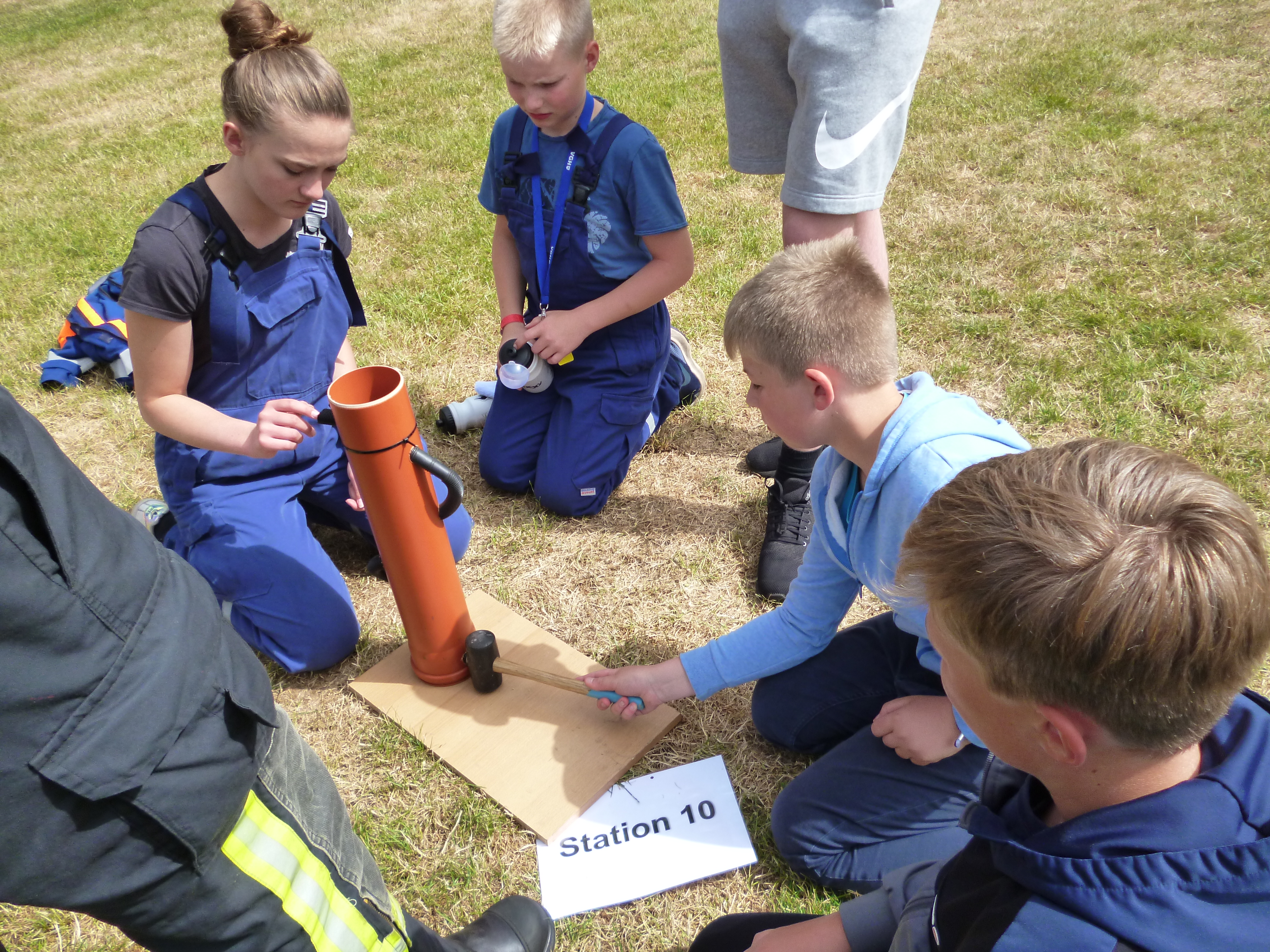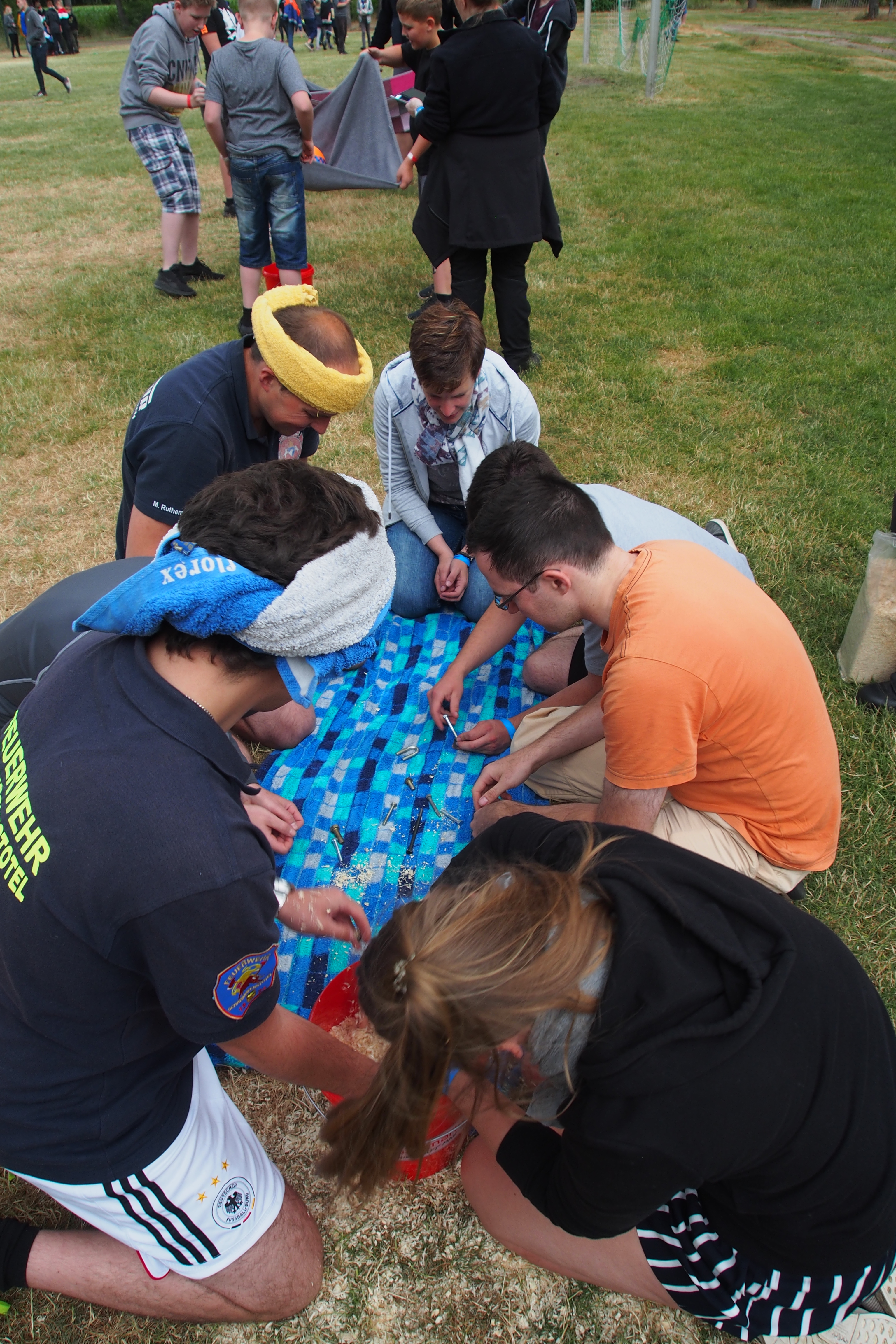 Die 15 Stationen mit ganz unterschiedlichen Aufgaben absolvierten wir am Nachmittag. Wir haben Papierflieger geworfen, gegurgelte Lieder erraten, Feuerwehrleine fädeln, Geld in ein Schnapsglas unter Wasser werfen, Kugeln gestoßen und noch mehr.