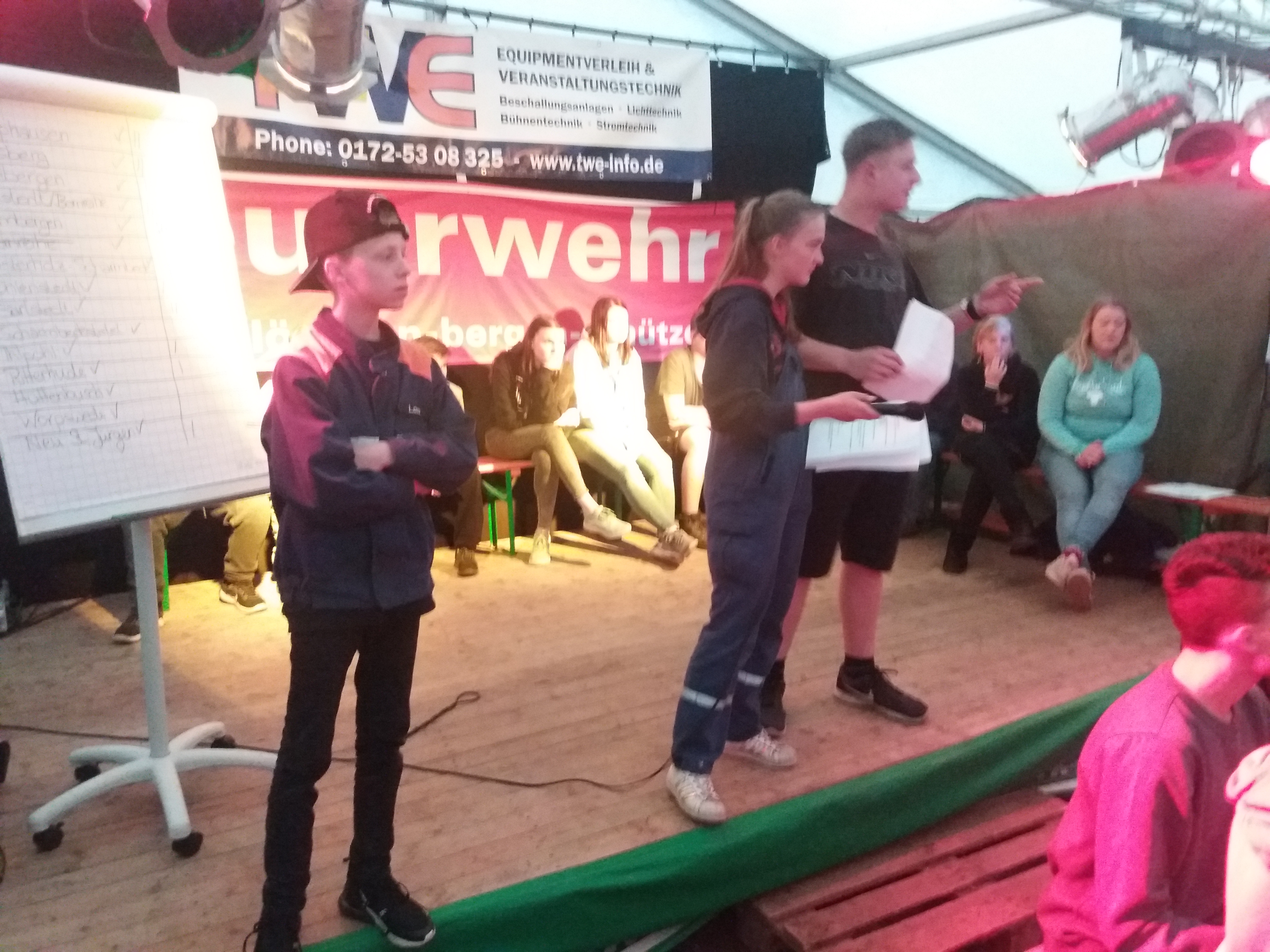 Das Abendprogramm wurde vom Kreisjugendforum (Alle Jugendsprecher aus dem Landkreis Osterholz die beim Zeltlager dabei sind.) organisiert. Es war ein Quiz der Jugendfeuerwehren mit Fragen und Lieder erraten.