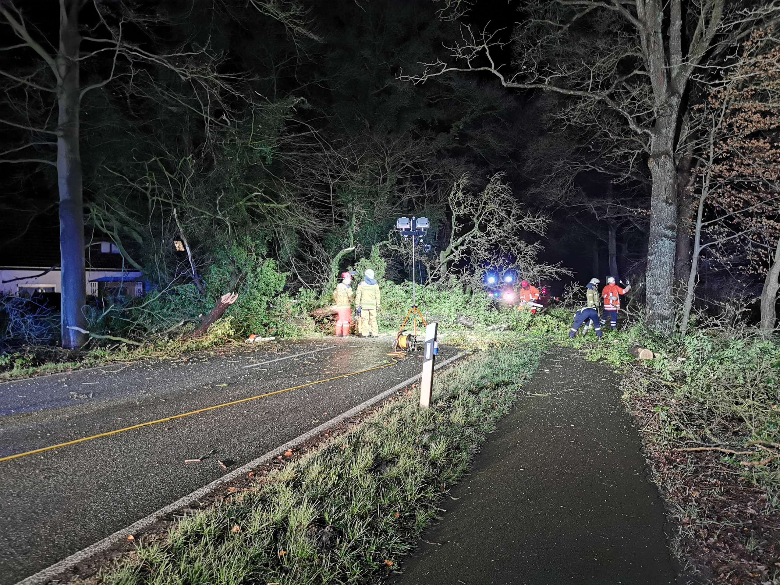 Kurz vor 4 Uhr wurde die Ortsfeuerwehr Osterholz-Scharmbeck mit dem Stichwort „Baum auf Straße“ zur Kreisstraße 46 zwischen Westerbeck und Hülseberg alarmiert. Vor Ort fanden die Einsatzkräfte eine umgestürzte Eiche mit einem Stammdurchmesser von ca. 45cm vor, die quer über beide Spuren die Straße blockierte. Die Einsatzstelle wurde ausgeleuchtet und die Straße gesperrt.