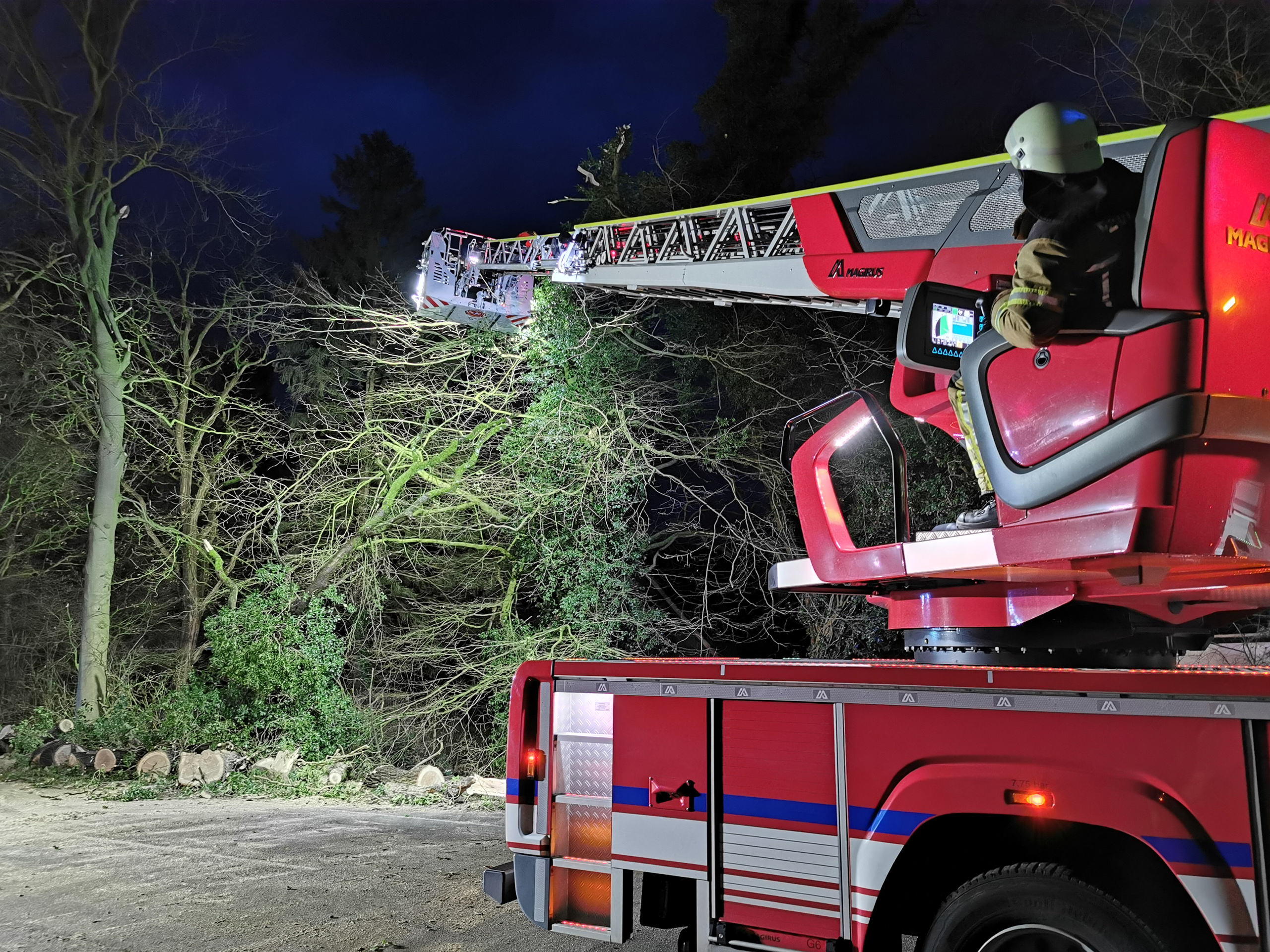 Mit Hilfe der ebenfalls nachalarmierten Drehleiter wurden die stehen gebliebenen Restbäume begutachtet, um weitere Gefährdungen für den Straßenverkehr auszuschließen und loses Astwerk zu entfernen. Anschließend wurde die Straße gereinigt, bevor diese nach 3 Stunden Einsatz gegen 7 Uhr wieder für den morgendlichen Verkehr frei gegeben werden konnte. Anschließend rückten beiden Wehren wieder ein.