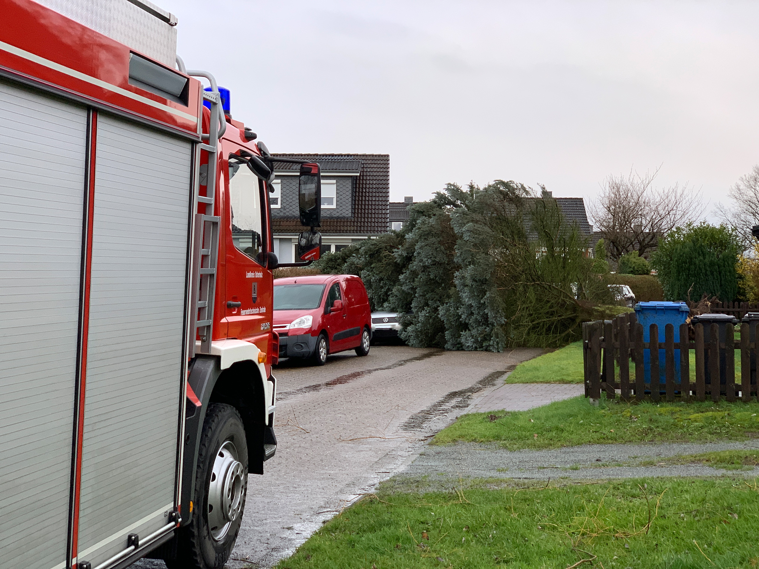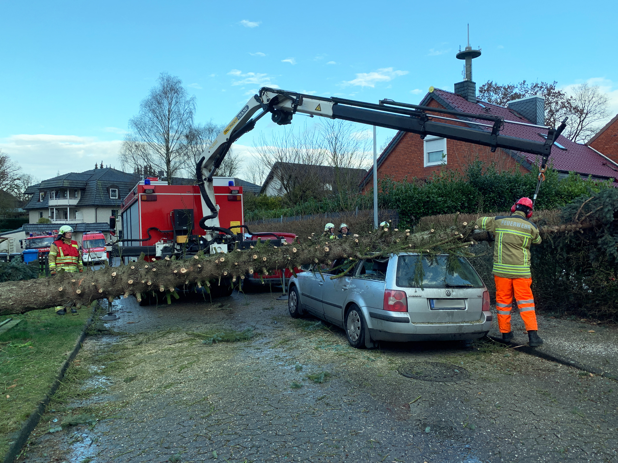 Eine Sturmböe entwurzelte in Osterholz-Scharmbeck eine ca. 12 Meter lange Tanne. Diese stürzte quer über die Straße und beschädigte einen geparkten PKW, in dem sich glücklicherweise keine Personen aufhielten. Die alarmierte Ortsfeuerwehr Osterholz-Scharmbeck zersägte die Tanne mit mehreren Kettensägen. Der mit einem Durchmesser von ca. 60cm recht massive Stamm wurde anschließend mit Hilfe des Krans des Rüstwagens angehoben und zur Seite gelegt. Anschließend wurde die Straße gereinigt und konnte dann wieder für den Verkehr frei gegeben werden.