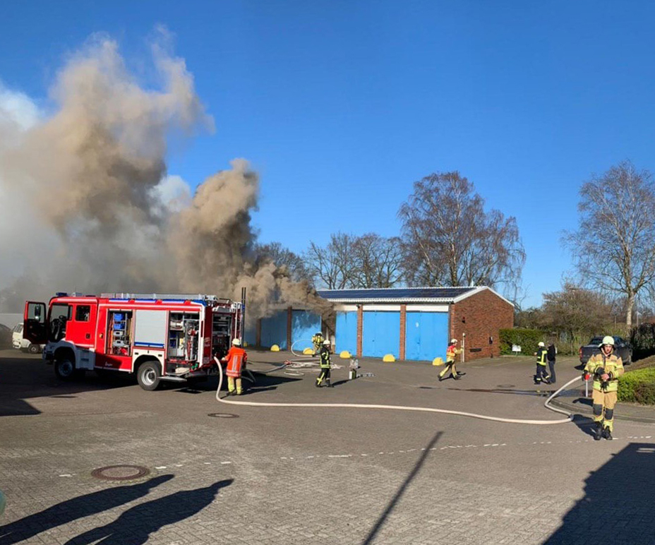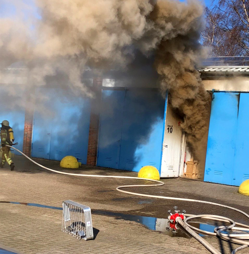 Fünf Ortsfeuerwehren mit rund 75 Einsatzkräften waren heute Nachmittag in Pennigbüttel im Einsatz. Zunächst erfolgte die Alarmierung für die Ortsfeuerwehren Pennigbüttel und Osterholz-Scharmbeck. Bei Eintreffen vor Ort fanden die Einsatzkräfte eine ca. 20m lange Lagerhalle mit starker Rauchentwicklung vor. Aus dem rückwärtigen Bereich traten bereits Flammen aus. Durch die Einsatzleitung erfolgte die Nachalarmierung der Ortsfeuerwehren Freißenbüttel, Sandhausen und Teufelsmoor. In zwei Einsatzabschnitten erfolgte die Brandbekämpfung von außen über den rückwärtigen Bereich der Halle, sowie von Vorne im Innenangriff mit mehreren Trupps und C-Rohren. Aufgrund der Bauweise, der brennenden Materialien und der auf dem Dach installierten Photovoltaikanlage gestalteten sich die Löscharbeiten anspruchsvoll. Im weiteren Verlauf des Einsatzes wurde über die Drehleiter die Dachhaut geöffnet, um an Glutnester zu gelangen. Mit insgesamt acht Trupps unter Atemschutz, konnte das Feuer auf die Halle begrenzt und umliegende Gebäude geschützt werden. Fünf Stunden nach der ersten Alarmierung war der Einsatz abgeschlossen.