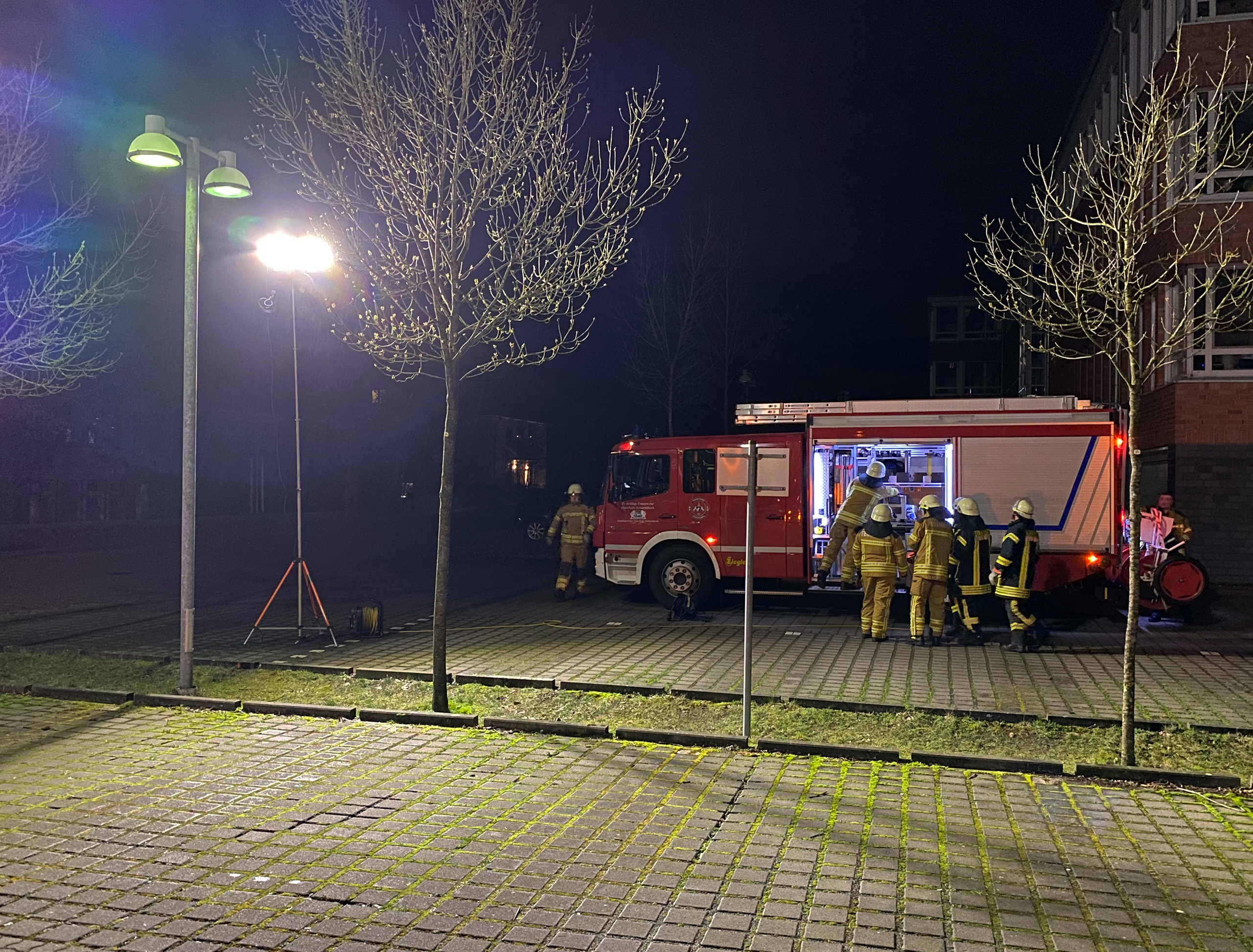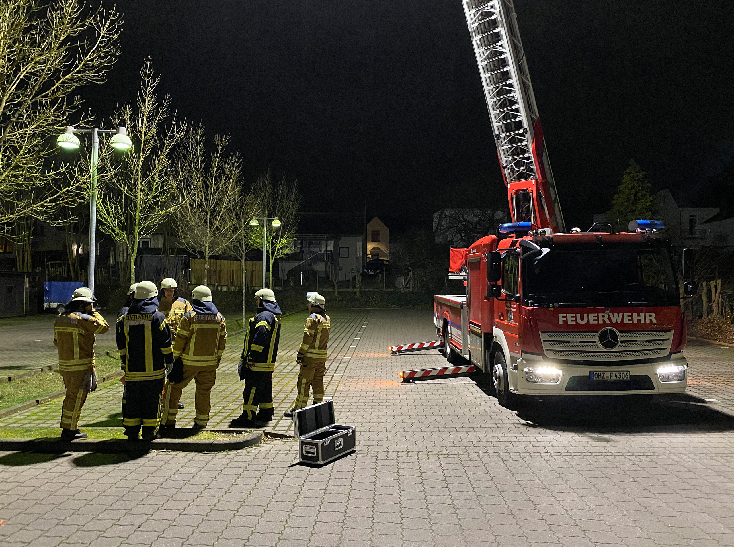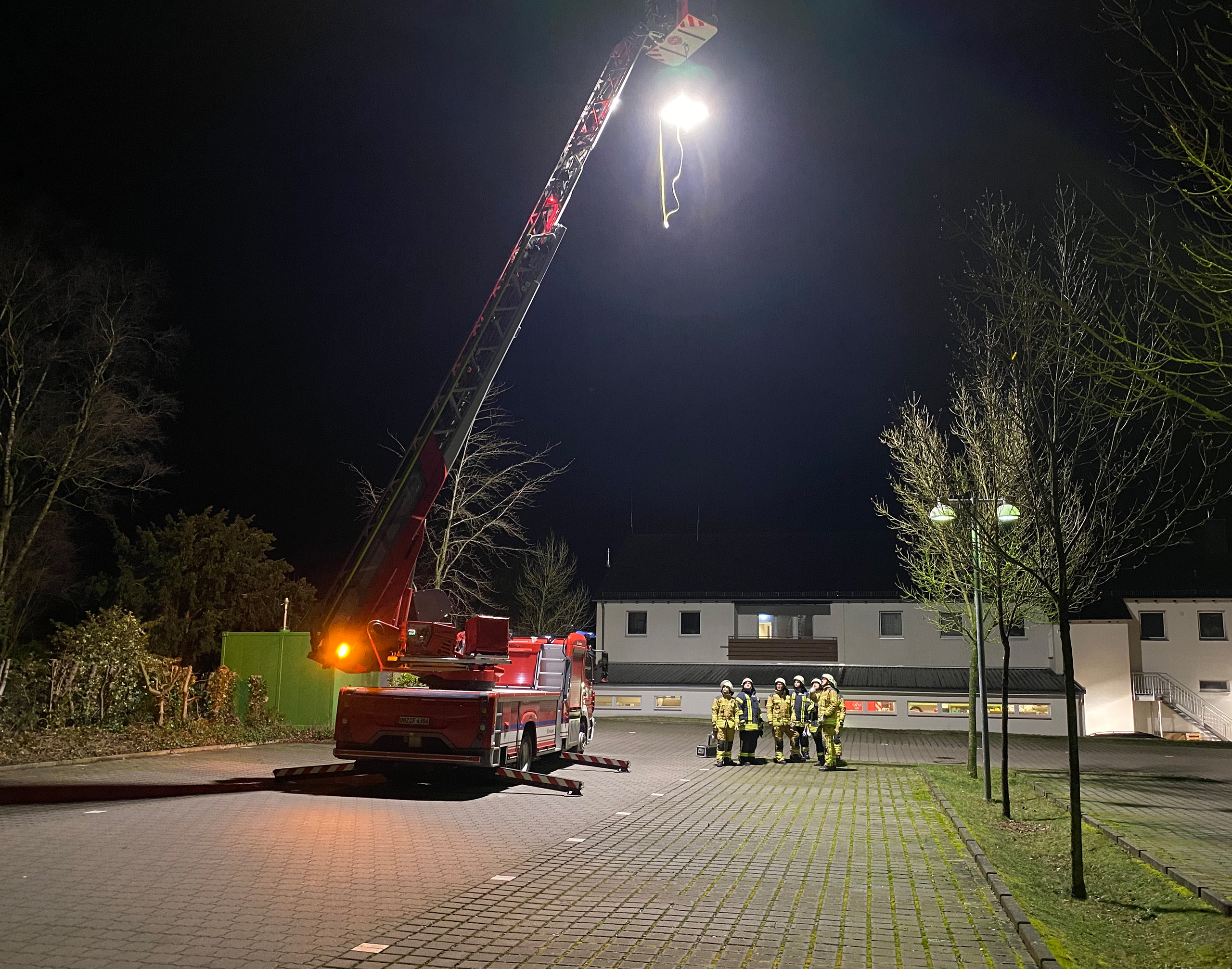 Da die Einsatzstelle nicht immer direkt mit dem Fahrzeug zugänglich ist, führt z.B. das Hilfeleistungslöschgruppenfahrzeug eine sogenannte Scheinwerferbrücke mit. Diese ermöglicht die Positionierung von einzelnen Scheinwerfern in bis zu 4m Höhe. Die Versorgung erfolgt durch den Stromerzeuger des Einsatzfahrzeuges. Damit hier im Einsatzfall schnell agiert werden kann, wurde der Auf- und Abbau sowie die optimale und sichere Positionierung der Scheinwerferbrücke geübt.