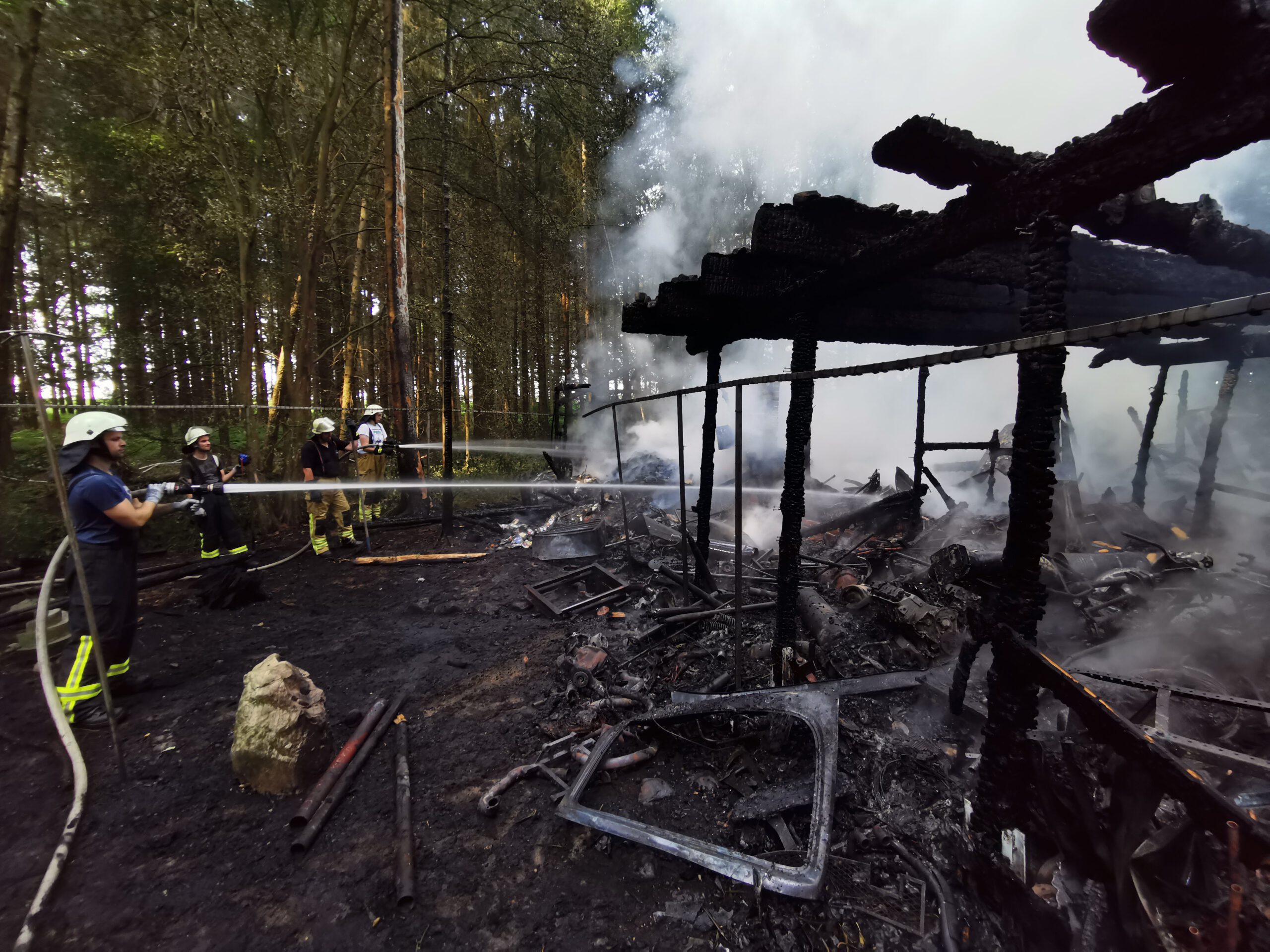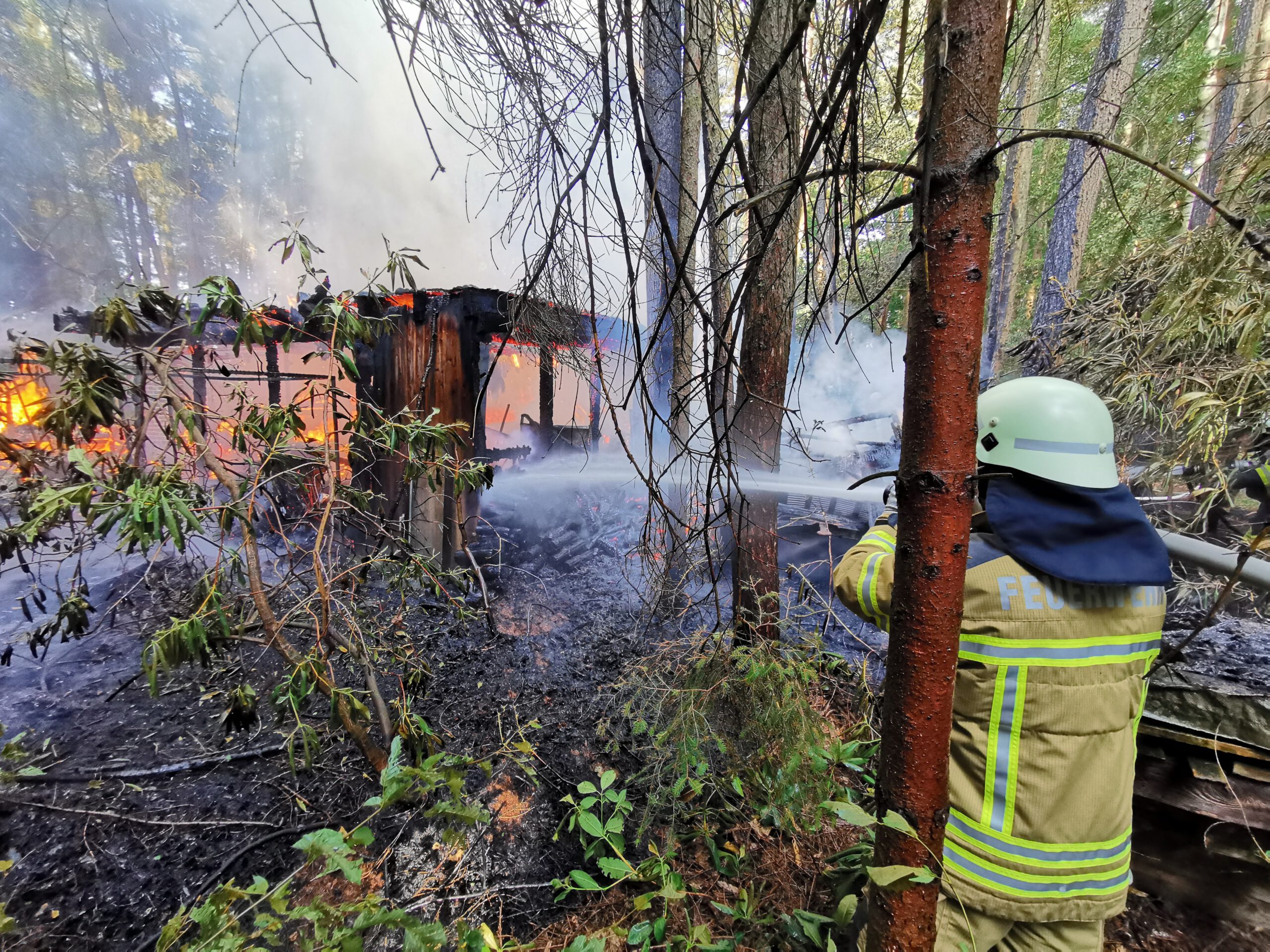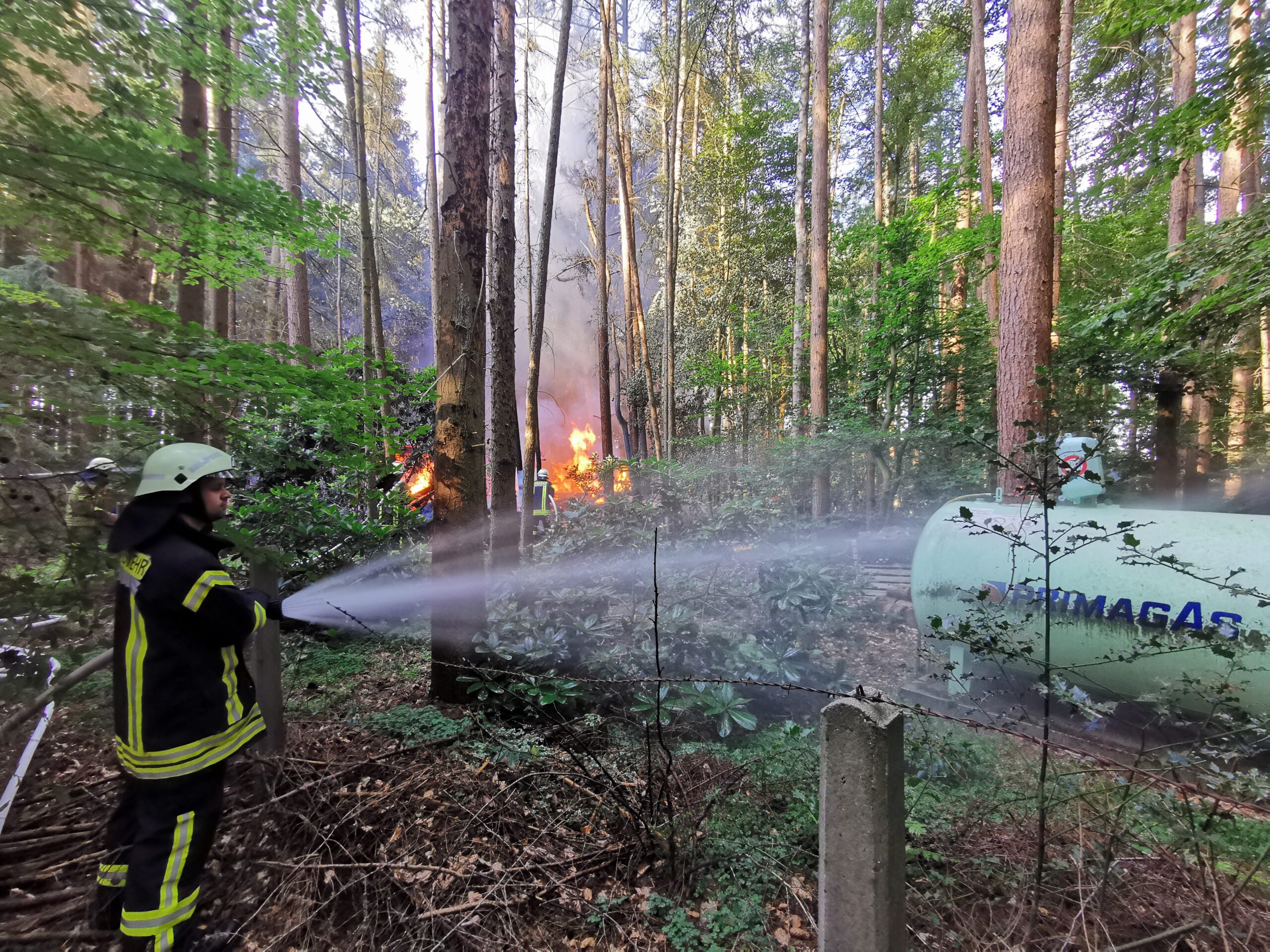 Am Samstagmorgen wurde der Leitstelle Bremerhaven eine starke Rauchentwicklung an der K16 in Ohlenstedt gemeldet. Aufgrund der aktuellen Waldbrandwarnstufe und mehrerer Anrufer wurden fünf der zehn Ortsfeuerwehren alarmiert. Die Einsatzkräfte aus Ohlenstedt, Freißenbüttel, Garlstedt, Hülseberg und Osterholz-Scharmbeck konnten schon bei Anfahrt die Meldung bestätigen, zusätzlich wurde das Alarmstichwort erhöht. In einem Waldstück stand ein Gebäude in Vollbrand und Griff auf die Vegetation über, eine Person wurde vermisst. Aufgrund von mehreren Durchzündungen von Gasflaschen war es den Einsatzkräften, unter der Einhaltung des Eigenschutzes, zunächst nur möglich einen Außenangriff durchzuführen und einen Flüssiggastank zu kühlen. Die vermisste Person konnte im Verlauf des Einsatzes an der Einsatzstelle angetroffen werden, so dass nun der Fokus ausschließlich auf der Brandbekämpfung lag. Nach ca. drei Stunden konnten die meisten Kräfte aus dem Einsatz entlassen und ein Waldbrand verhindert werden. Die Nachlöscharbeiten durch die Ortsfeuerwehr Ohlenstedt, Freißenbüttel und Garlstedt dauerten noch bis 12:30 Uhr an. Die Einsatzstelle wurde an die Polizei für die Brandursachenermittlung übergeben.
