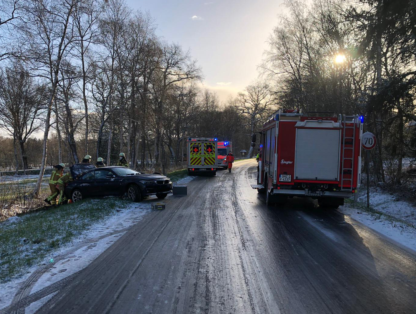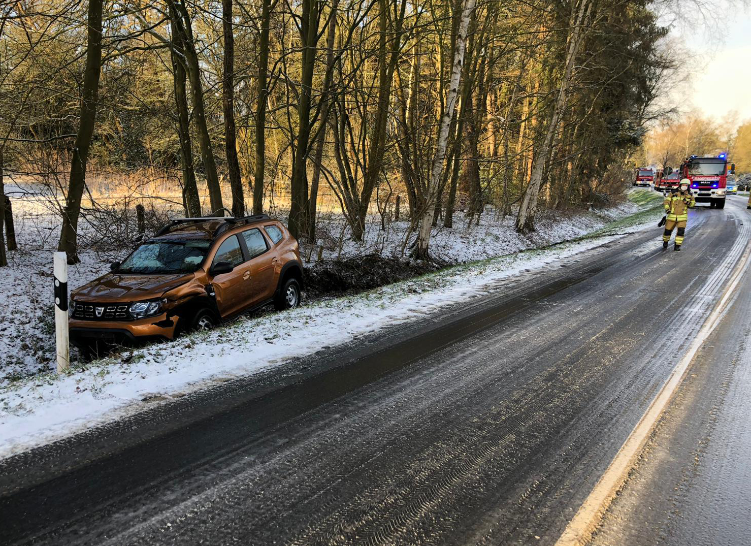 Die Ortsfeuerwehren Pennigbüttel und Teufelsmoor wurden heute Morgen zu einem Verkehrsunfall alarmiert. Witterungsbedingt kam es hier zu einer Kollision zwischen zwei Pkw. Trotz deren starker Beschädigung konnten glücklicherweise alle Insassen ihre Fahrzeuge eigenständig verlassen. Zwei Unfallbeteiligte mussten vom Rettungsdienst betreut werden und wurden zur Abklärung ins Krankenhaus gebracht. Die Feuerwehrkräfte stellten den Brandschutz her und sicherten gemeinsam mit der Polizei die Unfallstelle ab.