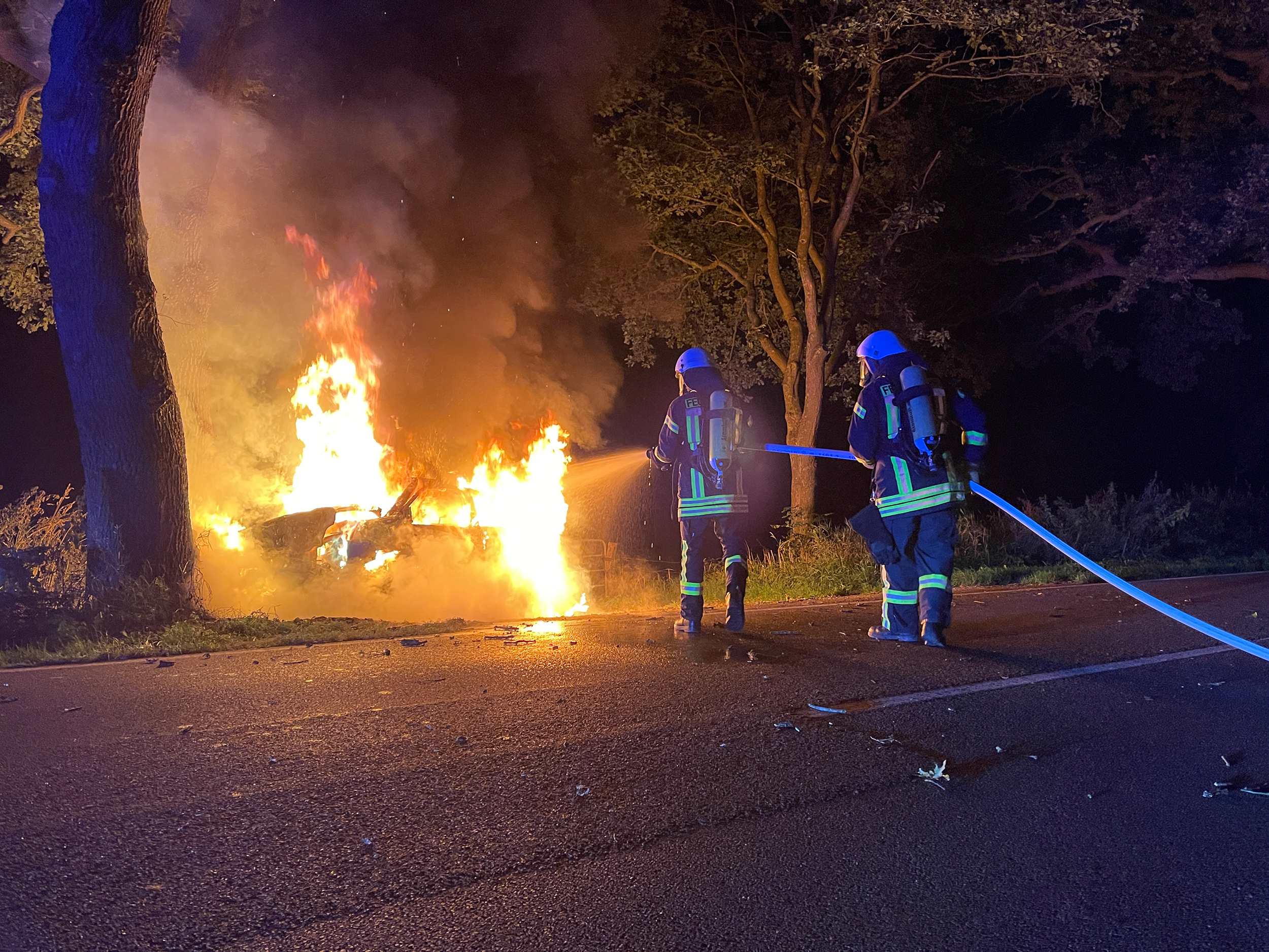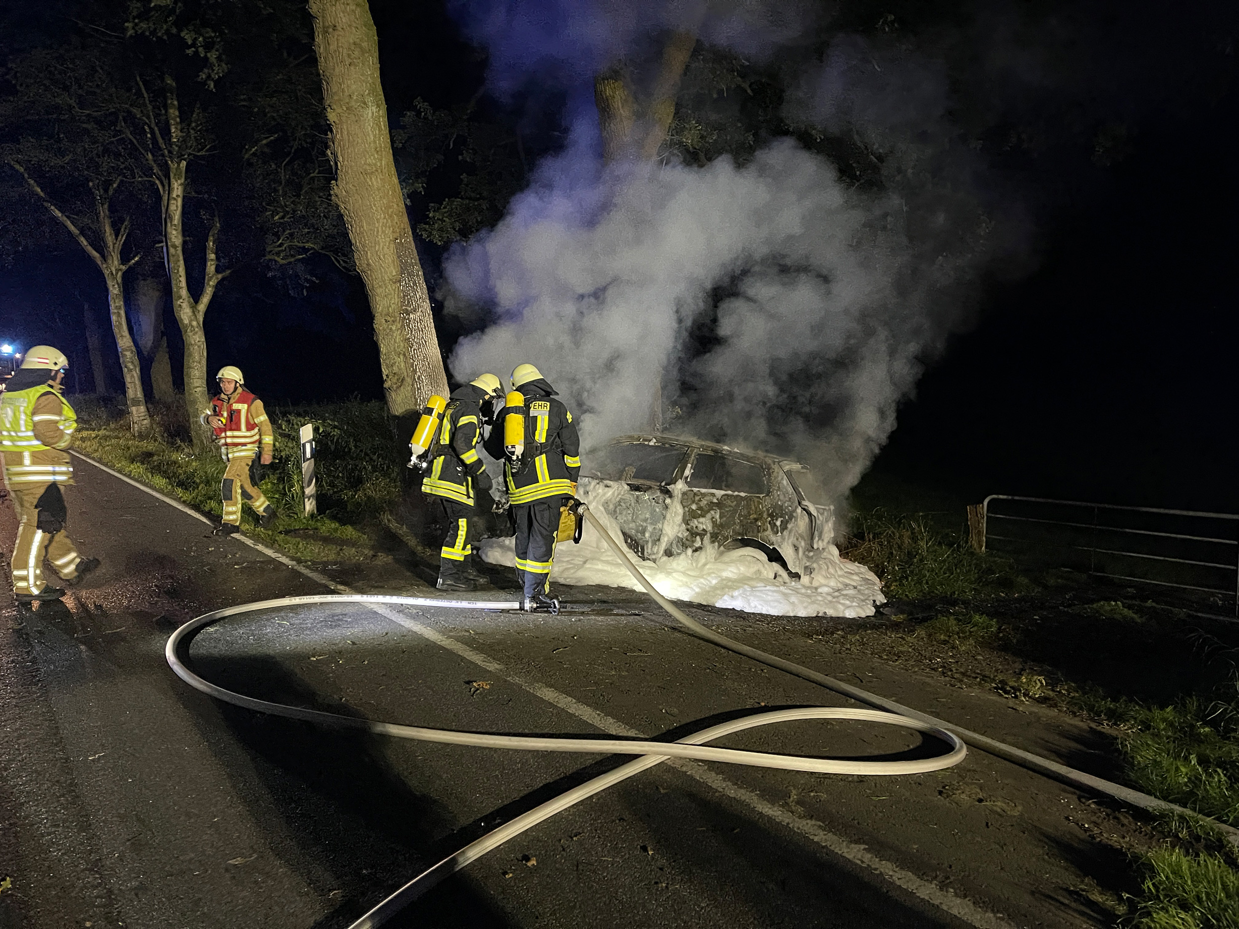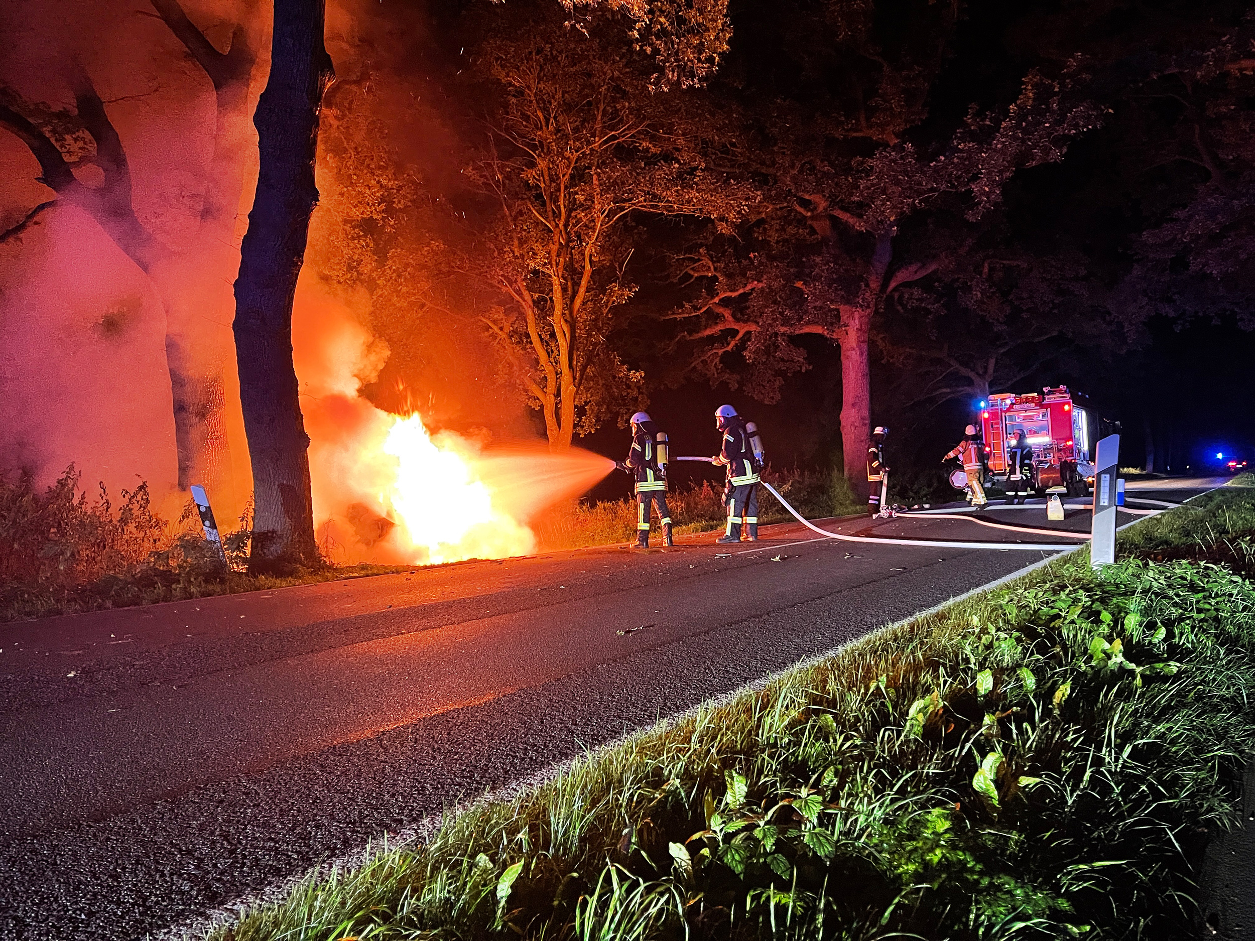 Am späten Abend geriet ein PKW auf der Westerbecker Straße in Fahrtrichtung Osterholz-Scharmbeck infolge einer Kollision mit einem Baum in Brand. Beim Eintreffen der alarmierten Ortsfeuerwehr Osterholz-Scharmbeck stand das Fahrzeug bereits in Vollbrand. Der Fahrer hatte sich eigenständig befreit und wurde bereits vom Rettungsdienst betreut. Ein Trupp unter Atemschutz dämmte die Flammen mit einem C-Rohr ein und verhinderte die Ausbreitung des Feuers auf die umstehenden Bäume. Um den Brand nachhaltig zu ersticken, musste anschließend Schaum eingesetzt werden. Dreißig Minuten nach Eintreffen konnte „Feuer aus“ gemeldet werden. Anschließend wurde die Einsatzstelle der Polizei übergeben, die während der Löscharbeiten die Westerbecker Straße gesperrt hatte.