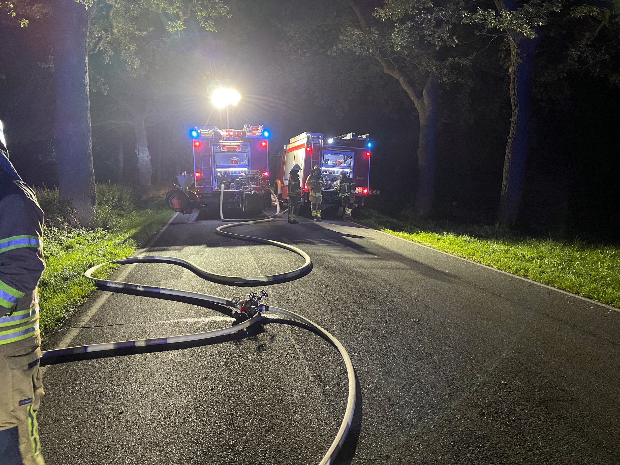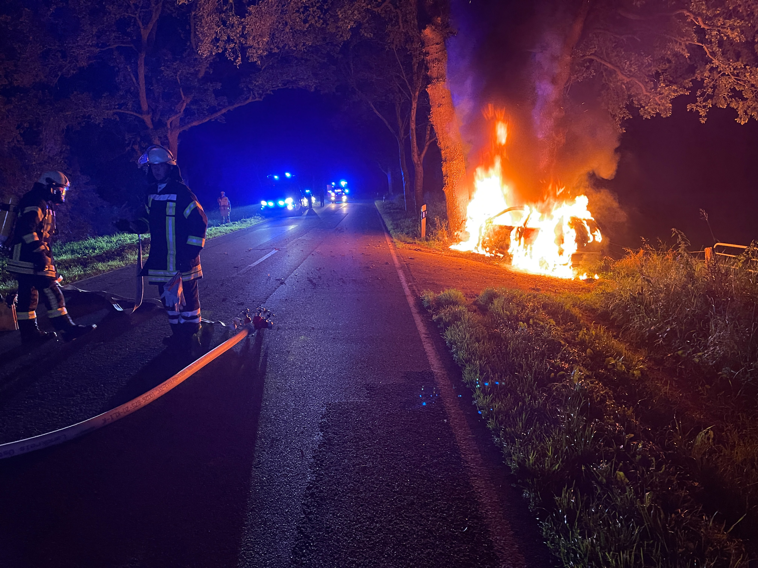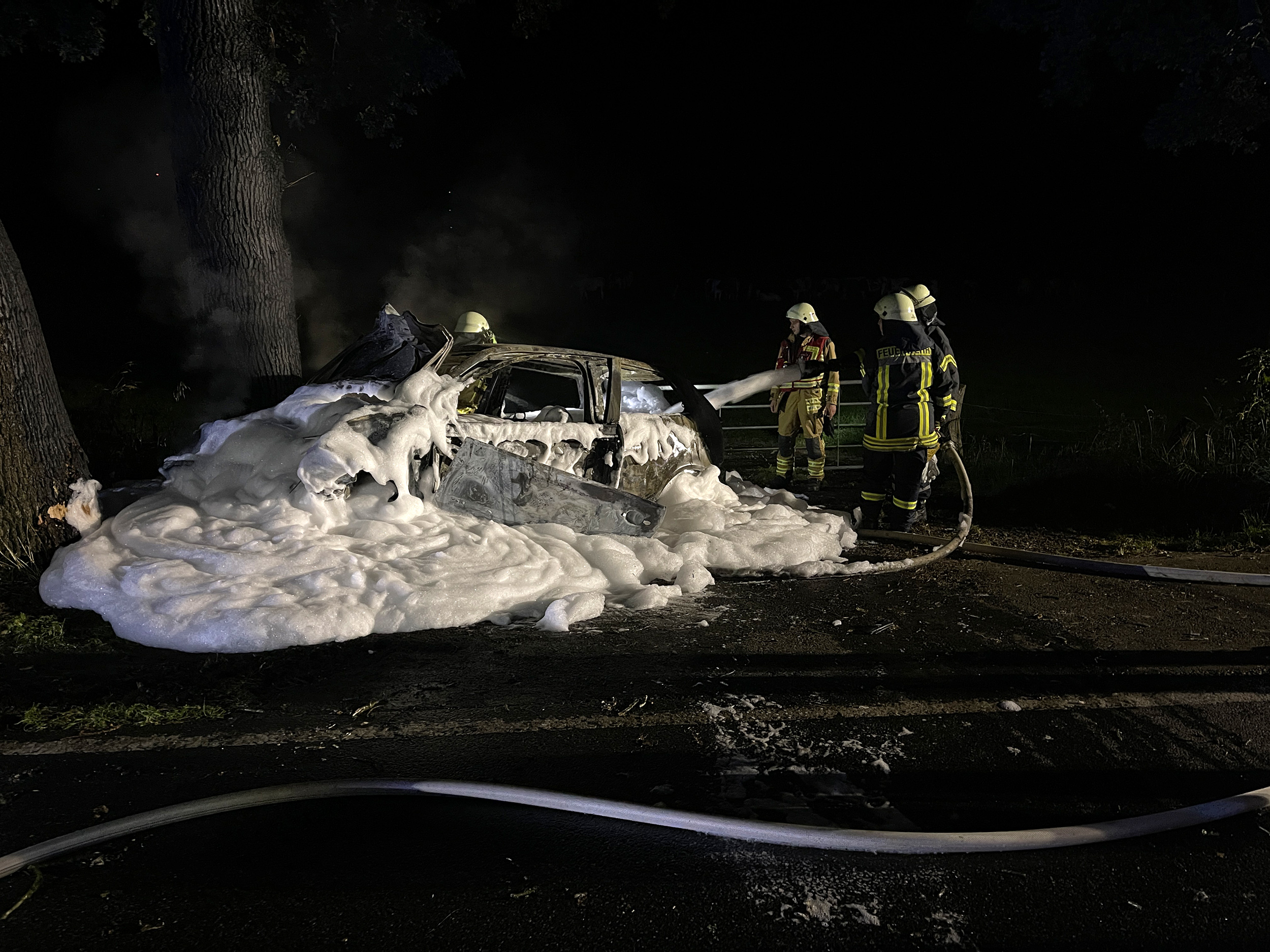 Am späten Abend geriet ein PKW auf der Westerbecker Straße in Fahrtrichtung Osterholz-Scharmbeck infolge einer Kollision mit einem Baum in Brand. Beim Eintreffen der alarmierten Ortsfeuerwehr Osterholz-Scharmbeck stand das Fahrzeug bereits in Vollbrand. Der Fahrer hatte sich eigenständig befreit und wurde bereits vom Rettungsdienst betreut. Ein Trupp unter Atemschutz dämmte die Flammen mit einem C-Rohr ein und verhinderte die Ausbreitung des Feuers auf die umstehenden Bäume. Um den Brand nachhaltig zu ersticken, musste anschließend Schaum eingesetzt werden. Dreißig Minuten nach Eintreffen konnte „Feuer aus“ gemeldet werden. Anschließend wurde die Einsatzstelle der Polizei übergeben, die während der Löscharbeiten die Westerbecker Straße gesperrt hatte.