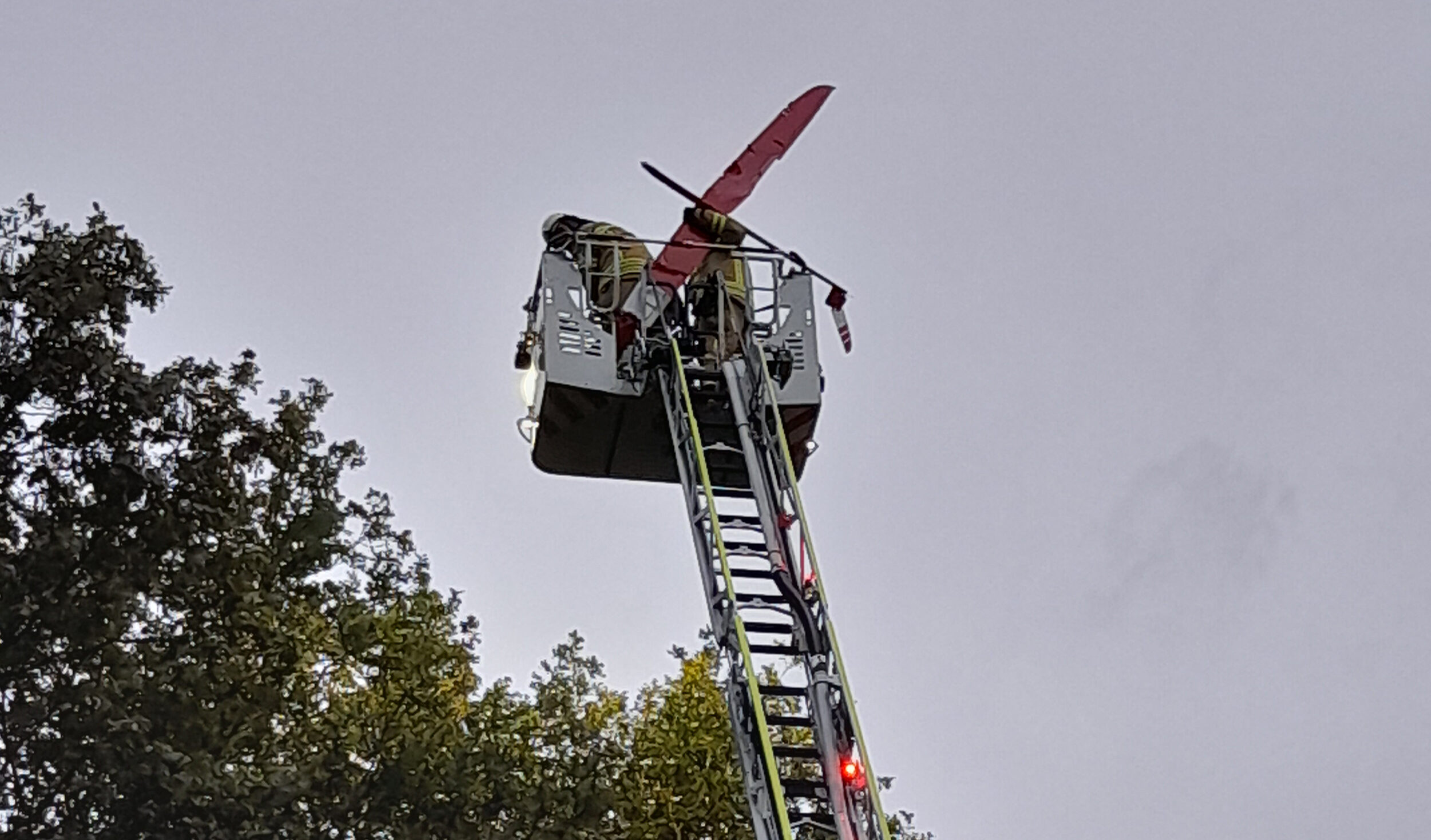 Zu einem eher ungewöhnlichen Hilfeleistungseinsatz wurde die Ortsfeuerwehr Osterholz-Scharmbeck alarmiert. Vom Westerbecker Modellflugplatz hatte sich ein mit 3,60m Spannweite stattliches Modell selbstständig gemacht. Nach Aussage des Besitzers hatte im Flug die Steuerung versagt. Der Flieger kollidierte in rund 10m Höhe mit einem Baum, hing nun über der Westerbecker Straße und drohte auf diese herab zu fallen. Der Eigentümer alarmierte die Polizei und diese anschließend die Feuerwehr. Mit Drehleiter und einem Begleitfahrzeug zur Absicherung rückten die Einsatzkräfte zur „Absturzstelle“ aus. Aufgrund des dichten Verkehrs musste durch die Polizei für die Bergung kurzfristig die Straße gesperrt werden. Das Modell konnte dann zügig aus der Baumkrone befreit und wieder an den Besitzer übergeben werden. Danach rückten die Kräfte wieder ein.