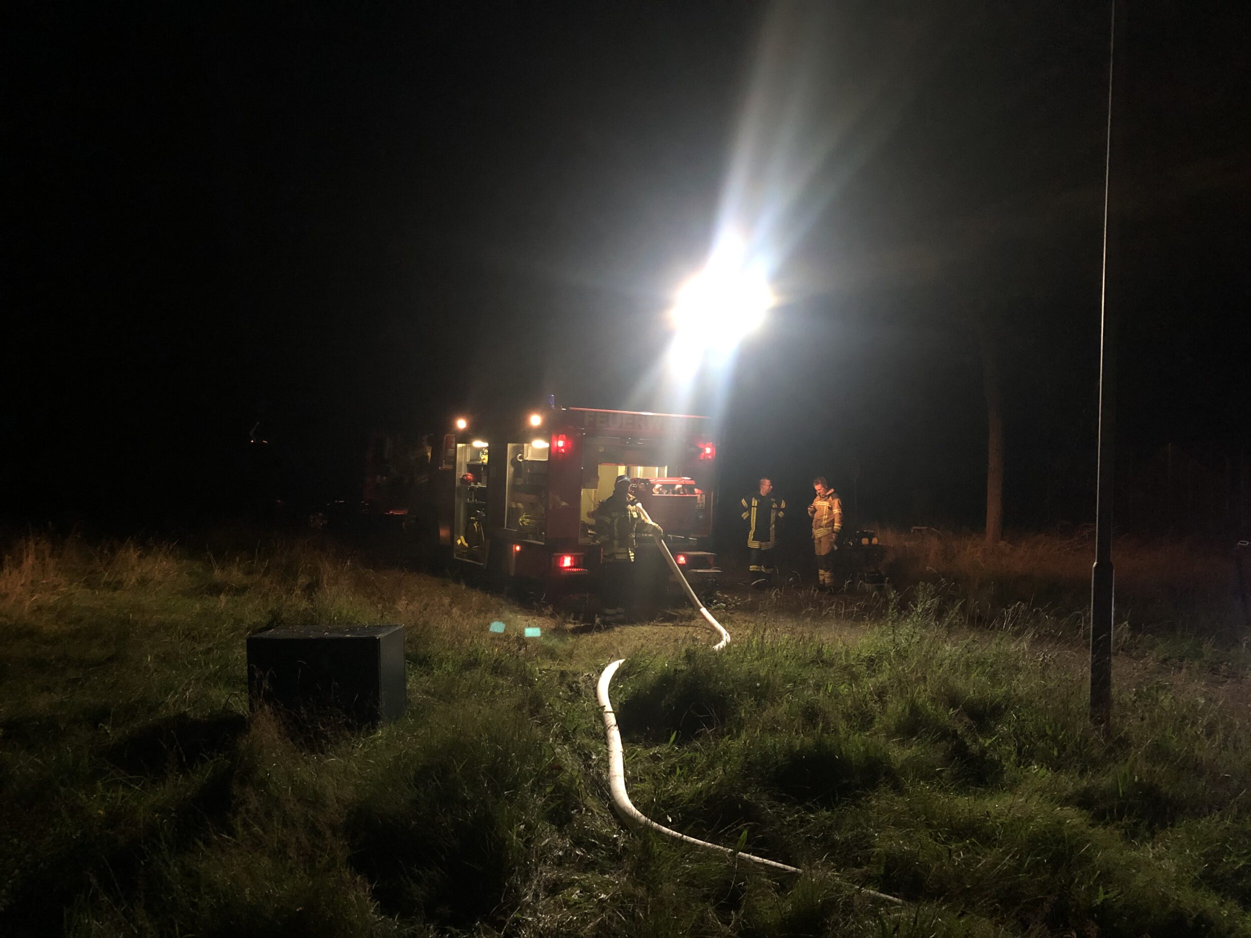 Zusätzlich wurde ein Löschwasserangriff aufgebaut und ausgeführt.  Nach Abschluss der Übung wurde das Gebäude mit Hilfe eines Lüfters entraucht und alle benutzen Einsatzgeräte wieder ordnungsgemäß ins Fahrzeug verstaut.  Um 21:15 wurde die Einsatzübung beendet und die Rückfahrt zum Feuerwehrhaus Heilshorn angetreten.