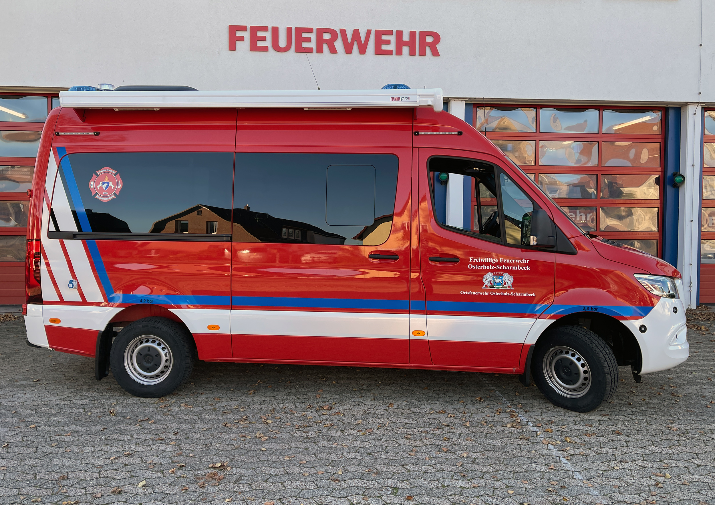 Nach über zwei Jahren konnte die Ortsfeuerwehr Osterholz-Scharmbeck endlich ihren lang erwarteten Einsatzleitwagen in Betrieb nehmen. Ursprünglich hatte das neue Spezialfahrzeug bereits Anfang 2019 seinen betagten Vorgänger ablösen sollen, als dieser betriebsbedingt stillgelegt werden musste. Durch den Konkurs der beauftragten Ausbaufirma kam der Zeitplan für das neue Fahrzeug allerdings komplett durcheinander. So behalf sich die Ortsfeuerwehr zwischenzeitlich damit, dass das Mehrzweckfahrzeug vorübergehend als Einsatzleitwagen genutzt werden musste. Dies ist nun nicht mehr notwendig. Der 190 PS starke Mercedes Sprinter wurde am 27.10. durch eine Delegation der Ortsfeuerwehr von der Ausbaufirma in die Heimstraße überführt und dort durch die Feuerwehrleute erst einmal ausgiebig begutachtet.
