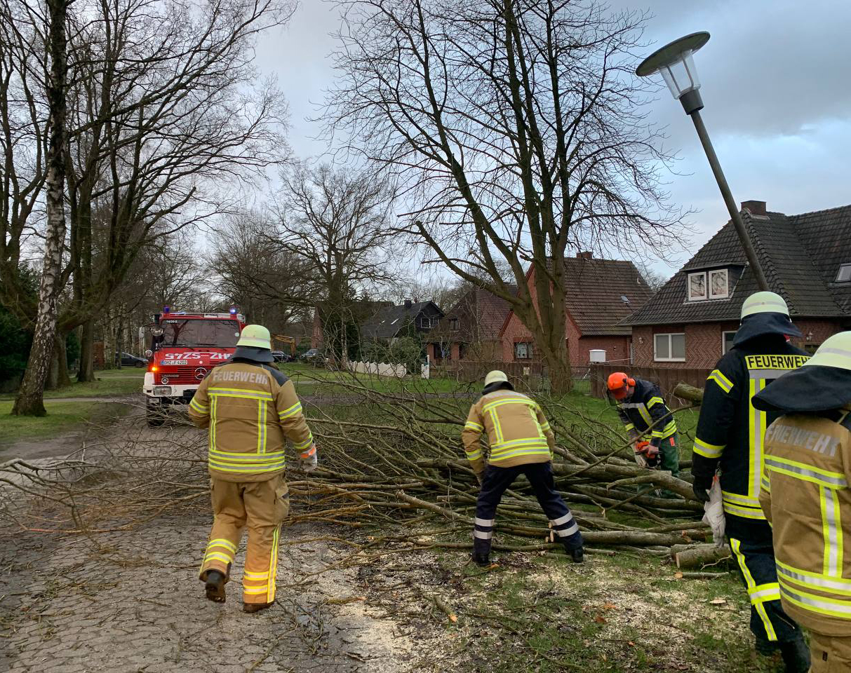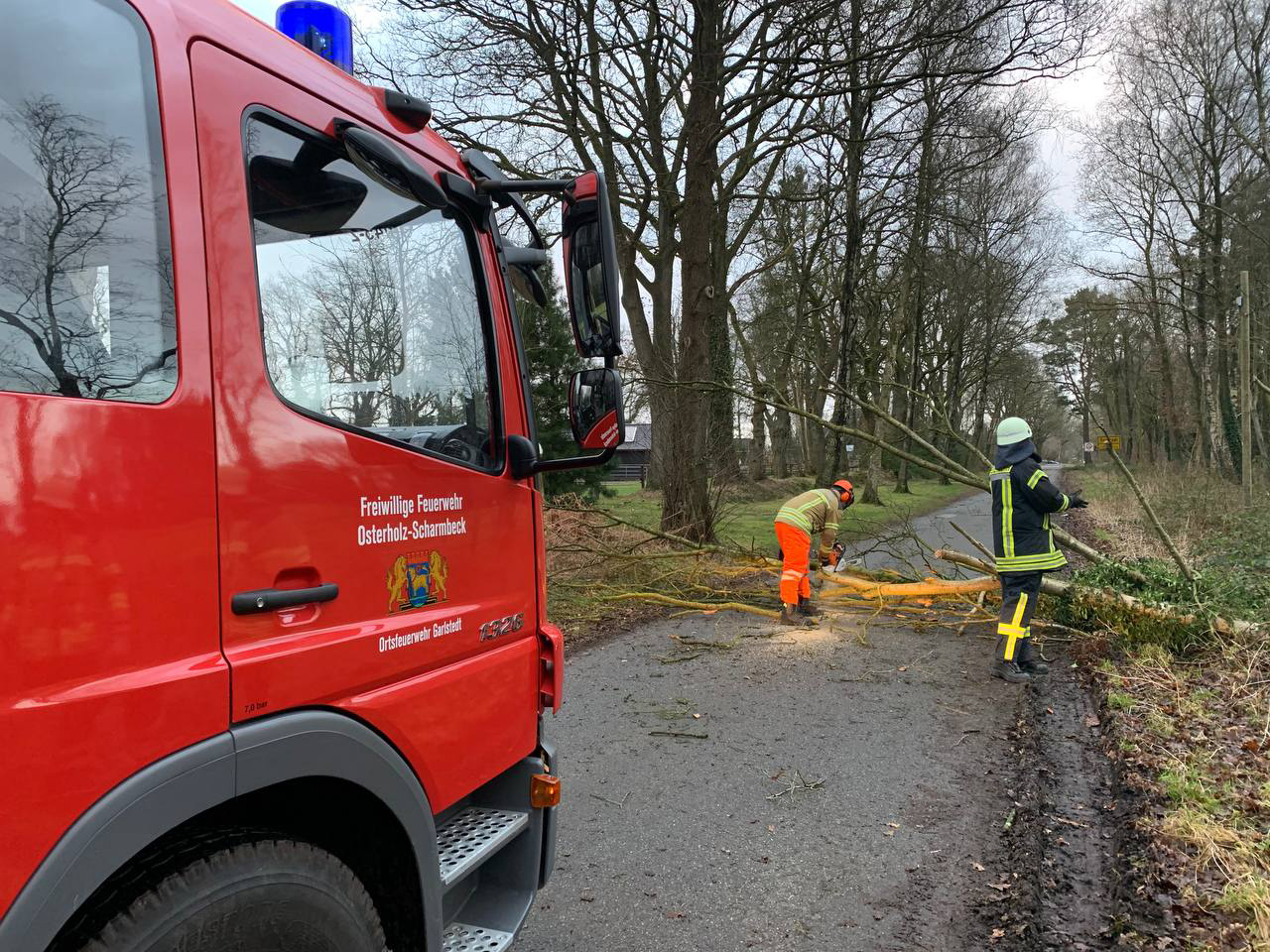 Am Samstagabend rückte die Ortsfeuerwehr Osterholz-Scharmbeck zu Sturmschäden an der Langen Straße und am Weyerdamm aus. Zusätzlich wurde die Drehleiter zur Unterstützung nach Vollersode angefordert, kam aber schlussendlich nicht zum Einsatz. Die Ortsfeuerwehr Garlstedt wurde im Ohlenstedter Weg benötigt, die Kollegen aus Sandhausen rückten in den Heuweg aus. Zweimal mussten die Einsatzkräfte aus Pennigbüttel tätig werden: jeweils an der Teufelsmoorstraße und im Bereich Altenbrück mussten Bäume beseitigt werden.