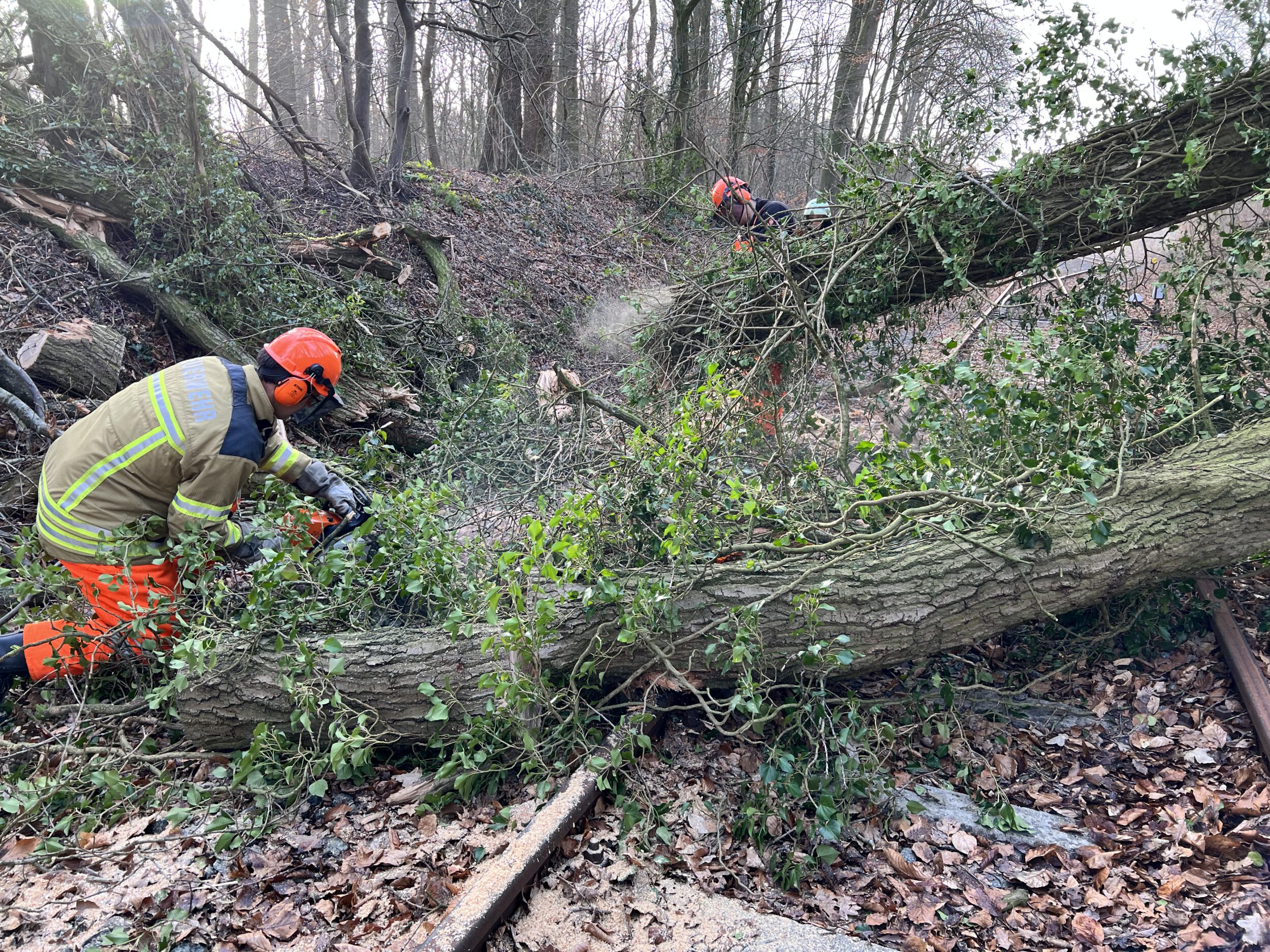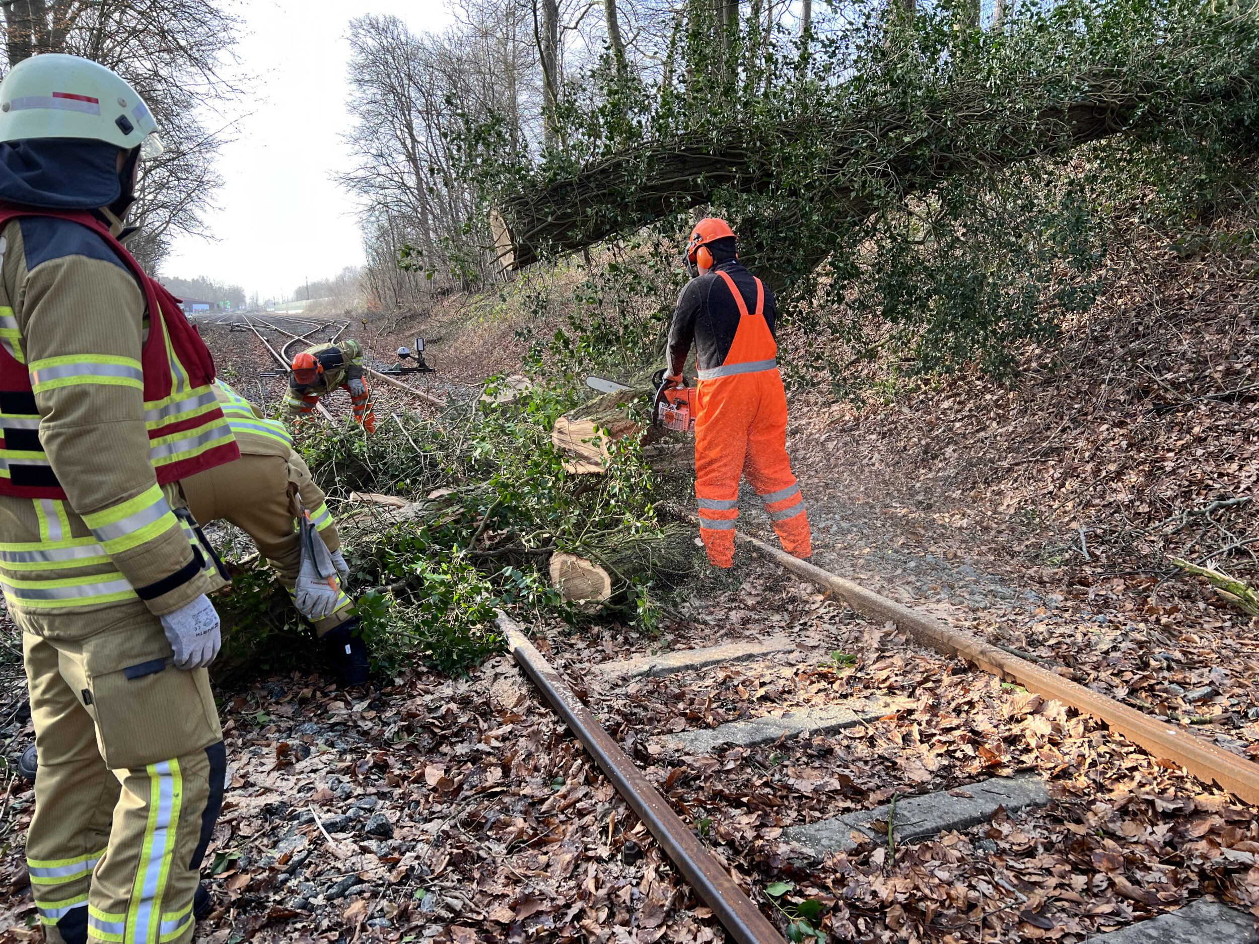 Um 10:55 Uhr war dann nochmals die Ortsfeuerwehr Osterholz-Scharmbeck im Einsatz. Ein Baum blockierte ein Eisenbahnnebengleis am Tinzenberg. Nachdem Zugverkehr auf der Strecke ausgeschlossen werden konnte, zerlegten die Einsatzkräfte auch diesen Baum und räumten die Gleise.
