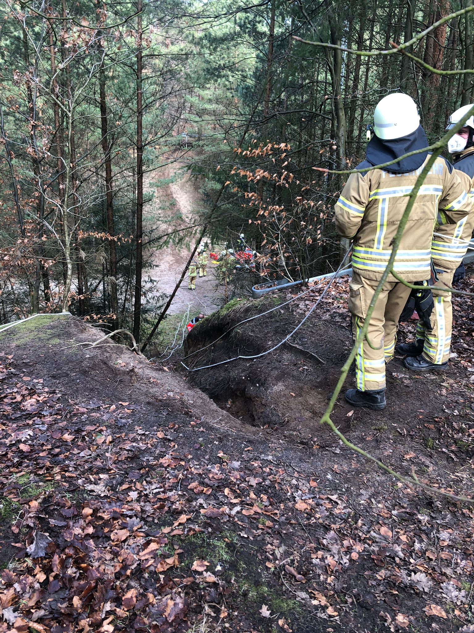 Ein Radfahrer war einen Abhang heruntergestürzt. Aufgrund des Verletzungsmusters der Person musste diese möglichst schonend gerettet werden. Dazu wurde die Person auf eine Vakuummatratze umgelagert und musste anschließend einen Hang hinaufgetragen werden. Die Feuerwehr unterstützte beim Tragen und sicherte mit Leinen den Aufstieg. Danach wurde die Person in den Rettungswagen verladen und zum Rettungshubschrauber gefahren. Die Feuerwehr unterstütze beim Umladen in den Hubschrauber, der die Person anschließend in ein Krankenhaus flog.