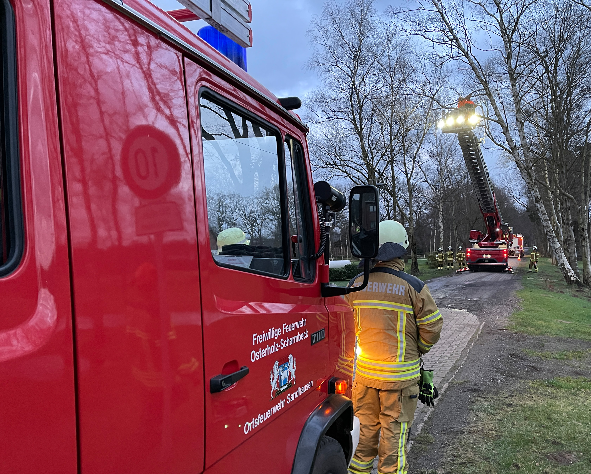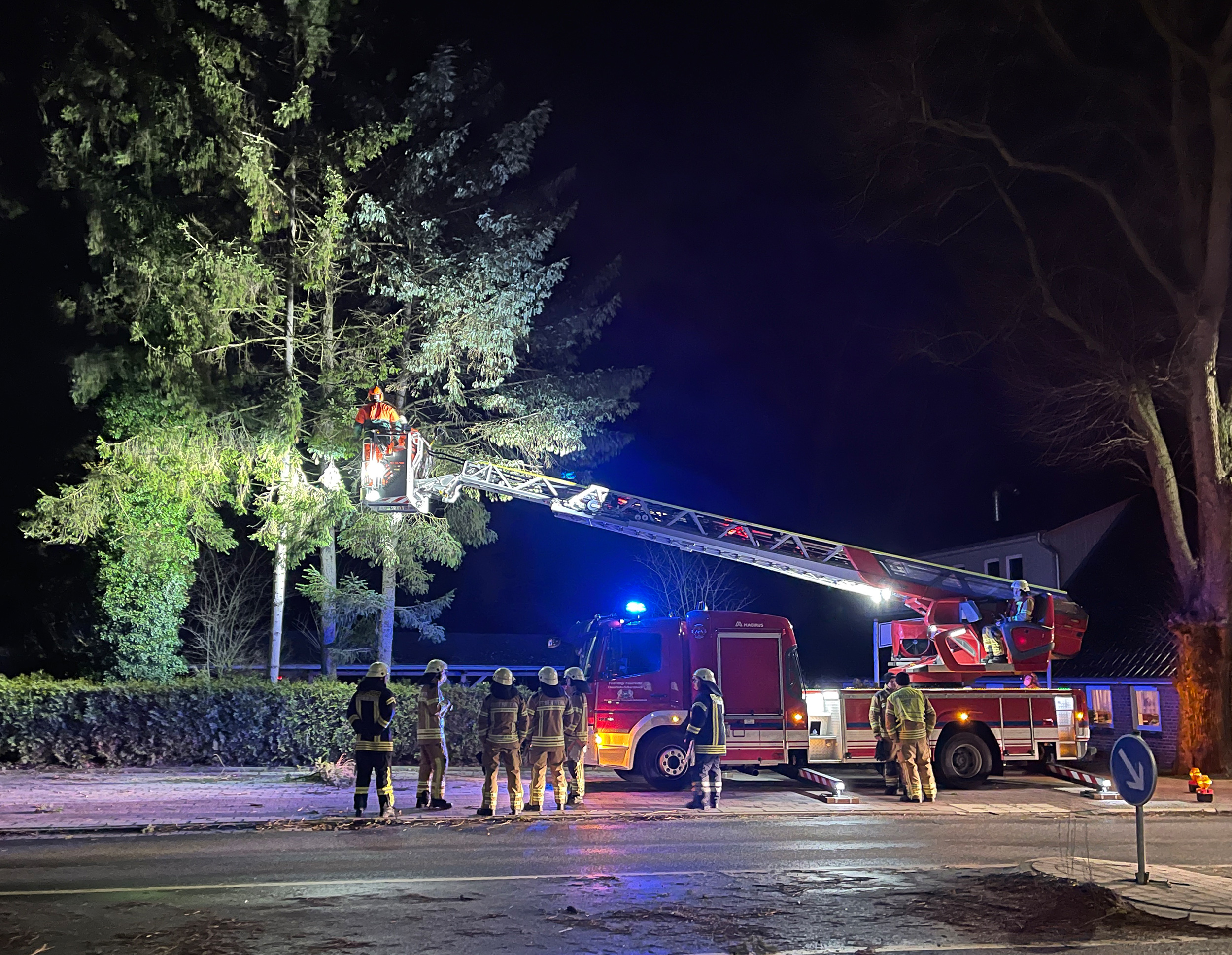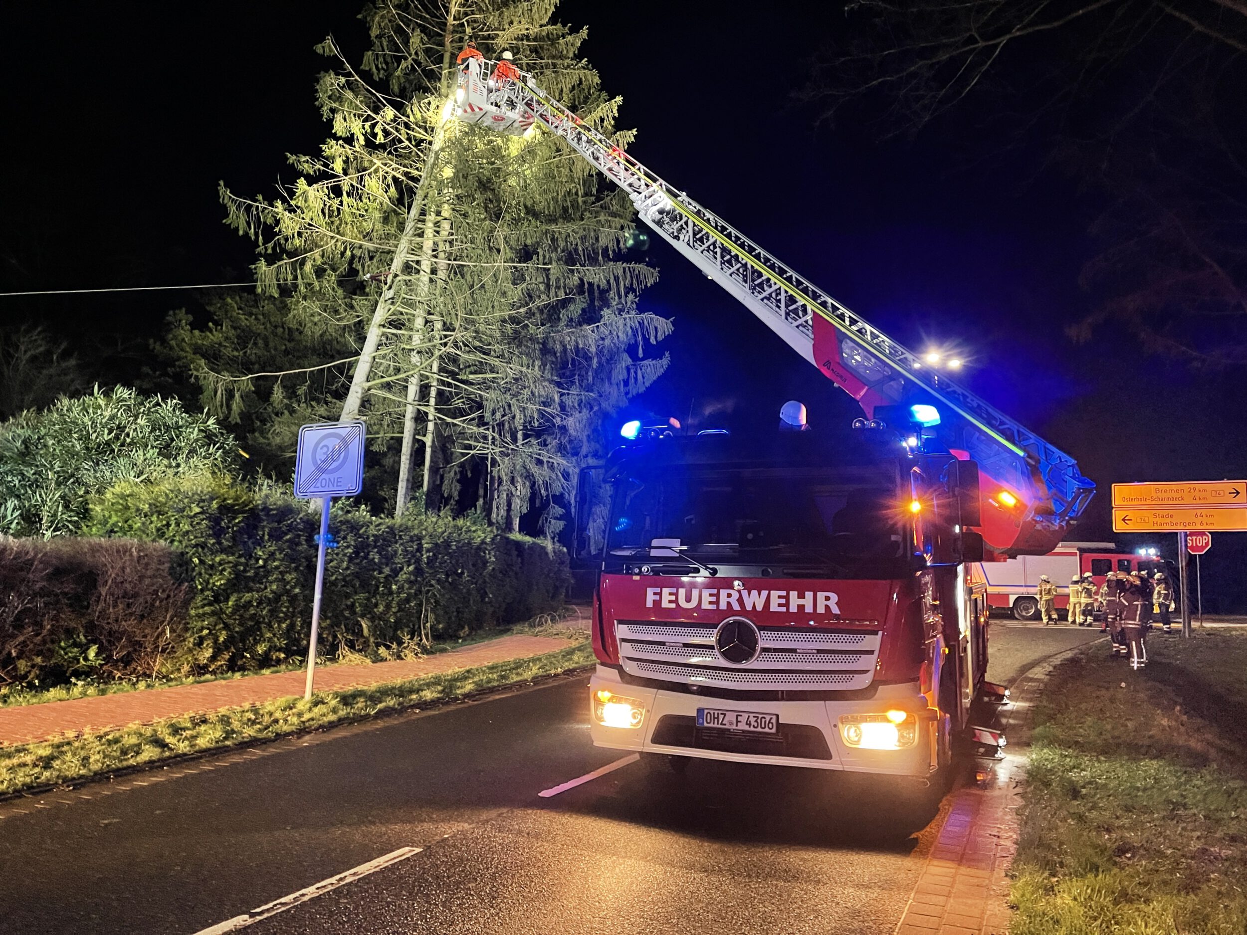 Den Abschluss der Sturmeinsätze bildeten zwei Alarmierungen für die Ortsfeuerwehr Sandhausen. Mit Unterstützung der Drehleiter aus Osterholz Scharmbeck mussten beschädigte Bäume in der Altendammer Straße sowie an der Myhler Straße abgetragen werden.
