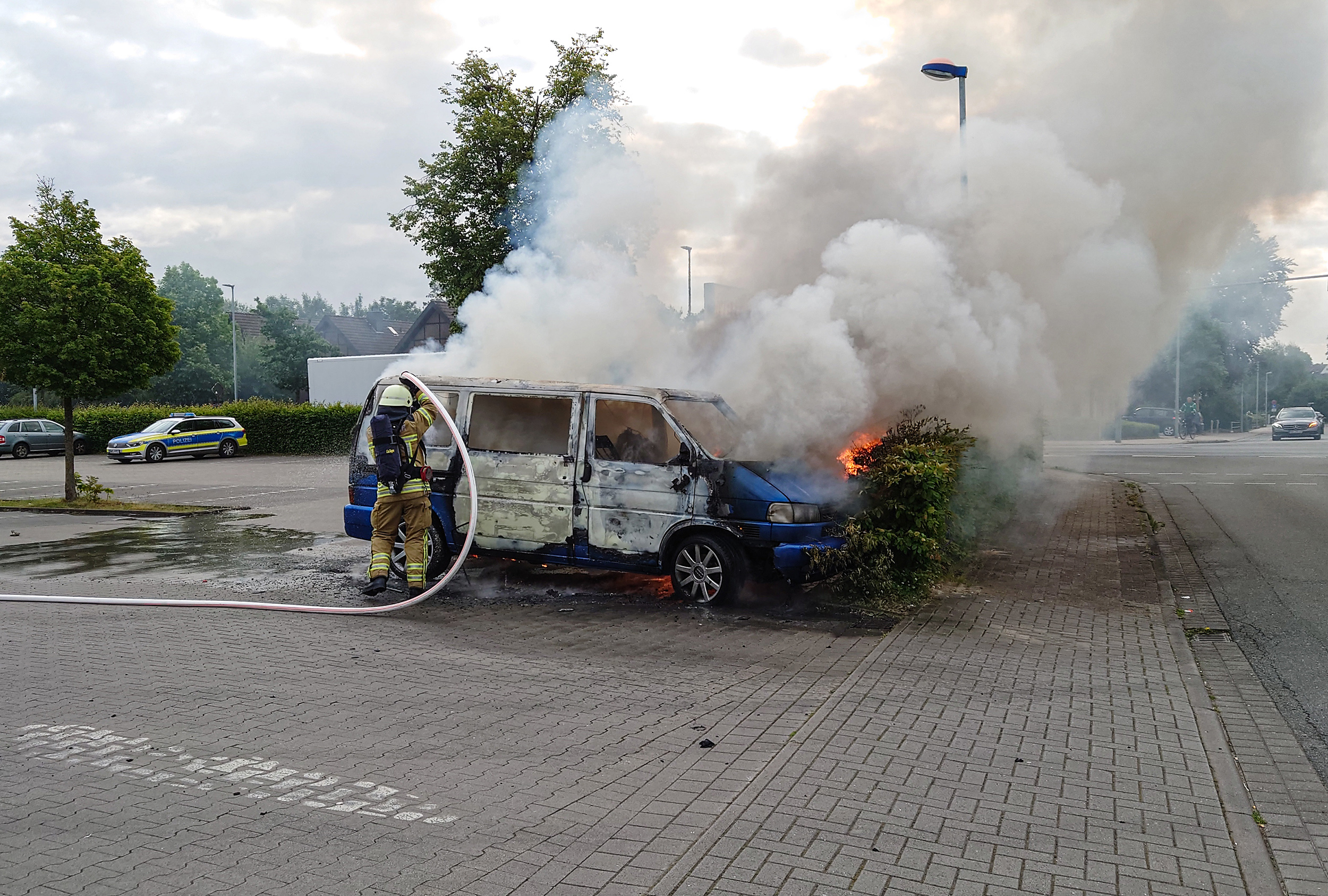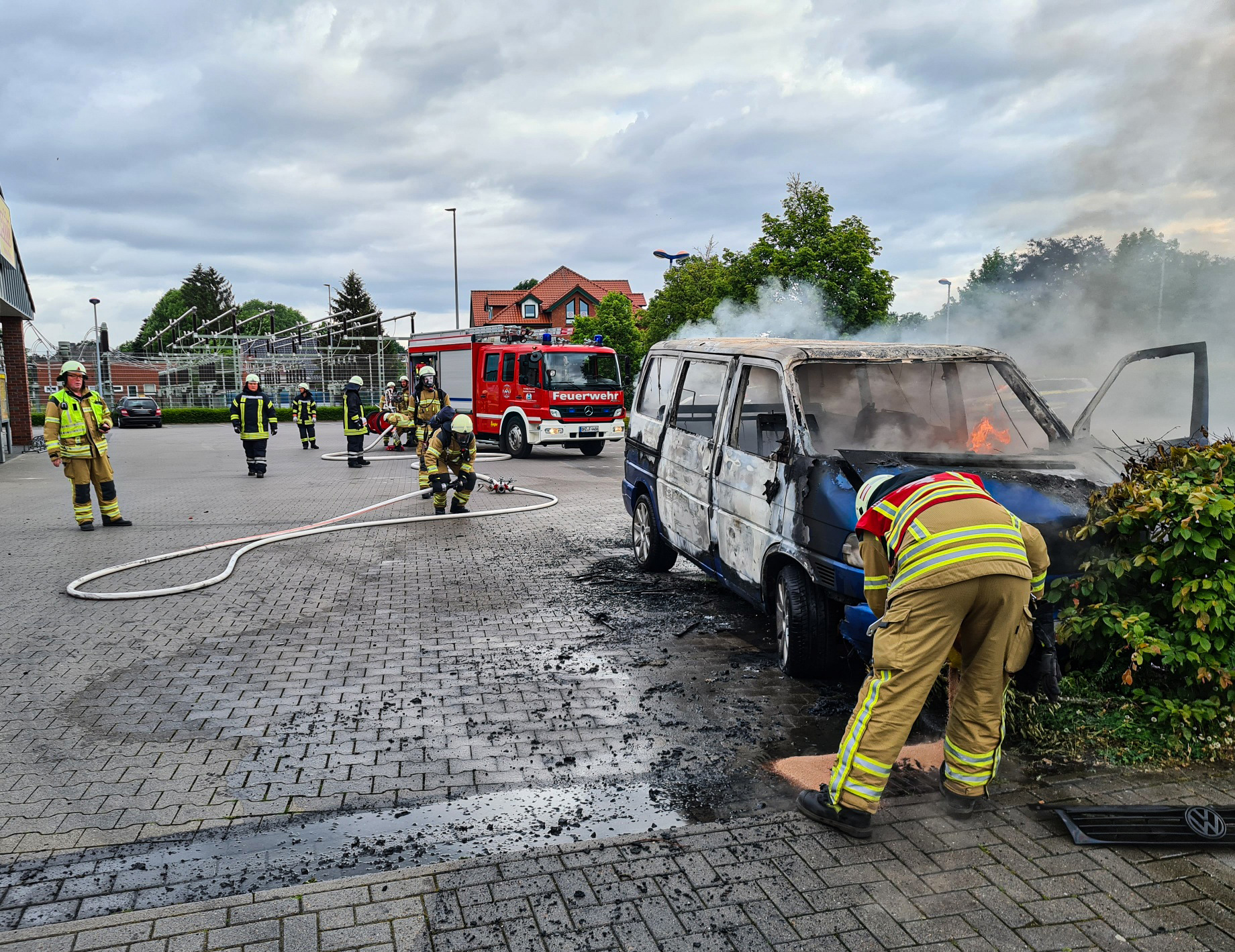 Zu einem Pkw Brand auf dem Parkplatz eines Supermarktes in der Loger Straße wurden heute die Feuerwehren Osterholz-Scharmbeck und Scharmbeckstotel alarmiert. Bei Eintreffen der Osterholzer Einsatzkräfte stand ein VW Kleinbus in der Nähe einer Hecke in Vollbrand. Zügig ging ein Trupp unter Atemschutz vor und löschte das Feuer zunächst mit Wasser sowie anschließend mit Schaummittel. Die Einsatzkräfte aus Scharmbeckstotel brauchten nicht mehr aktiv in den Einsatz einzugreifen und konnten wieder einrücken.