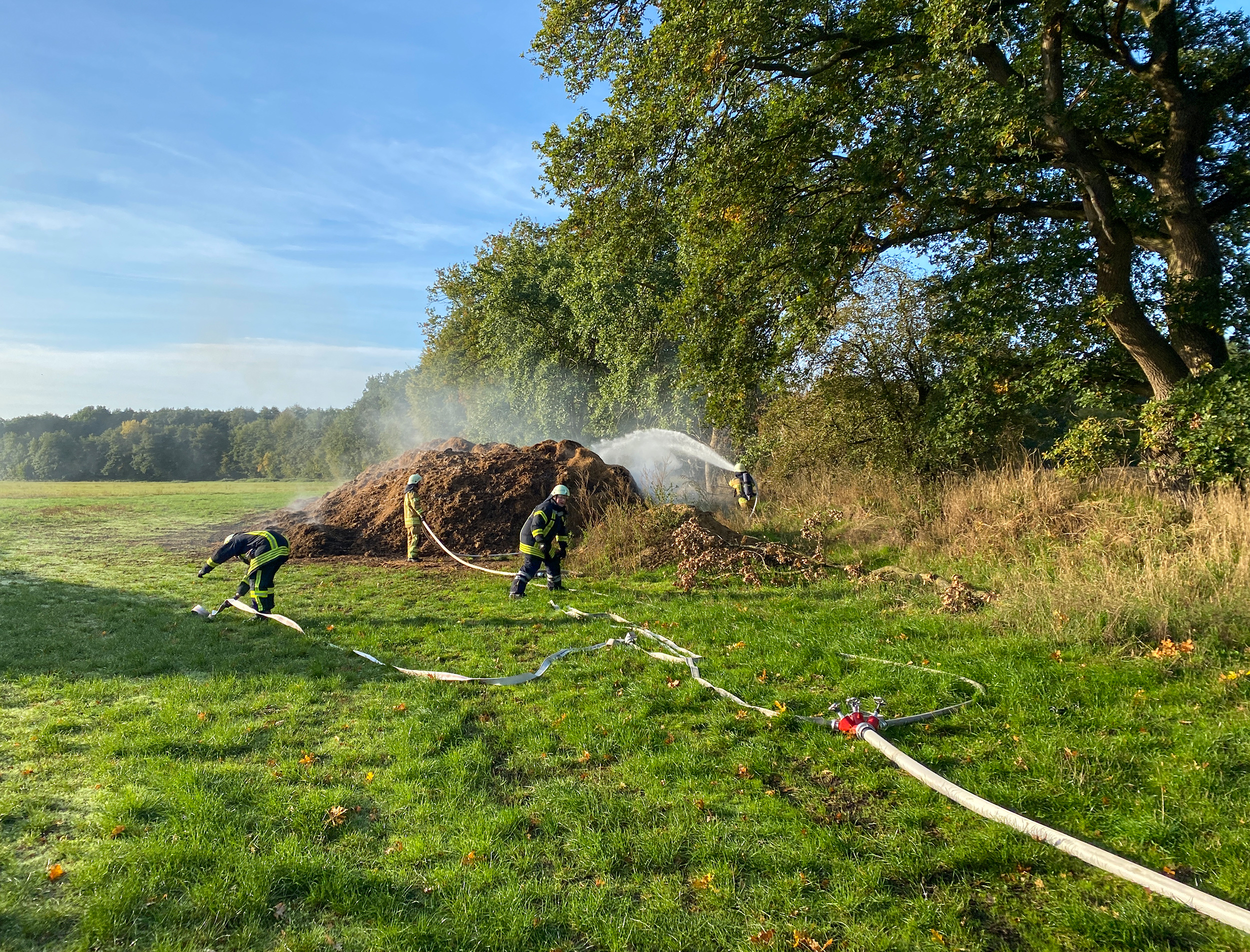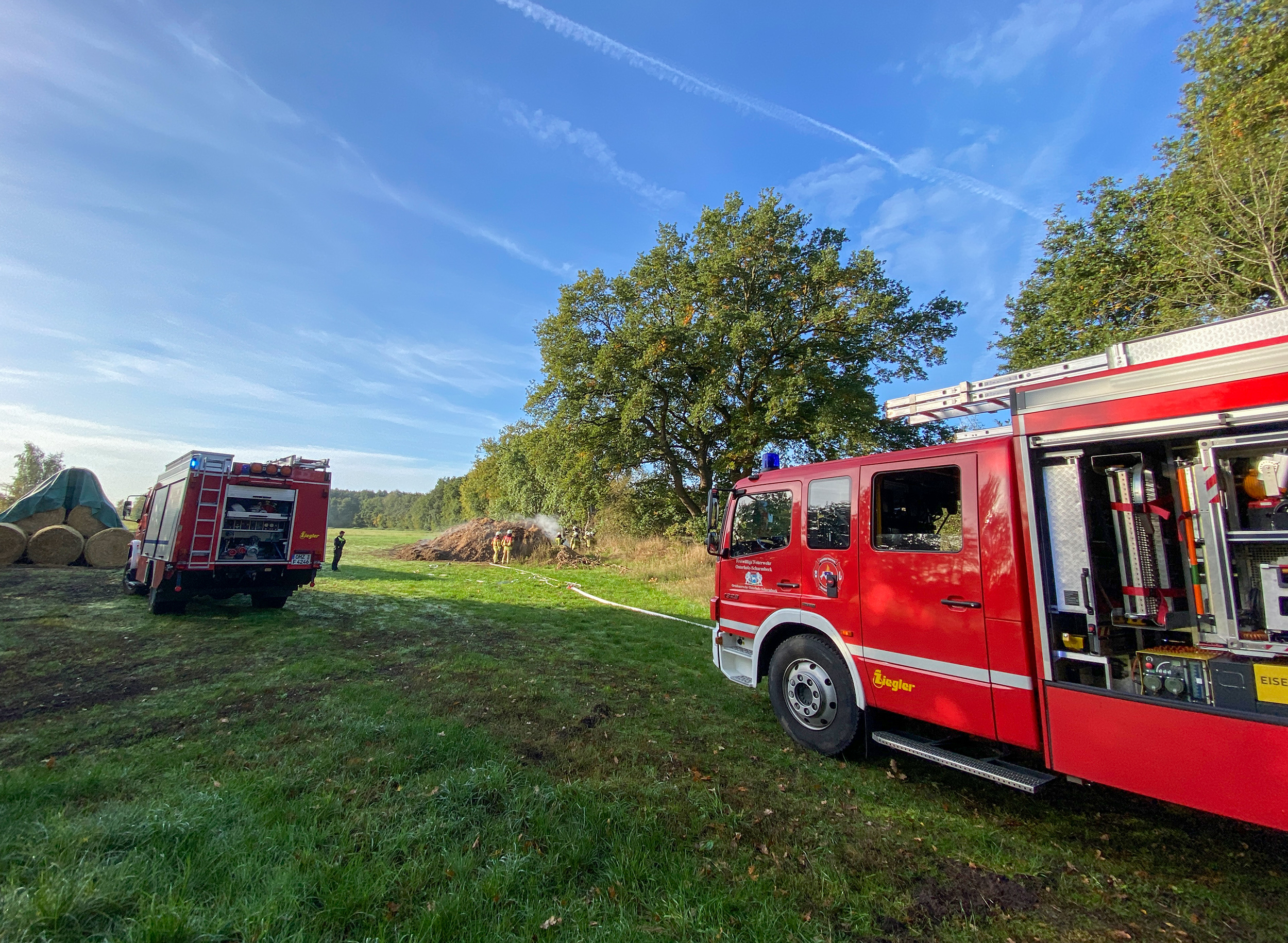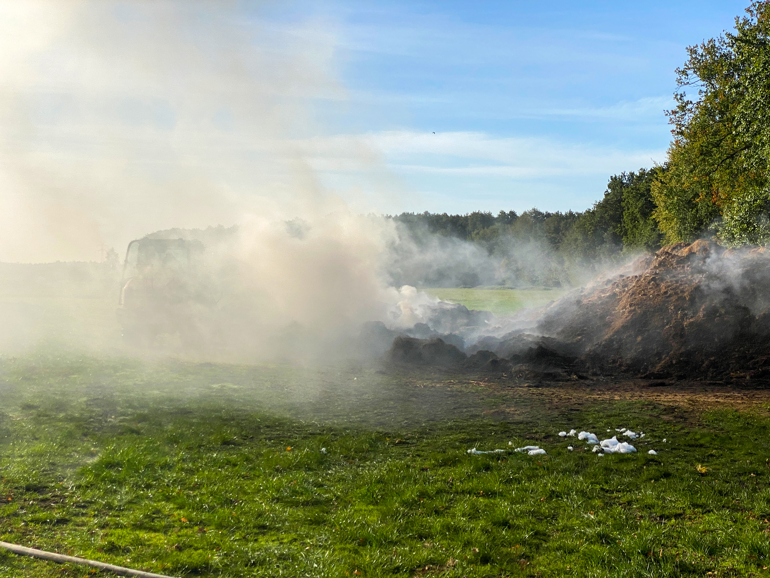 Nur kurz nachdem die Einsatzkräfte der Ortsfeuerwehr Osterholz-Scharmbeck von der zuvor geleisteten Tragehilfe zurückgekehrt waren, erfolgte die nächste Alarmierung. Im Bereich der Kläranlage in Lintel wurde ein brennender Misthaufen gemeldet. Vor Ort bestätigte sich die Lage. Ein ca. 5x5m großer Haufen entwickelte zunehmend Rauch. Ein Trupp unter Atemschutz begann mit ersten Löschmaßnahmen. Zusätzlich wurde begonnen, den Haufen mit Hilfe eines Radladers auseinander zu ziehen um alle Glutnester erreichen zu können. Da die Löschwasserversorgung an der Einsatzstelle schwierig war, wurde das Tanklöschfahrzeug der Ortsfeuerwehr Scharmbeckstotel nachalarmiert um die beiden wasserführenden Fahrzeuge aus Osterholz-Scharmbeck zu unterstützen. Mittels Pendelverkehr wurde das Löschwasser an die Einsatzstelle gebracht. Nachdem der Haufen abgelöscht und mittels Wärmebildkamera kontrolliert war, konnte alle Einheiten wieder einrücken.