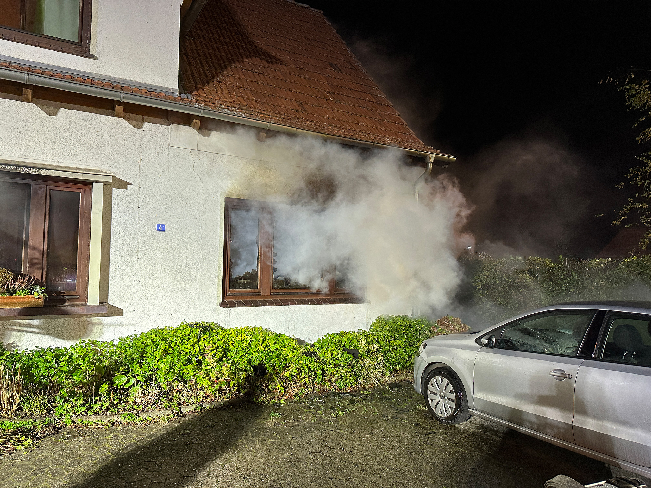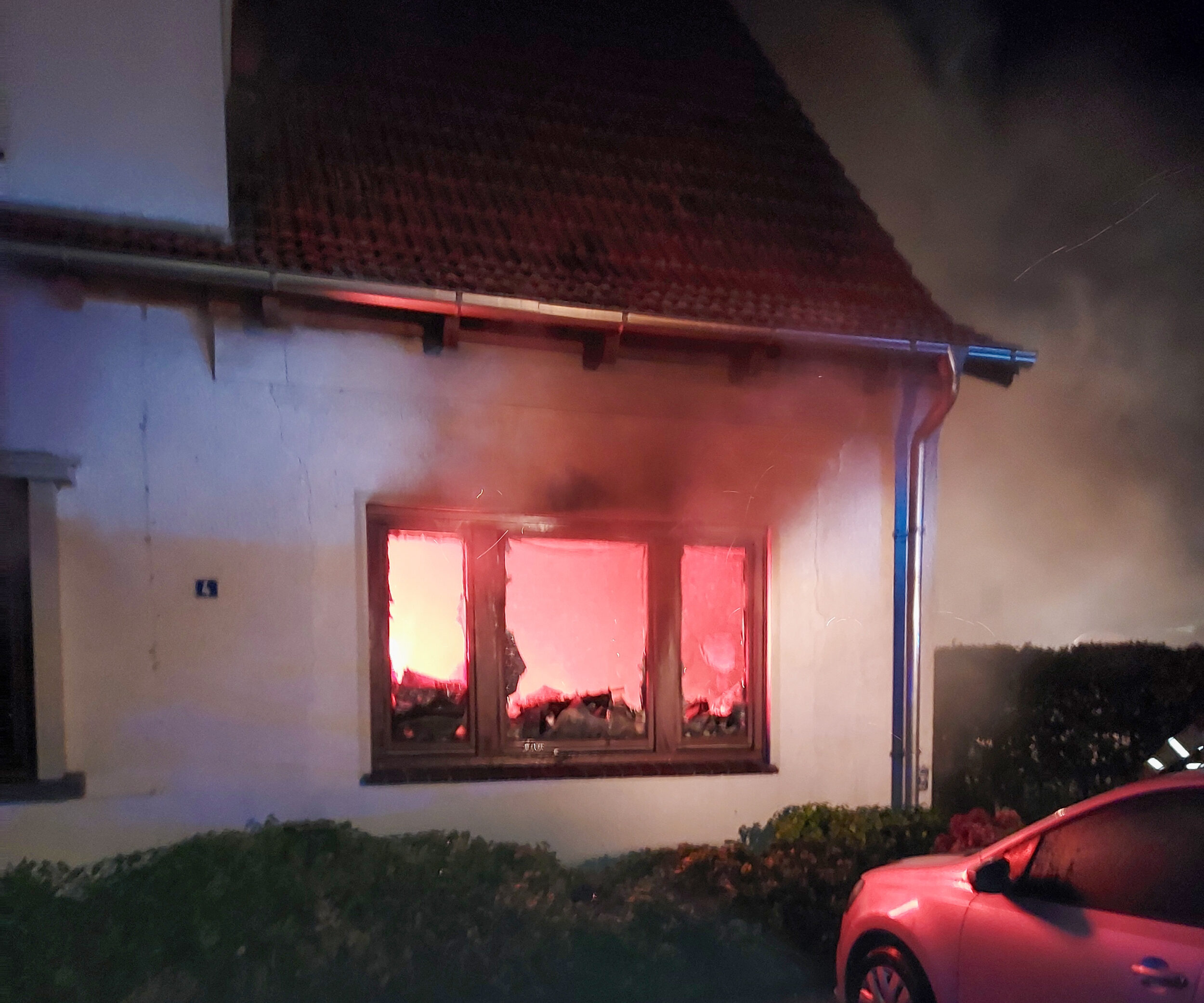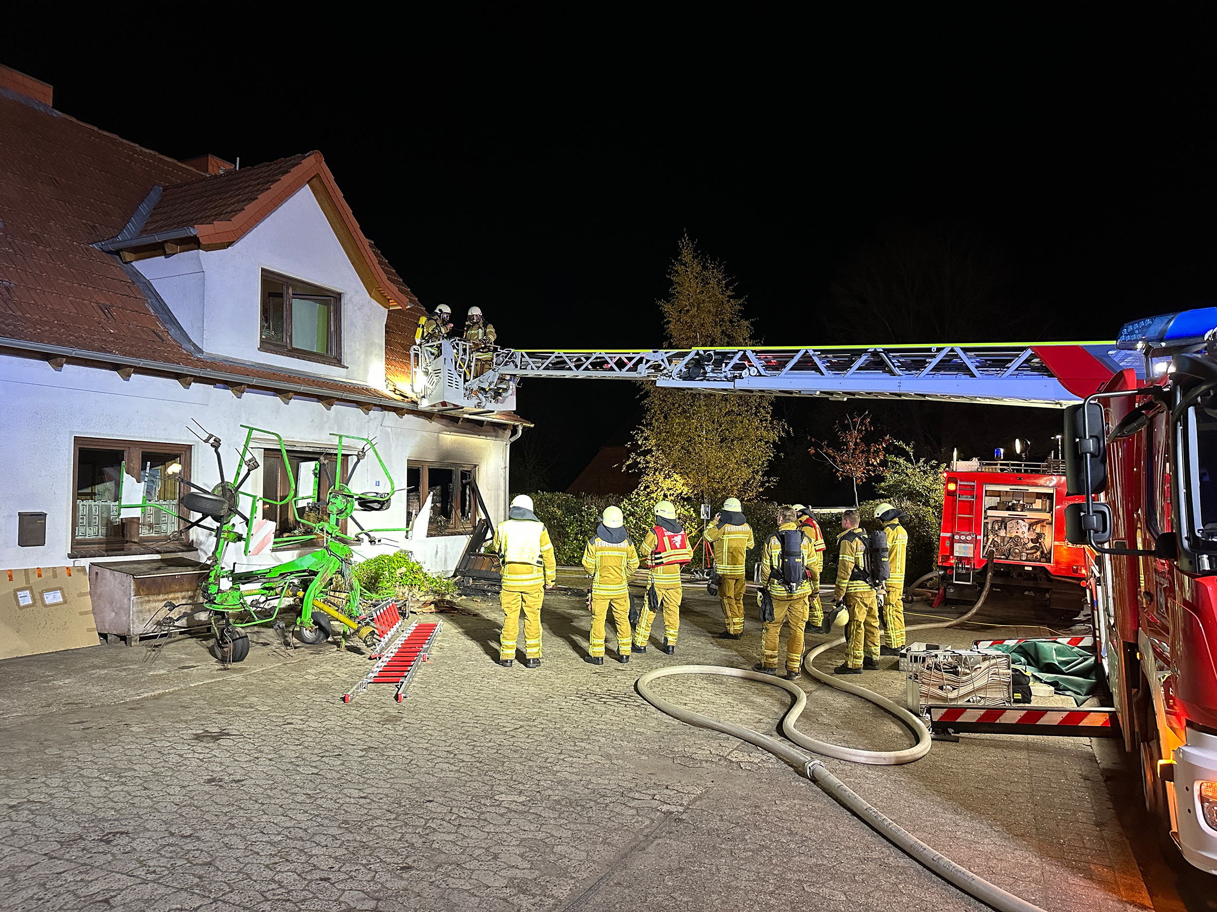 Mit mehreren Trupps, teilweise unter schwerem Atemschutz, wurde die Brandbekämpfung gestartet. Ein Innenangriff war zu Anfang aufgrund der enorm hohen Temperaturen in der Brandwohnung nur bedingt möglich. Nach ersten Rauchgaskühlungen mittels Wasser durch ein geborstenes Fenster war ein Vorgehen möglich. Ein PKW, der sehr nah am Gebäude und unmittelbar vor dem Fenster der Brandwohnung geparkt war, konnte durch die Feuerwehr gesichert und aus dem Gefahrenbereich verbracht werden. Durch die Feuerwehr wurde zusätzlich eine Nachbarwohnung kontrolliert, die direkt über der Brandwohnung lag. Das Feuer hatte sich glücklicherweise nicht auf das Obergeschoss ausgebreitet, lediglich eine starke Verrauchung war vorzufinden. Über die Drehleiter der Ortsfeuerwehr Osterholz-Scharmbeck wurde die Dachhaut geöffnet, um nach Glutnestern zu suchen.