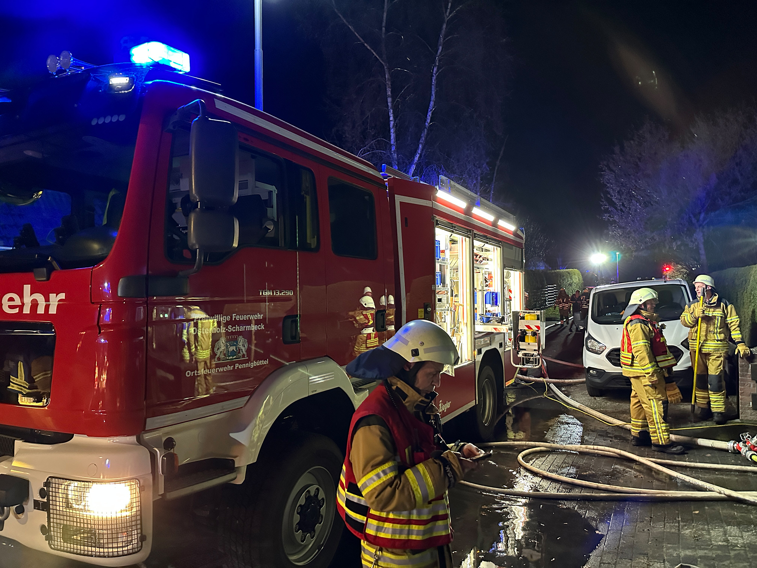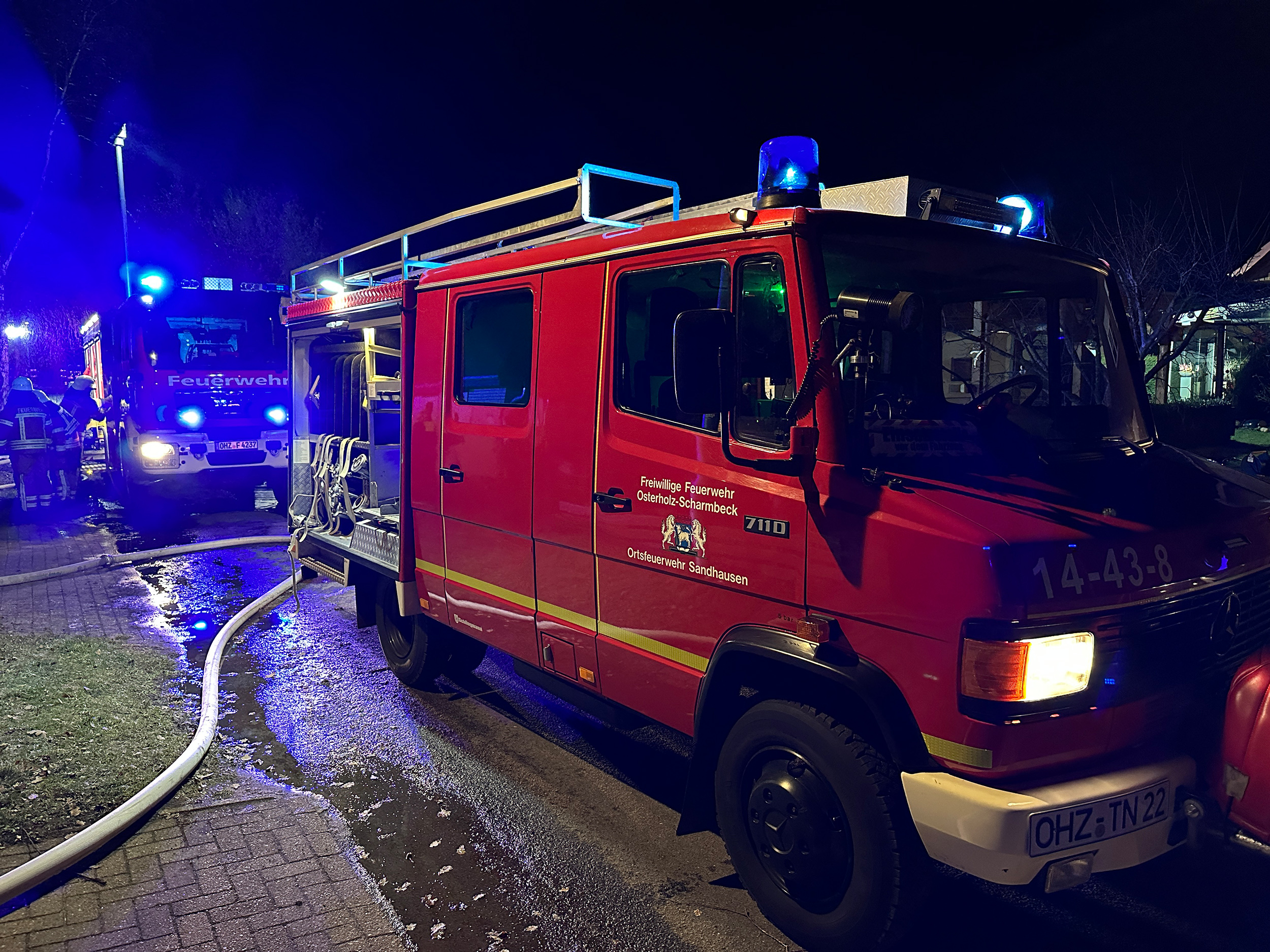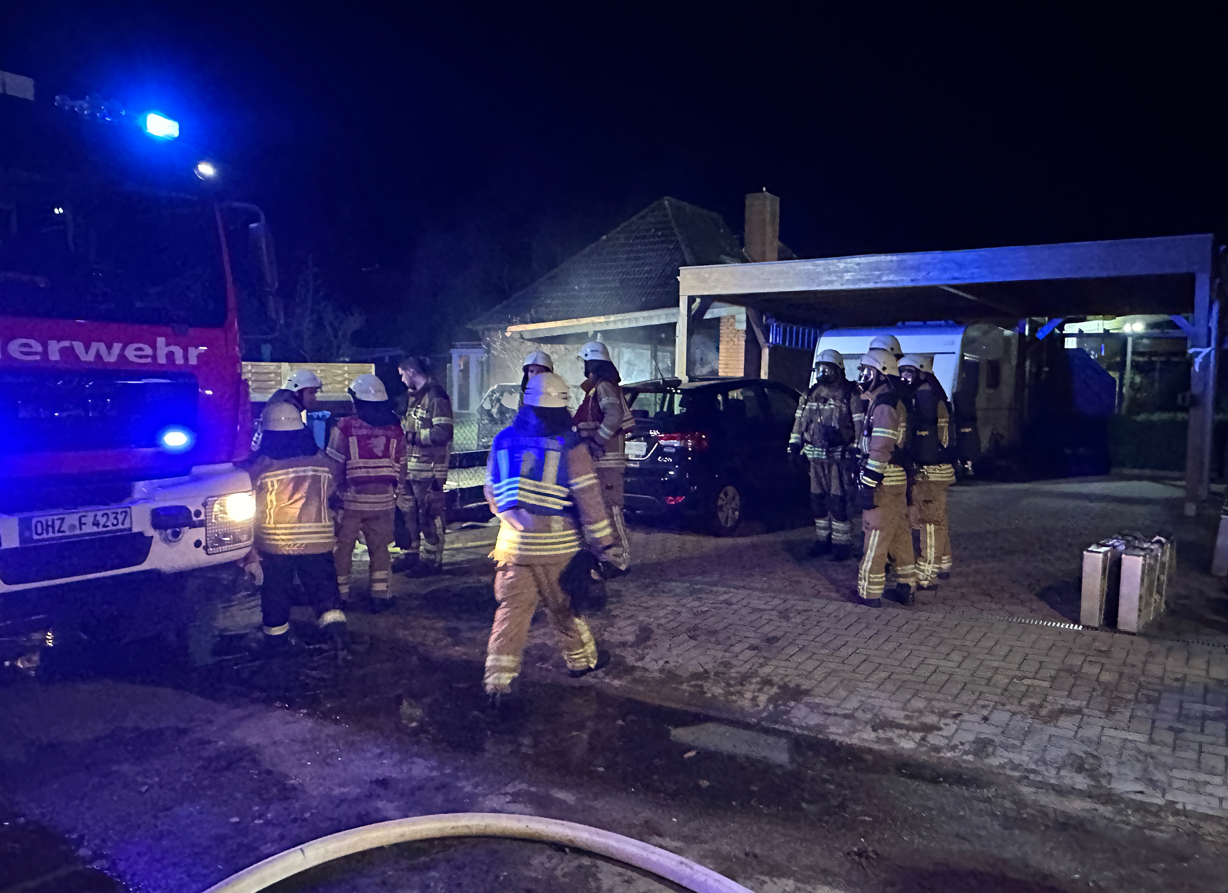 Zum größten Einsatz der Nacht wurden um 04:57 Uhr die Ortsfeuerwehren Sandhausen, Freißenbüttel, Pennigbüttel und Teufelsmoor in den Sandhausener Ring alarmiert. Hier brannte ein Pkw in einem Carport. Da sich die Flammen über den Carport ins angrenzende Wohngebäude auszubreiten begannen, wurde das Einsatzstichwort erhöht und zusätzlich die Ortsfeuerwehr Osterholz-Scharmbeck nachalarmiert. Nachdem Pkw und Carport durch drei Trupps unter Atemschutz gelöscht waren, wurde ein Teil des Daches geöffnet und Glutnester abgelöscht. Letztendlich konnte die Brandausbreitung auf das Gebäude gestoppt werden. Personen kamen nicht zu Schaden, es musste lediglich eine Bewohnerin durch den Rettungsdienst betreut werden. Die fünf Ortswehren, die mit 11 Fahrzeugen und rund 55 Einsatzkräften vor Ort waren, konnten um 06:30 Uhr abrücken.