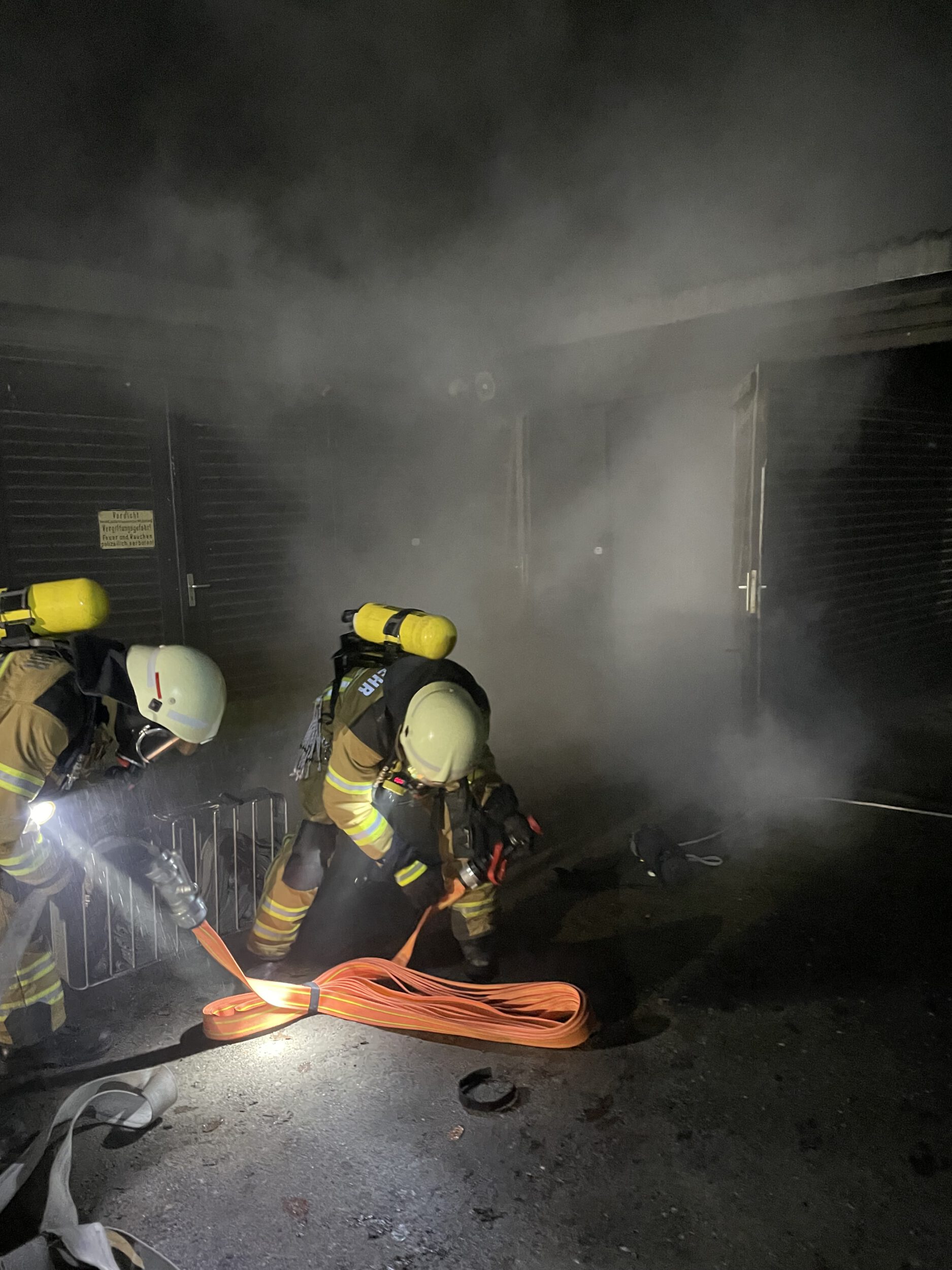 Der vorgehende Angriffstrupp hatte auf Grund der starken Rauchentwicklung Probleme, sich im Schuppen zu orientieren. Um eine bessere Sicht im Gebäude zu schaffen, wurde der Druckbelüfter eingesetzt. So konnte der Trupp in kürzester Zeit das Objekt absuchen und stellte fest, dass doch keine Person mehr im Gebäude war. Danach konnte ein weiterer Trupp zur Brandbekämpfung ins Gebäude vorgehen.