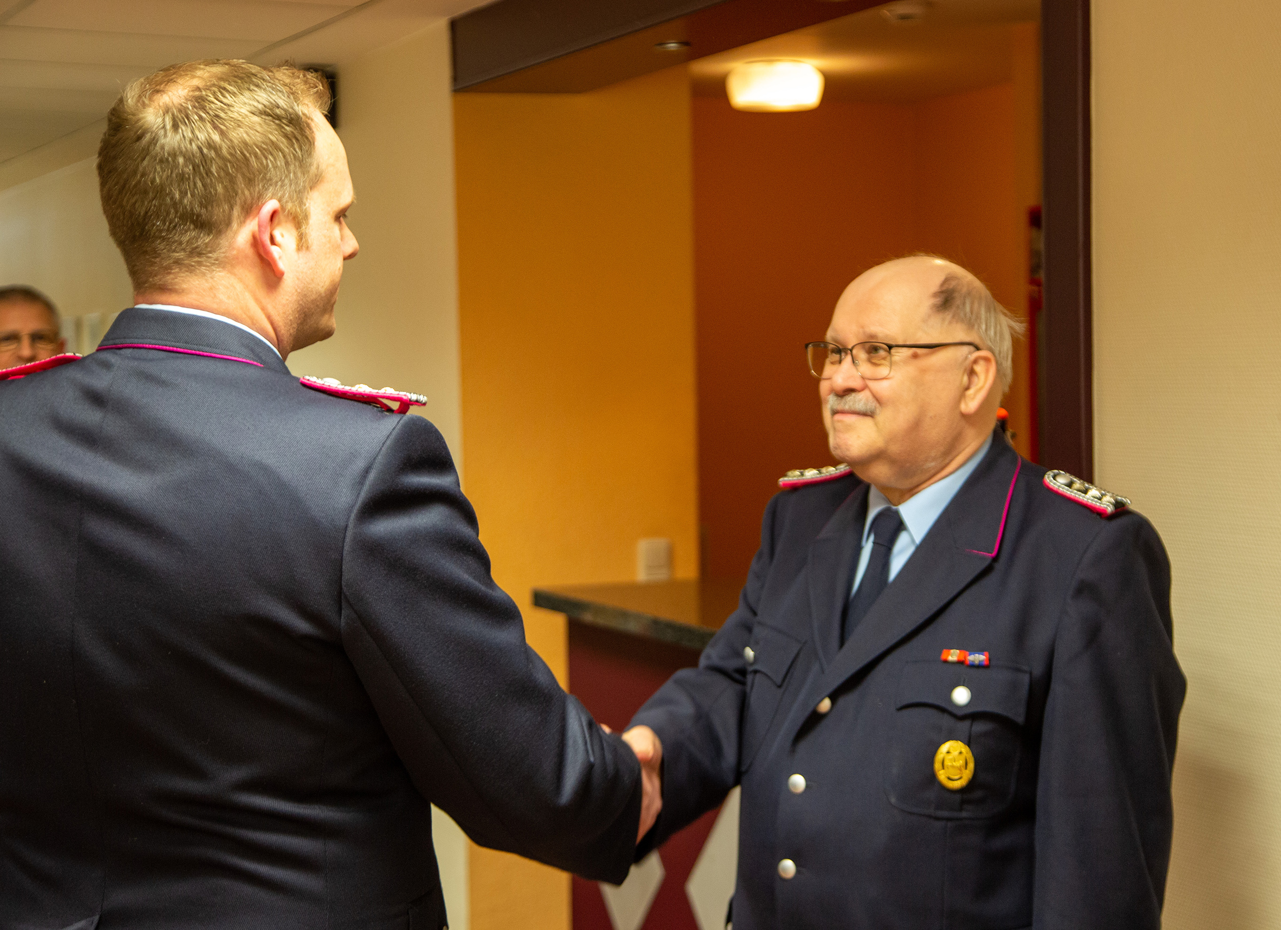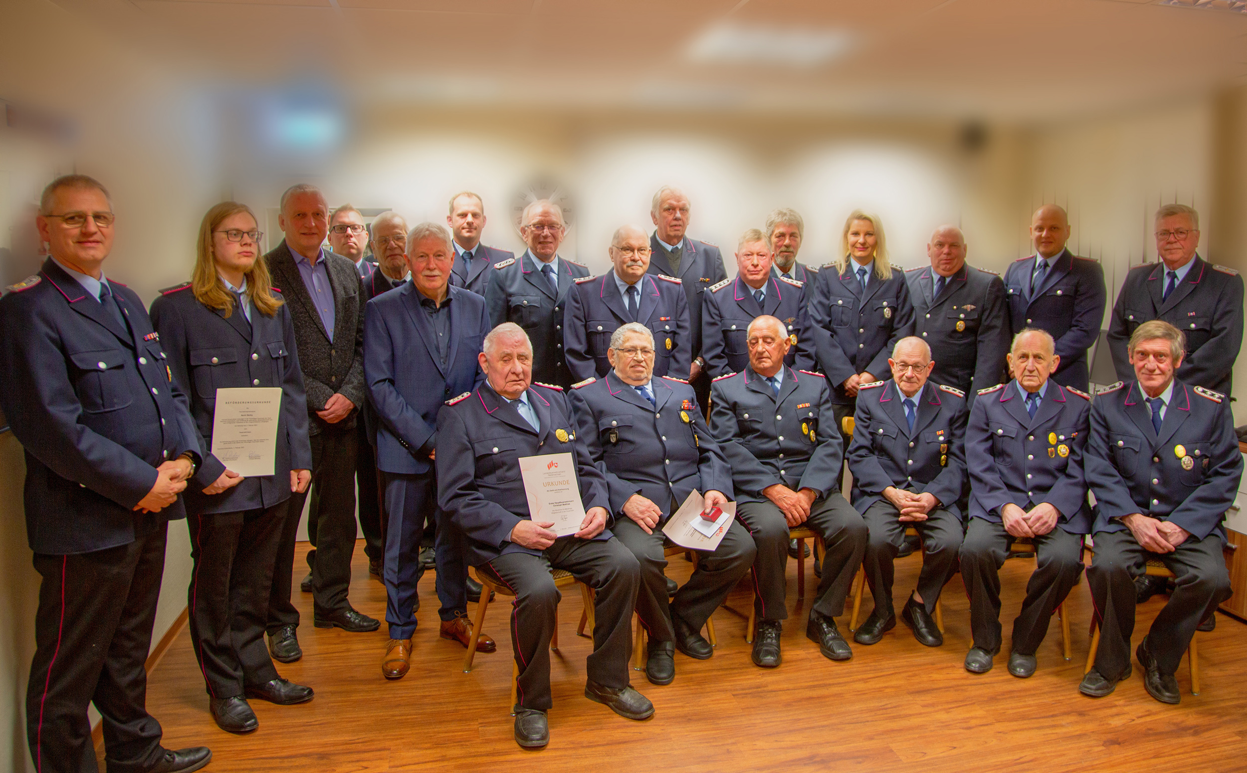 Nachdem Eric Steer und Kevin Skolny ihre noch ausstehenden Beförderungsurkunden zum Feuerwehrmann erhalten hatten, wurde Heinz Vogel von Tilman Behrens im Namen des Ortkommandos zum Ehrenmitglied der Ortsfeuerwehr Osterholz-Scharmbeck ernannt.
