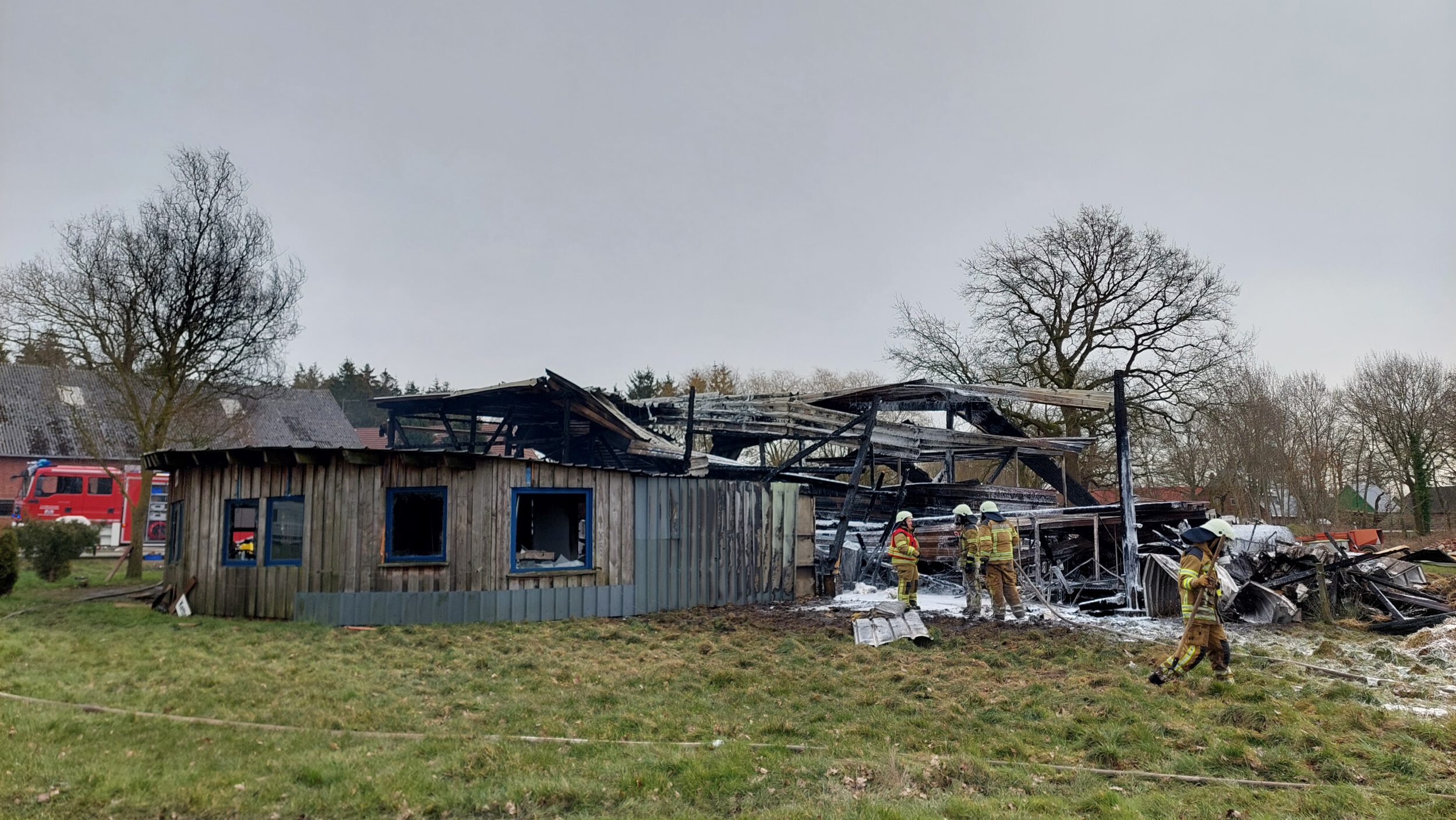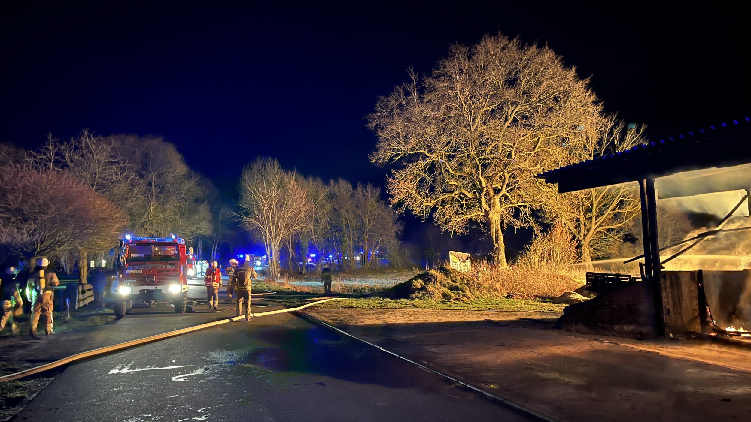 Zu dem ausgedehnten Brand eines landwirtschaftlichen Gebäudes wurden am frühen Morgen zunächst fünf Ortsfeuerwehren alarmiert. Bei Eintreffen der Einsatzkräfte stand eine ca. 50×30 Meter große Halle in Vollbrand.