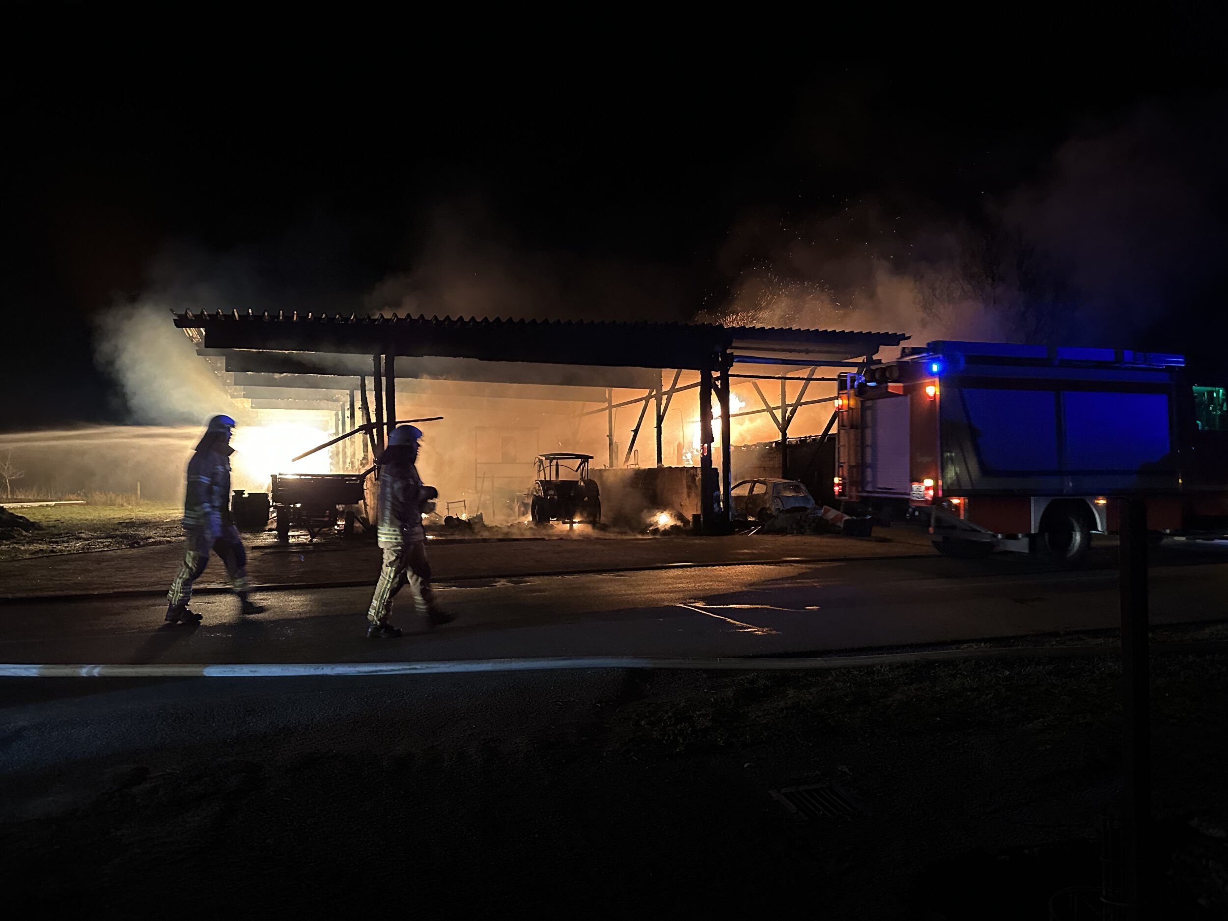 Ein Flüssiggastank, Acetylenflaschen, mehrere Pkw, Traktoren und weitere Geräte sorgten für eine sehr anspruchsvolle Brandbekämpfung. Es kam immer wieder zu kleineren Explosionen von Gasflaschen. Im Laufe des Einsatzes stürzten Teile der Dachkonstruktion zusammen und beeinträchtigten die laufende Kühlung des Flüssiggastanks mit Löschwasser. Zudem breiteten sich die Flammen in einen benachbarten Anbau aus.