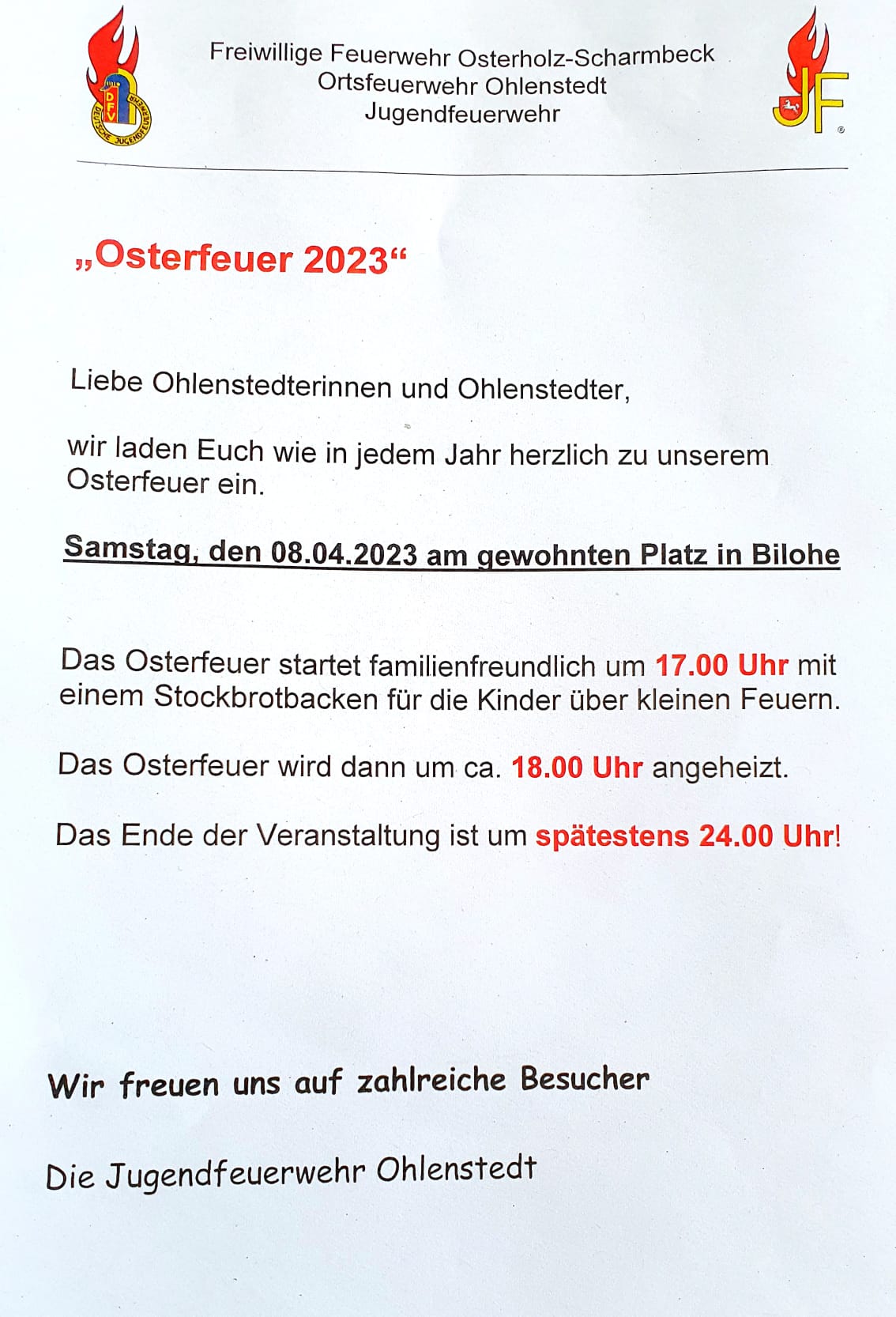 Ohlenstedt – Biloher Straße – 08.04.2023 – 17:00 Uhr (Stockbrot) – 18:00 Uhr (Osterfeuer)