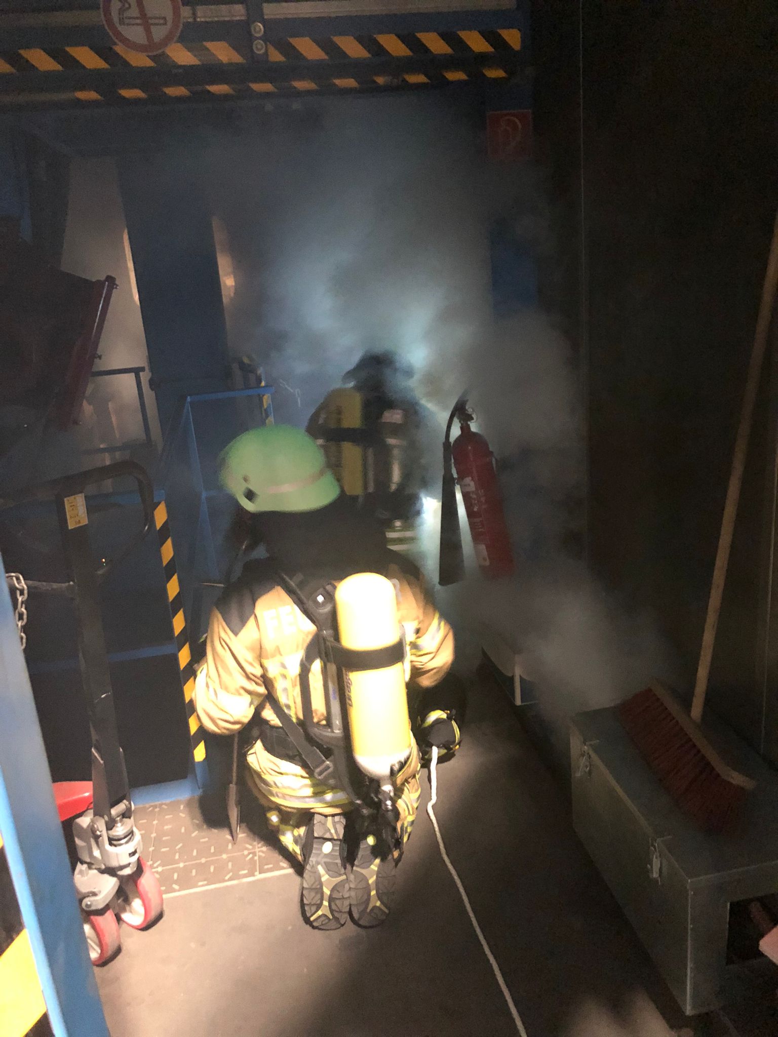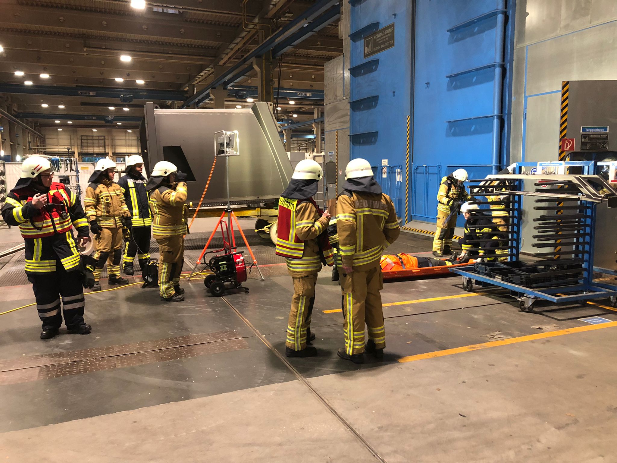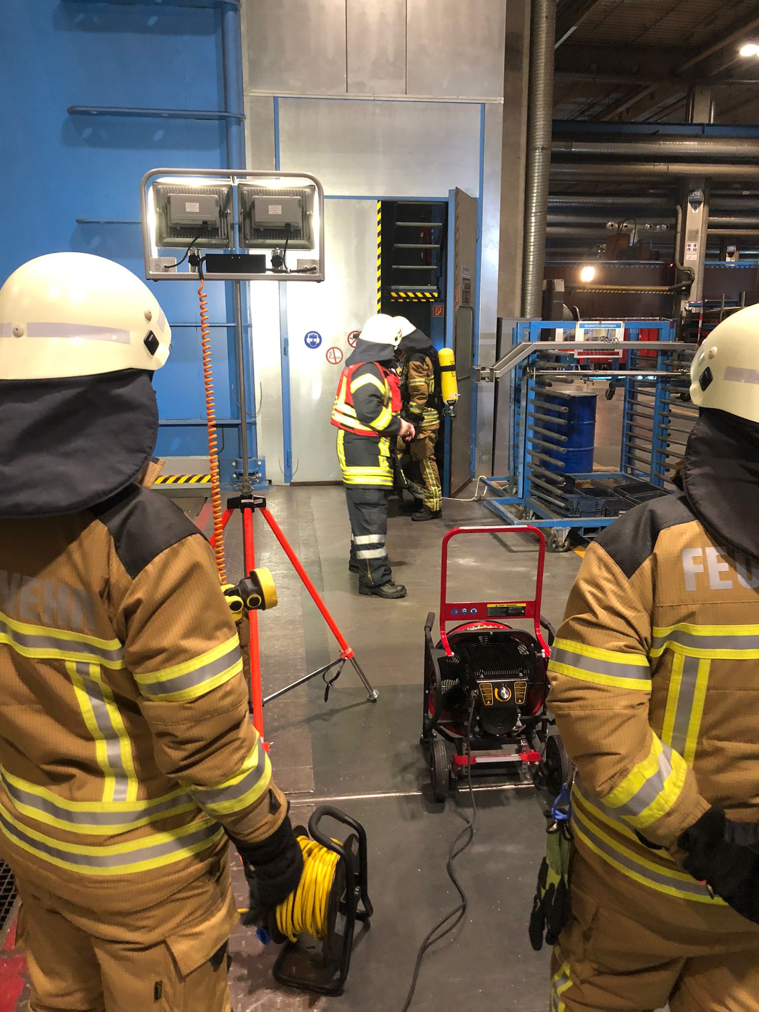 Im Anschluss hatten die Ortsfeuerwehren Heilshorn und Scharmbeckstotel die Möglichkeit in einer großen Sandsrahlanlage eine Übung durchzuführen. Hierzu wurde das Treppenhaus der Maschine verraucht, um eine erschwerte Sicht zu simulieren und zwei Personen als Vermisste Personen platziert. Für die Kameradinnen und Kameraden ging es dann darum, den Brandschutz herzustellen und die beiden Personen unter Atemschutz zu retten. Eine Person wurde aus dem Kellergeschoss gerettet, die zweite Person wurde anschließend im Obergeschoss der Maschine gefunden und ins Freie gebracht. Abschließend wurde der Treppenraum mit einem Lüfter entraucht.