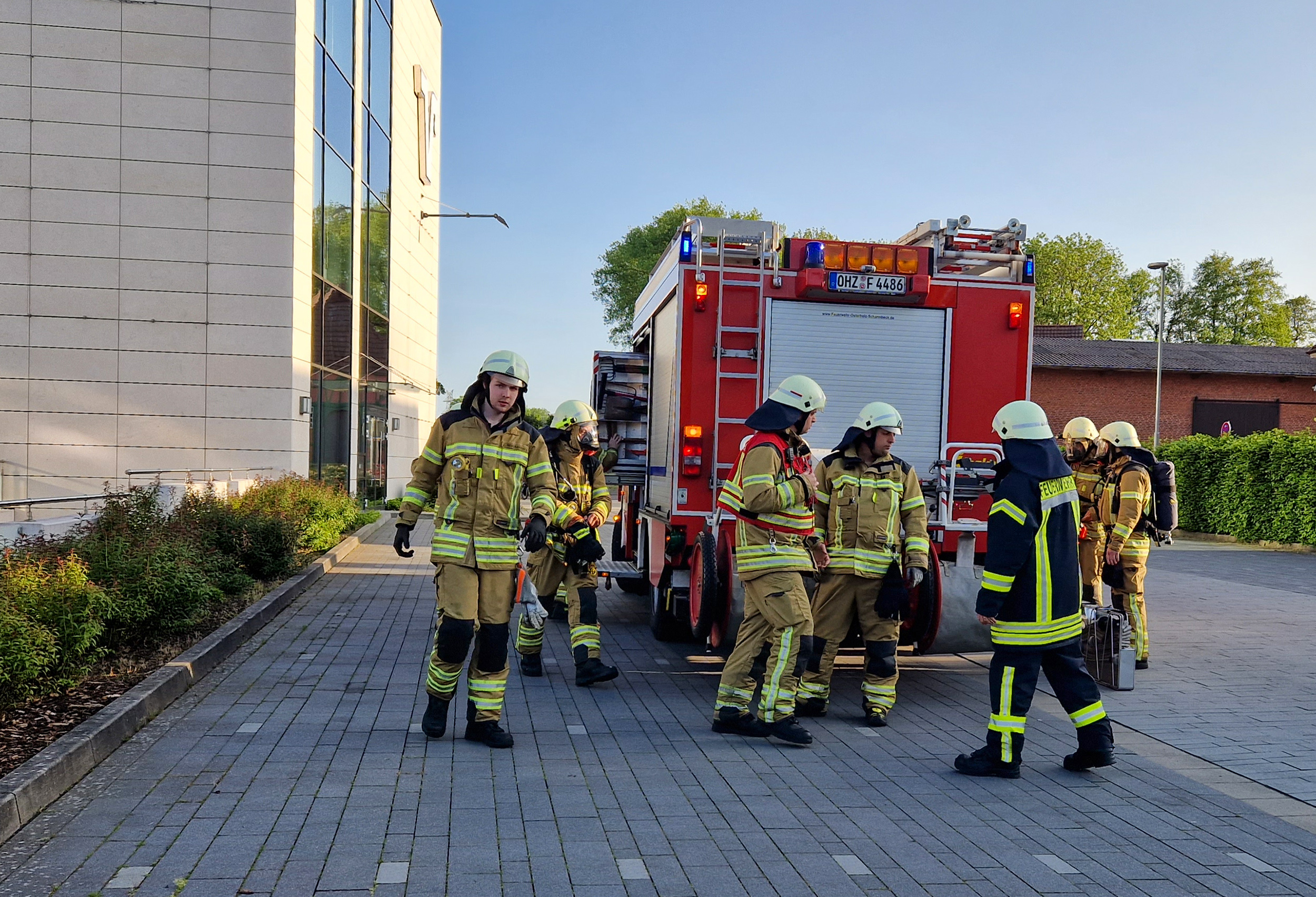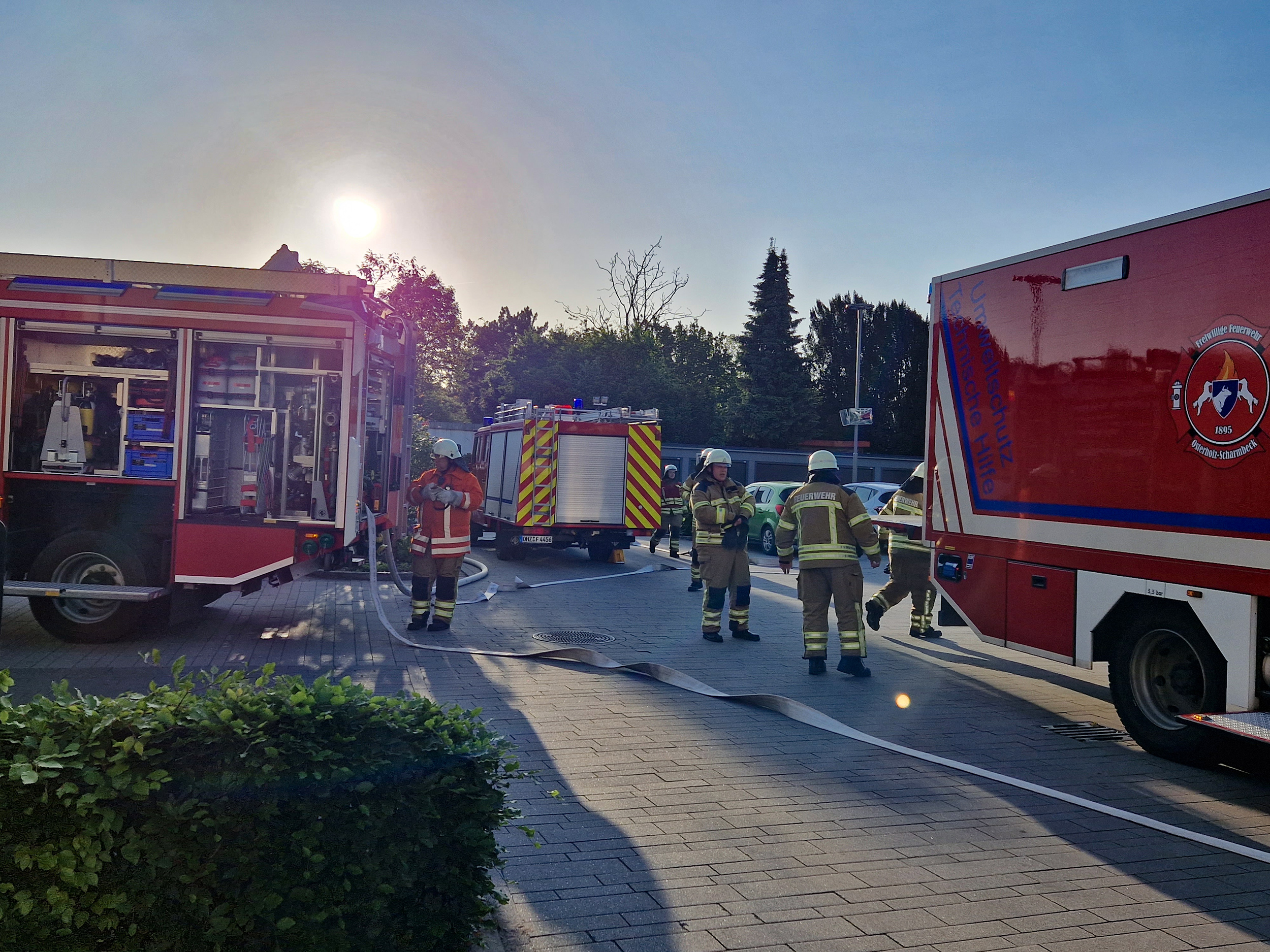 Eine Reihe von Feuerwehrfahrzeugen zog am Donnerstagabend (25.05.) mitten in der Innenstadt von Osterholz-Scharmbeck die Blicke der Passanten auf sich. Am Parkplatz der Volksbank versammelten sich in kurzer Zeit Einheiten der Ortsfeuerwehren Osterholz-Scharmbeck und Pennigbüttel. Mit dem Stichwort „Pkw-Brand in Tiefgarage Volksbank“ waren die Kräfte alarmiert worden. Glücklicherweise nur ein Übungsszenario. Dennoch wurde die Lage genauso ernst abgearbeitet wie in einem normalen Realfall. Und diese war durchaus anspruchsvoll: Nach Zeugenaussagen vor Ort wurden drei Kinder im Bereich des brennenden Pkws vermisst. Während sich die Atemschutz-Trupps ausrüsteten, um zur Menschenrettung vorzugehen, wurde eine Wasserentnahme aus dem nahen Scharmbecker Bach am Markt aufgebaut.