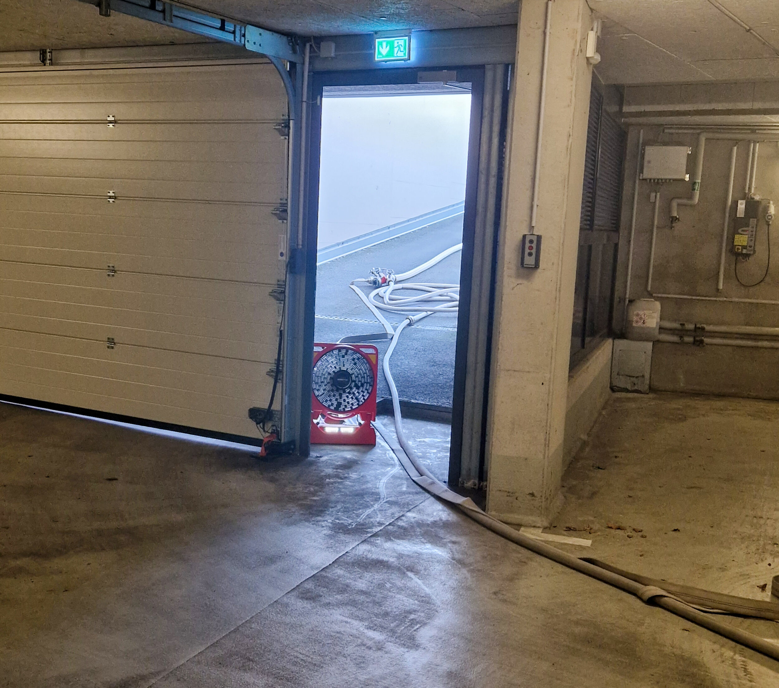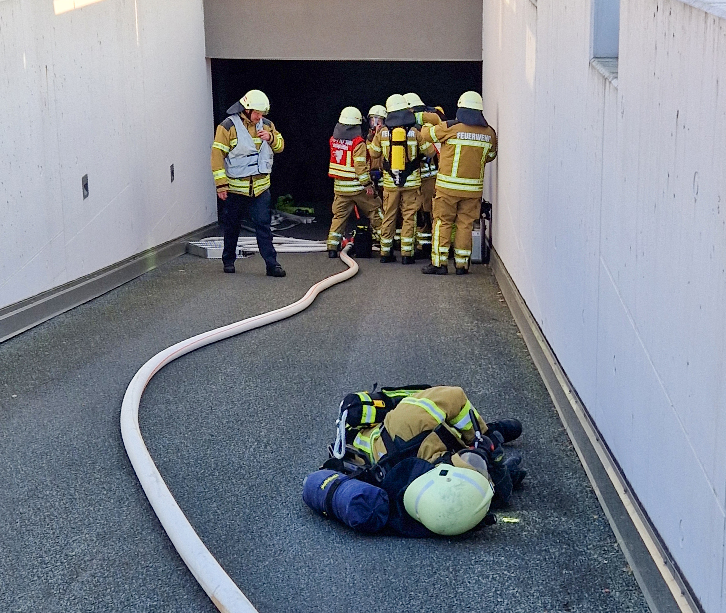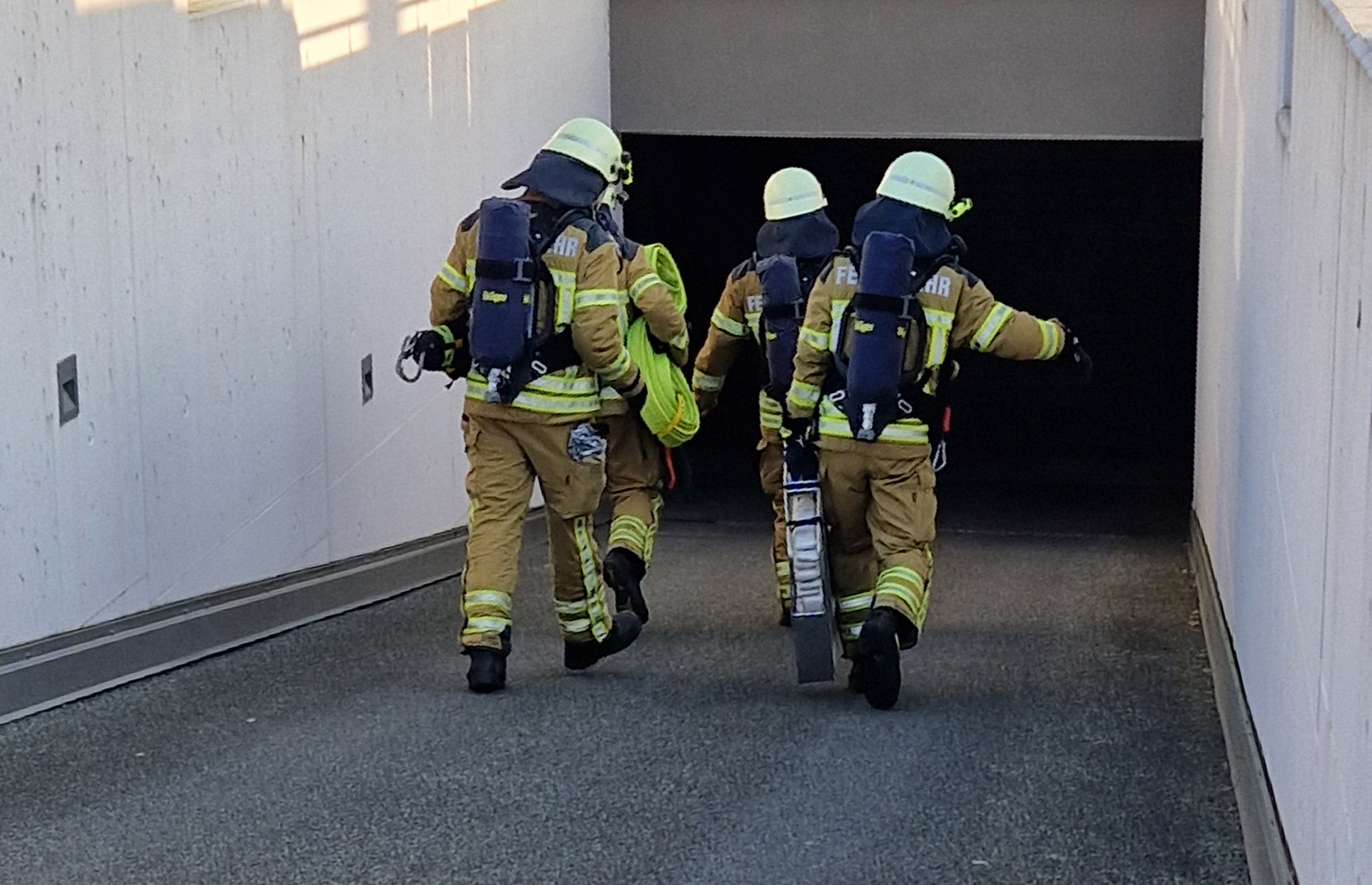 Die gesuchten Personen wurden durch die Trupps schnell in der völlig verrauchten Tiefgarage gefunden, allerdings brachte die weitere Erkundung eine neue Herausforderung mit sich: das brennende Fahrzeug stellte sich als Elektroauto heraus. Nachdem das Feuer nachhaltig bekämpft war, musste somit eine kontinuierliche Kühlung des Fahrzeuges sichergestellt werden. Das Szenario hielt noch eine weitere Herausforderung parat – einer der eingesetzten Atemschutzgeräteträger erlitt einen (simulierten) Schwächeanfall bei der Brandbekämpfung. Der Sicherungstrupp der Pennigbütteler Wehr brachte ihn umgehend aus dem Gefahrenbereich.