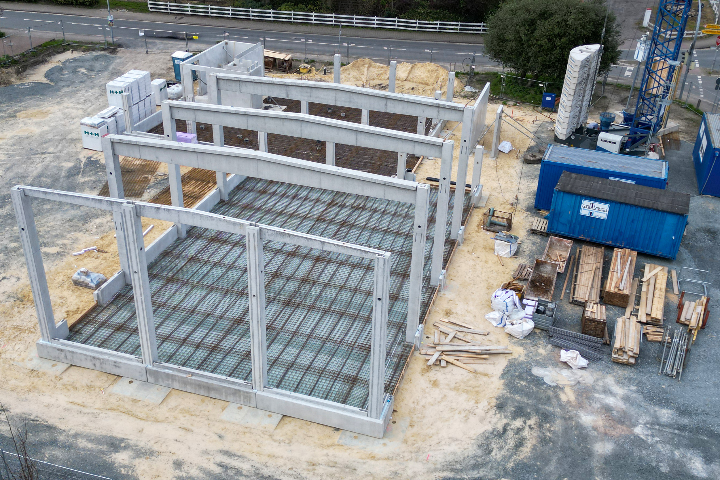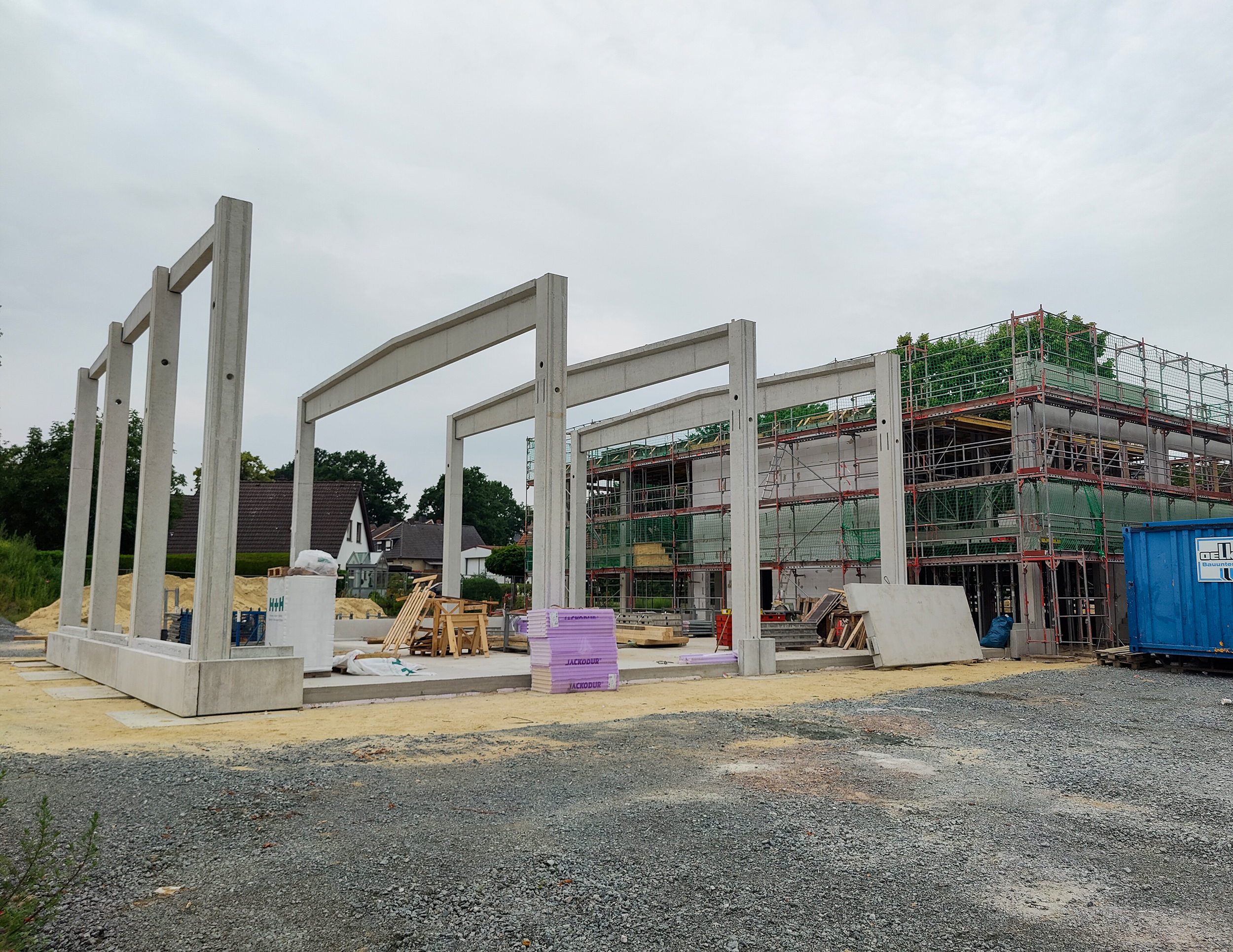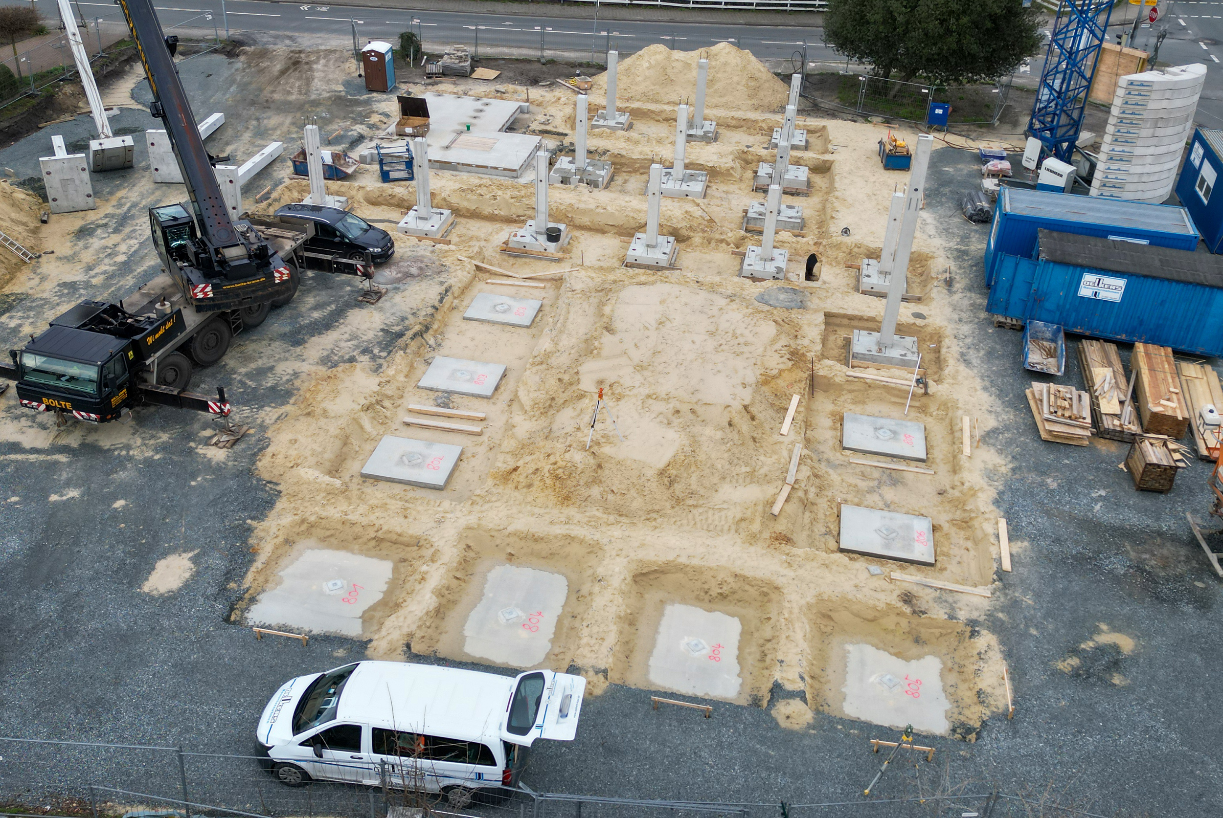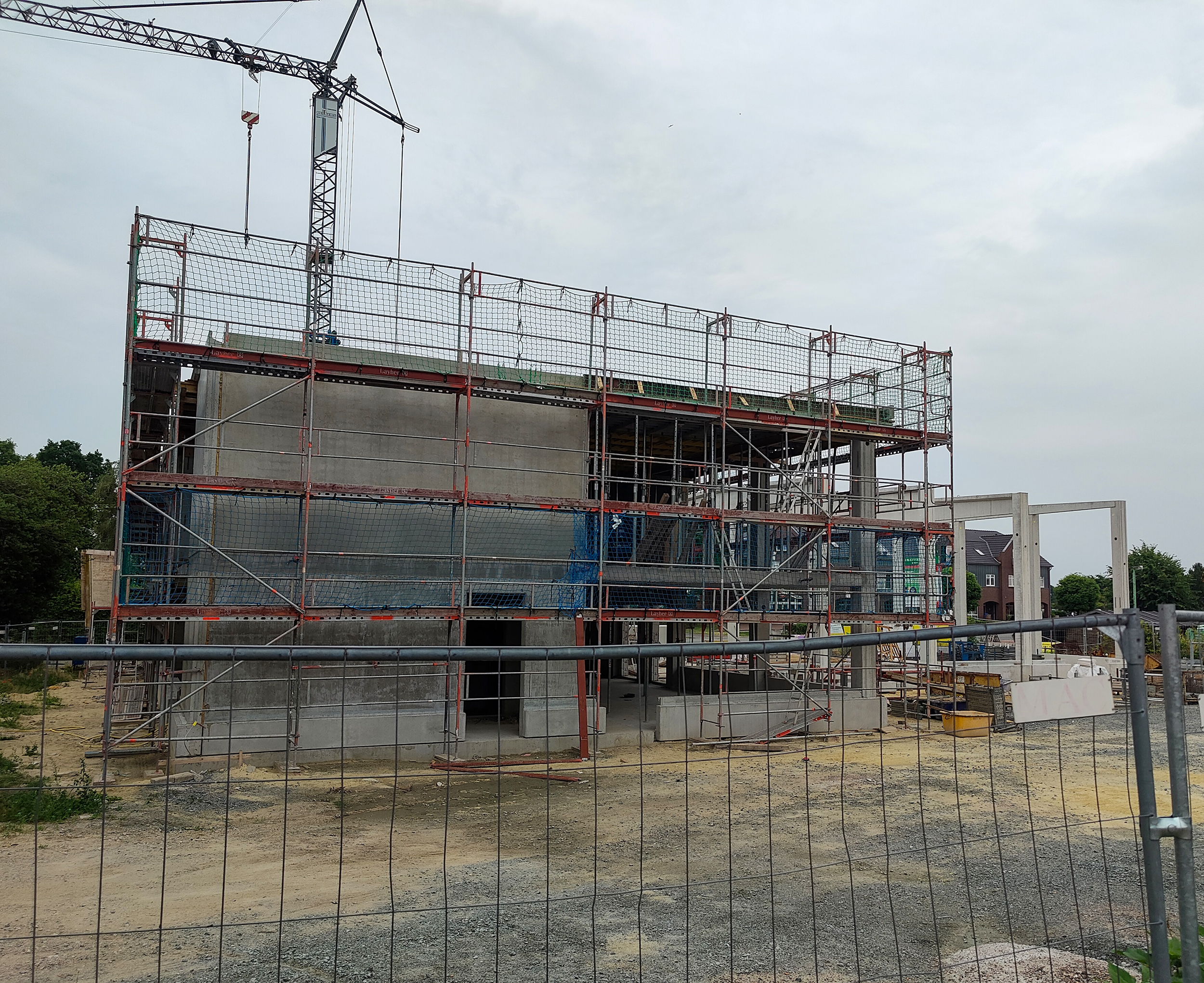 Zwischenzeitlich sind die Pfahlfundamente und die Bodenplatte gegossen und die Träger der Fahrzeughalle sowie die Pfähle des Sozialtraktes deutlich erkennbar. Auch der Fahrstuhlschacht ist gesetzt und die weiteren Decken werden gegossen. Deutlich sind inzwischen die Abmaße des Feuerwehrhauses erkennbar – und mit etwas Fantasie kann man sich bereits die Fahrzeuge in der Halle vorstellen.