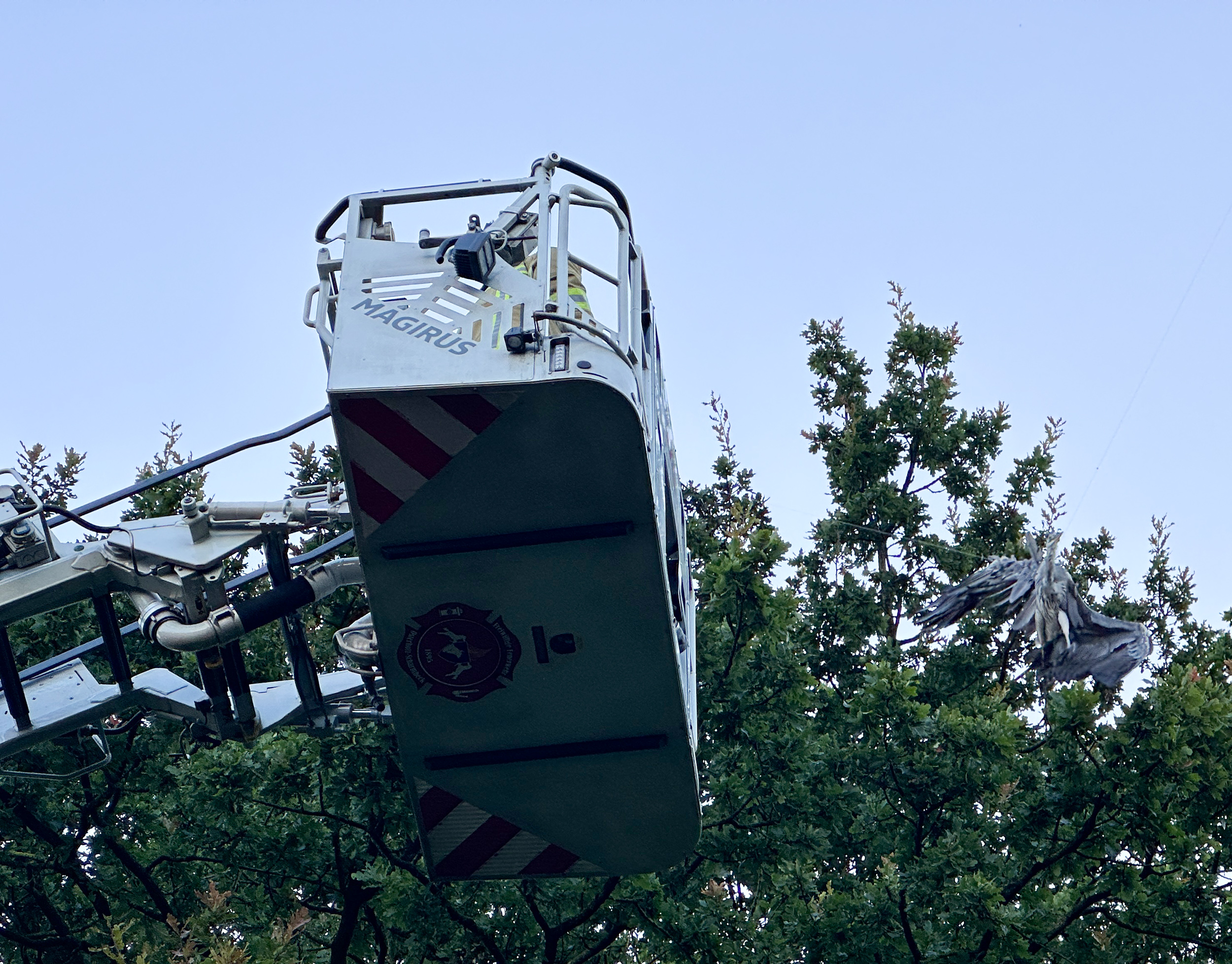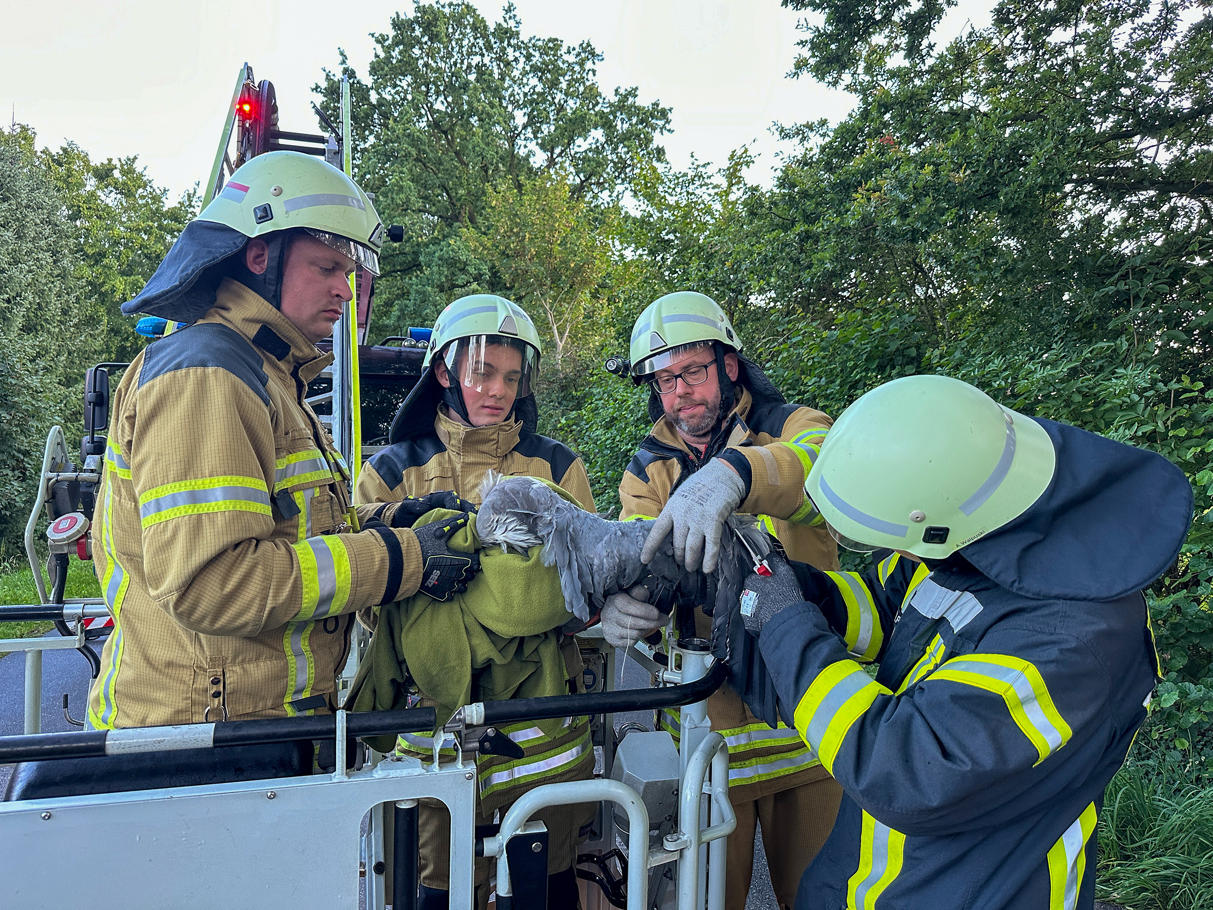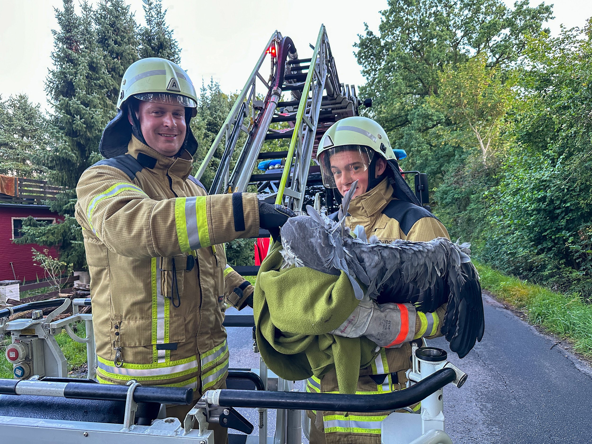 Zu einer ungewöhnlichen Tierrettung wurde die Ortsfeuerwehr Osterholz-Scharmbeck am Abend des 29.07. alarmiert. Anwohner bemerkten am Garlstedter Kirchweg einen Reiher, der sich in einem Baum verfangen hatte und sich trotz intensiver Bemühungen nicht selbst befreien konnte. Da sich das zunehmend erschöpfte Tier in rund 10m Höhe befand und sie selbst nicht helfen konnten, meldeten die Anwohner die Notlage über 112 der Leitstelle Bremerhaven. Diese alarmierte die zuständige Ortsfeuerwehr Osterholz-Scharmbeck die mit Drehleiter und einem Begleitfahrzeug ausrückte. Ein Trupp näherte sich mit dem Drehleiterkorb dem Vogel und konnte diesen vorsichtig sichern. Es stellte sich heraus, dass eine Drachenschnur dem Tier zum Verhängnis geworden war. Diese hatte sich um Füße und einen Flügel gewickelt. Die Einsatzkräfte beseitigten die Schnur aus dem Baum und brachten den Reiher in eine Decke gewickelt auf den Boden. Dort wurde das Tier behutsam von der restlichen Schnur befreit. Die Mitarbeiter eines nahen gelegenen Tierparks übernahmen den erschöpften Reiher zur weiteren Betreuung. Die Feuerwehr konnte den Einsatz nach rund einer Stunde beenden und wieder einrücken.
