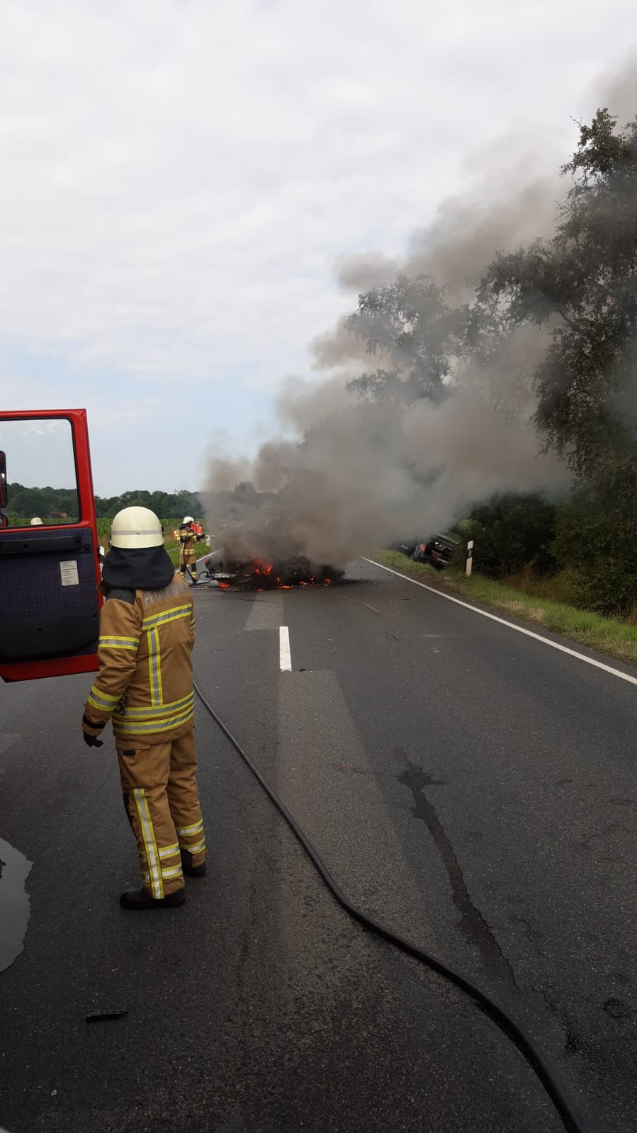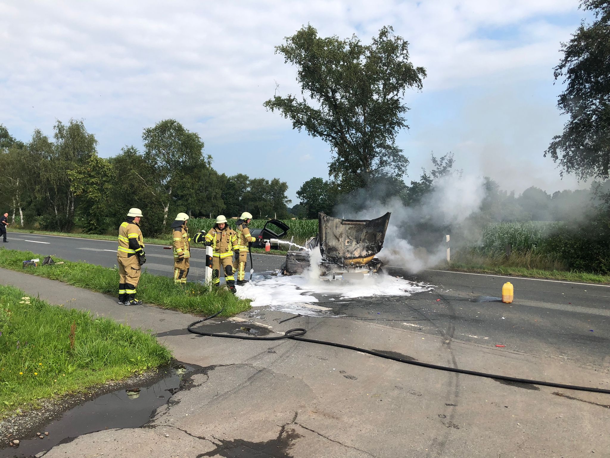 Bei Eintreffen der Feuerwehr wurde ein Unfall zwischen drei PKW’s vorgefunden, einer davon brannte bereits. Alle betroffenen Personen hatten ihre Fahrzeuge verlassen können und wurden vom Rettungsdienst betreut. Ein Feuerwehr-Trupp unter Atemschutz begann mittels Schaumschnellangriff die Brandbekämpfung. Zusammen mit der Feuerwehr Eggestedt aus der Gemeinde Schwanewede wurde das Fahrzeug komplett abgelöscht.