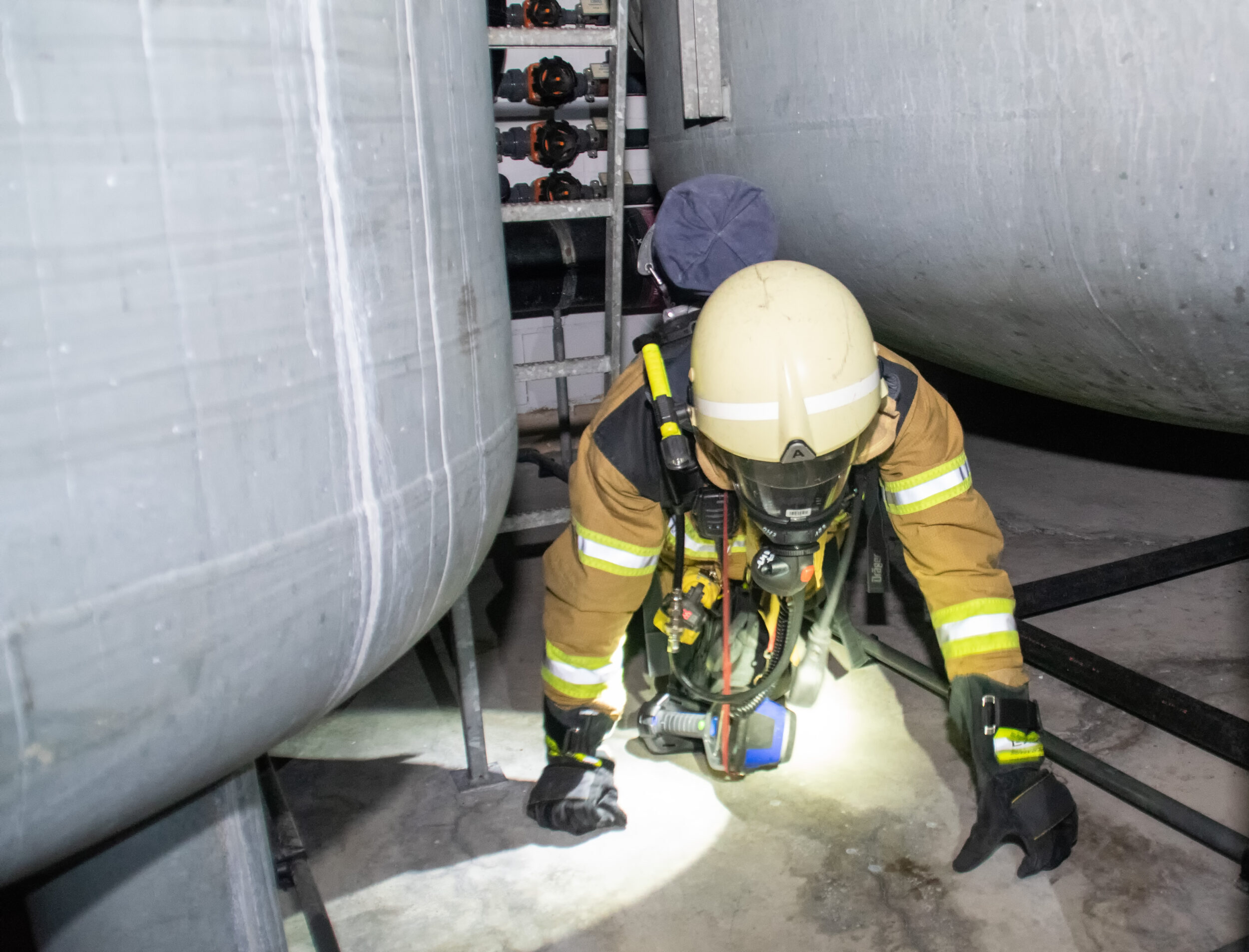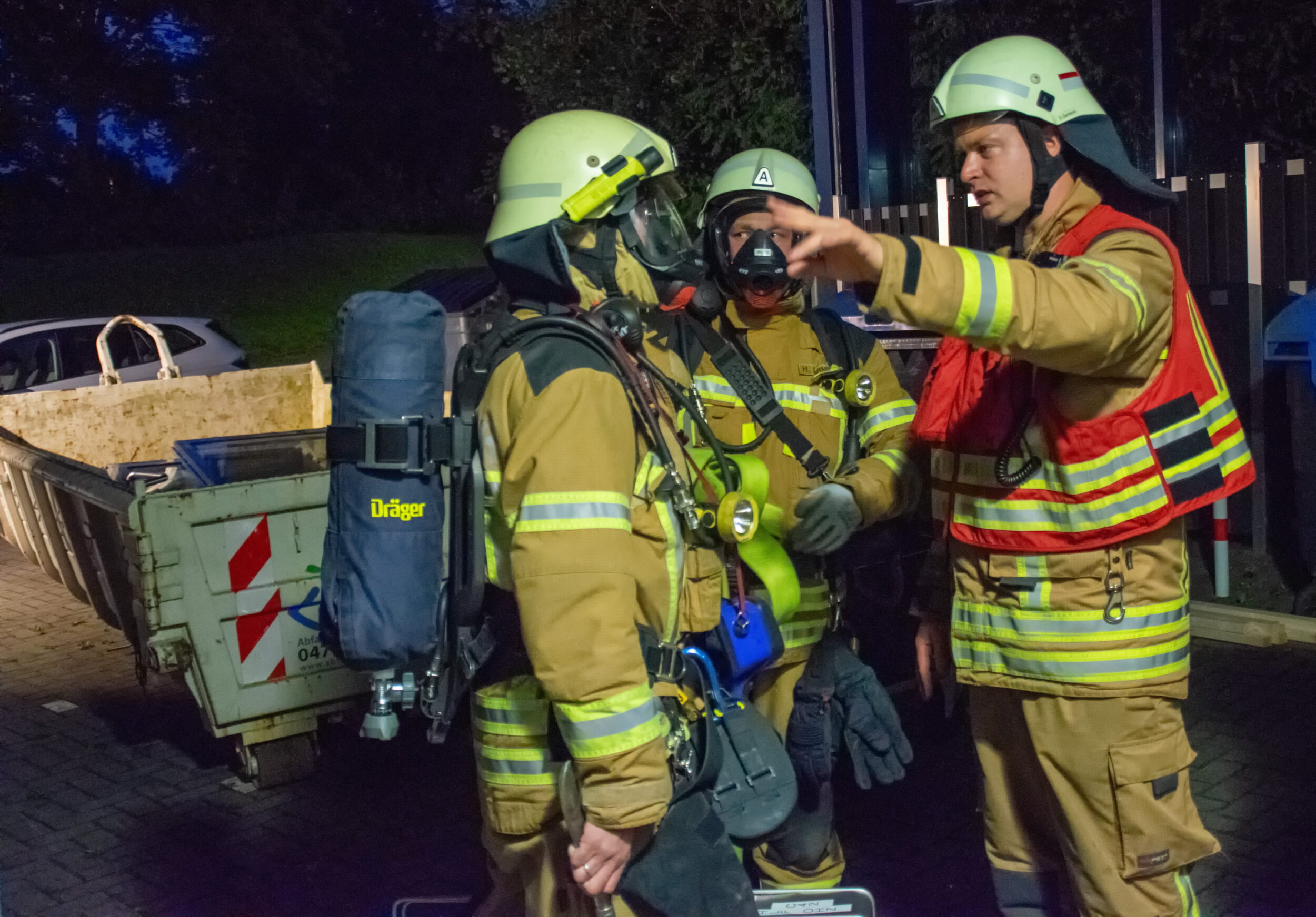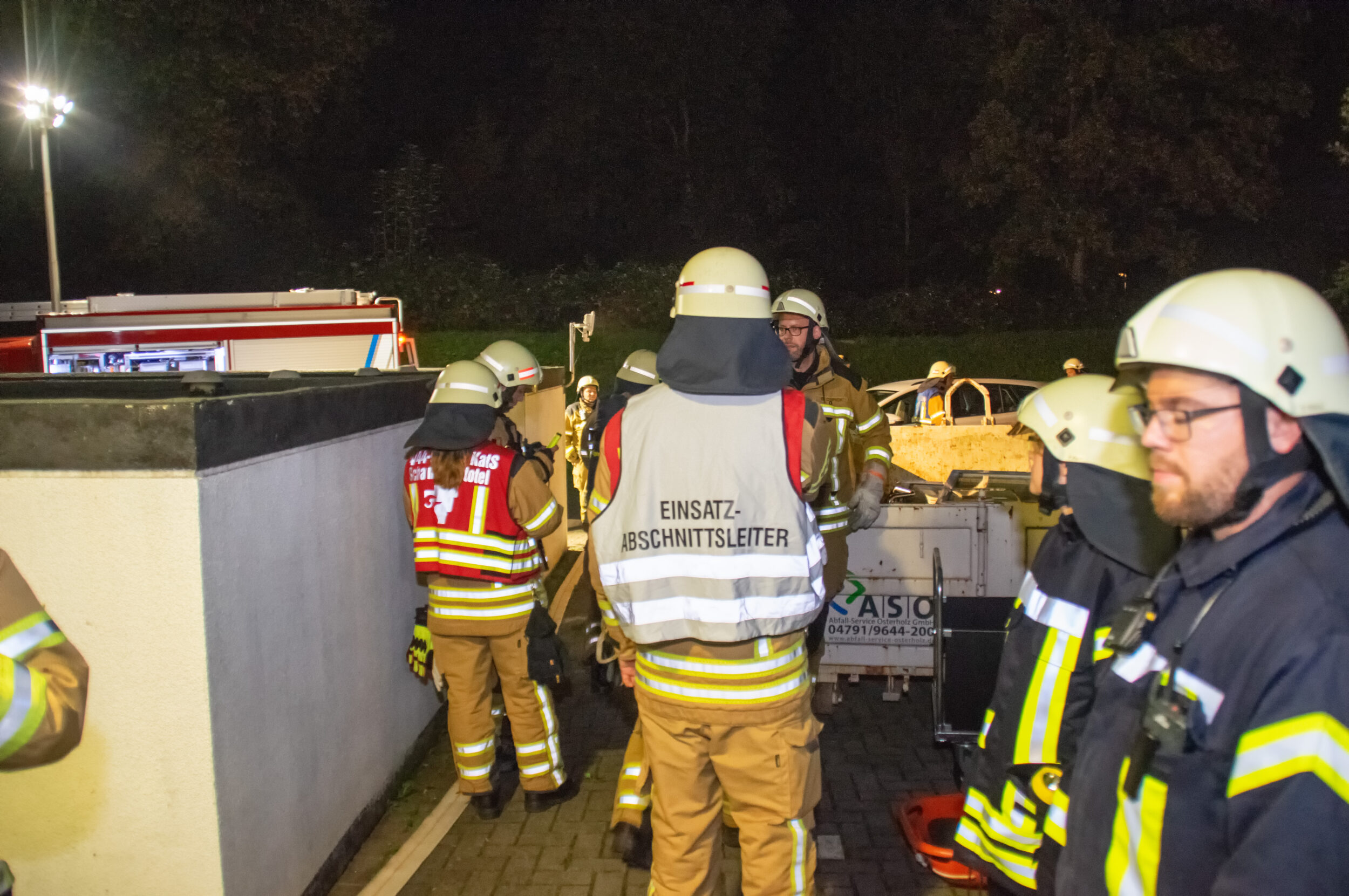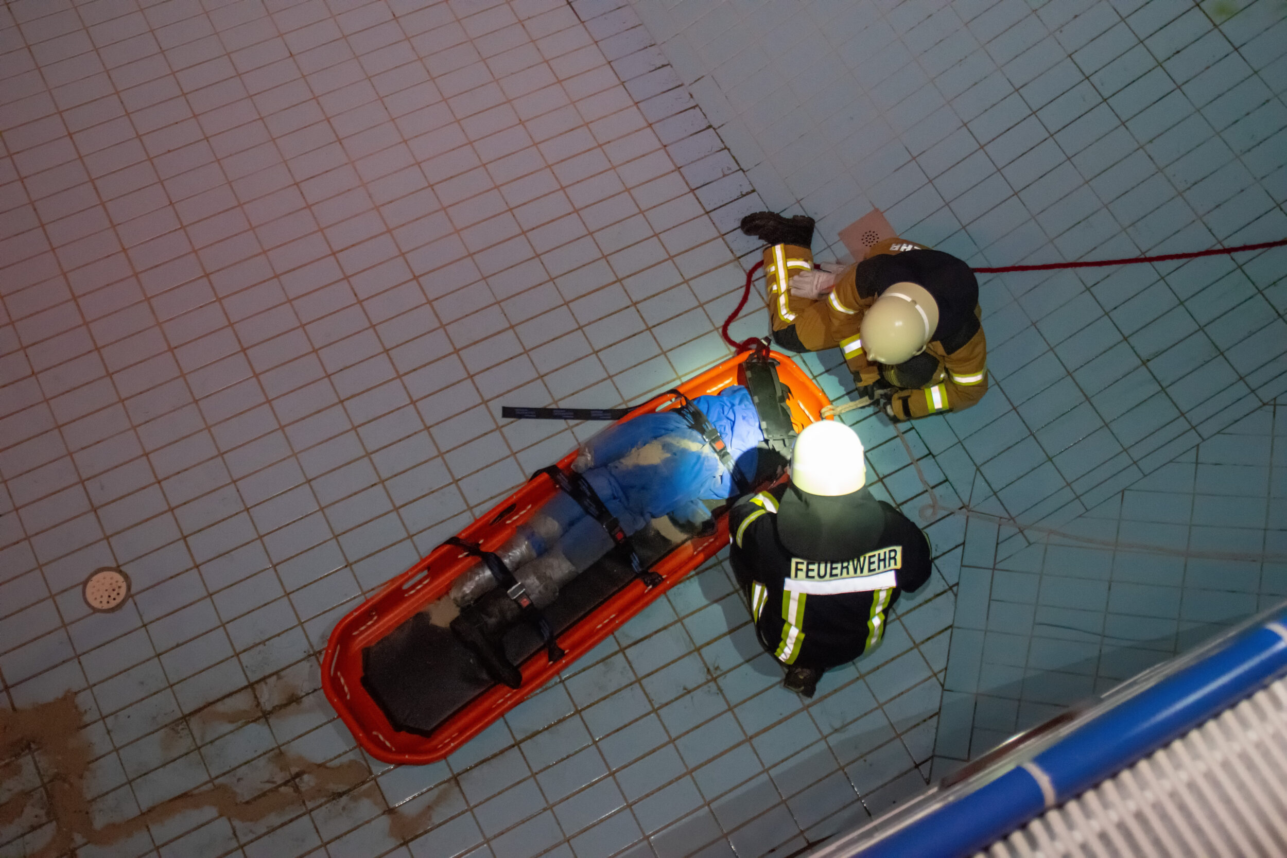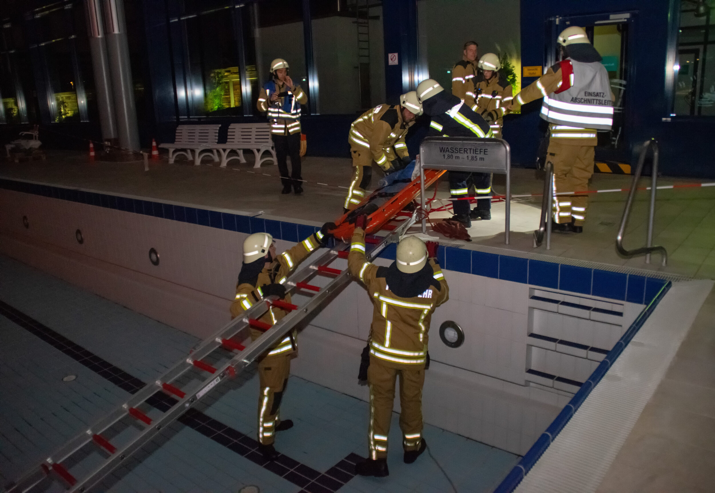 Gemäß Übungsszenario war es bei Wartungsarbeiten an der Schwimmbadtechnik zu einer größeren Verpuffung gekommen. 13 Techniker wurden im weitläufigen Schwimmbadareal vermisst. Aufgrund der Größe der Einsatzlage wurde neben den drei Wehren auch die Führungsunterstützungsgruppe der Stadtfeuerwehr eingesetzt. Insgesamt sieben Trupps gingen unter Atemschutz zur Menschenrettung in das komplett abgedunkelte Gebäude vor. Die Vermissten, die durch Übungs-Dummys und Mitglieder der Jugendfeuerwehr dargestellt wurden, waren an unterschiedlichen und teilweise sehr anspruchsvollen Stellen des Schwimmbades positioniert. So waren zwei Vermisste in das (abgelassene) Schwimmbecken gestürzt. Mittels Schleifkorbtrage und Steckleitern mussten hier vier Meter Höhenunterschied überbrückt werden. Insbesondere im Technik-Keller des Schwimmbades war das Absuchen des Bereiches körperlich sehr anspruchsvoll für die Atemschutzgeräteträger. Dort war ein Arbeiten teilweise nur auf allen vieren möglich.