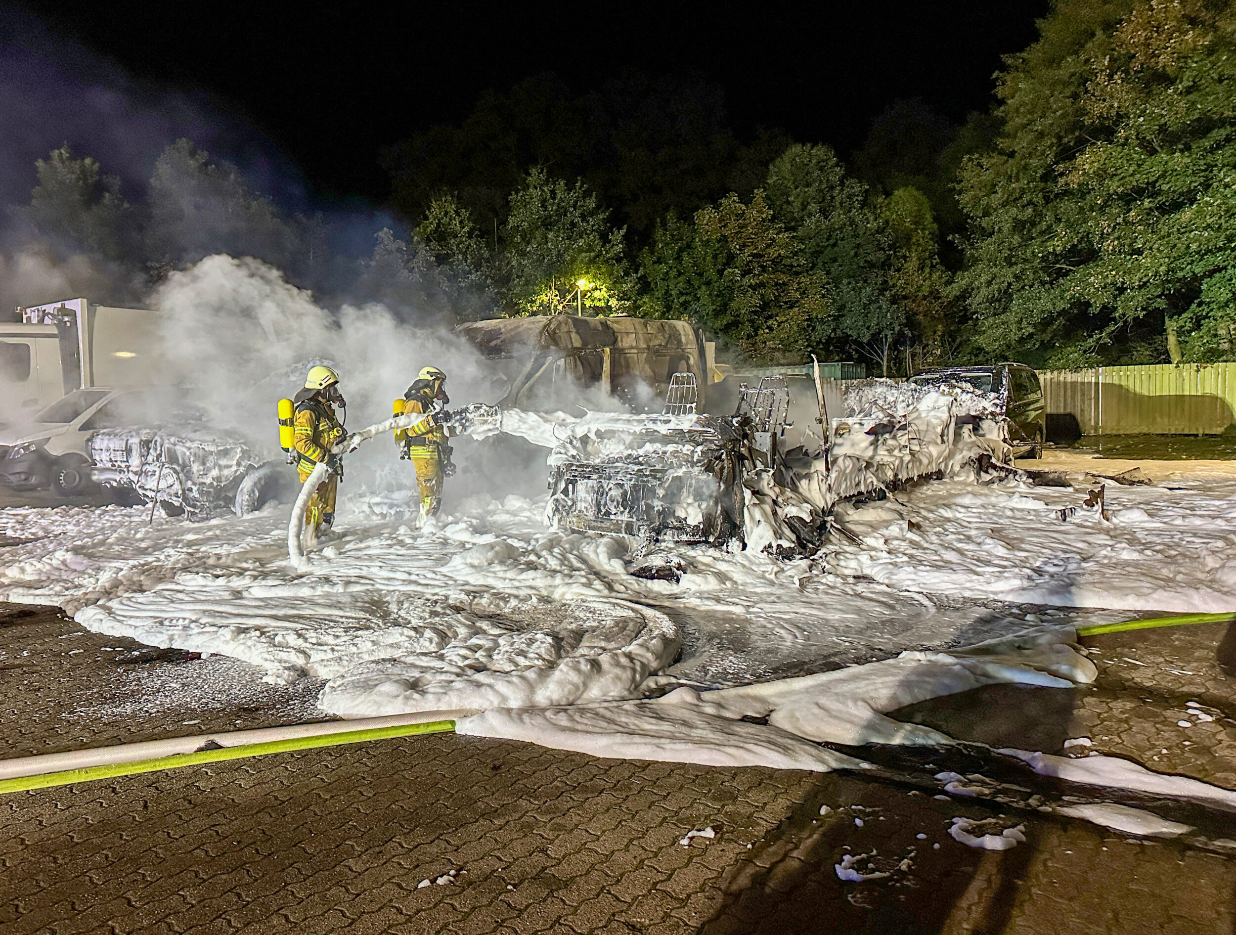 Nachdem die Flammen weitestgehend niedergeschlagen waren, setzten die Einsatzkräfte umfangreich Löschschaum ein, um auch alle Glutnester in den Fahrzeugen zu ersticken. Sicherheitshalber wurde daher auch zusätzlich die untere Wasserbehörde zur Einsatzstelle alarmiert. Nachdem keine Gefahr mehr von der Brandstelle ausging, wurde die Einsatzstelle an die Polizei übergeben und die Feuerwehr rückte wieder ein.