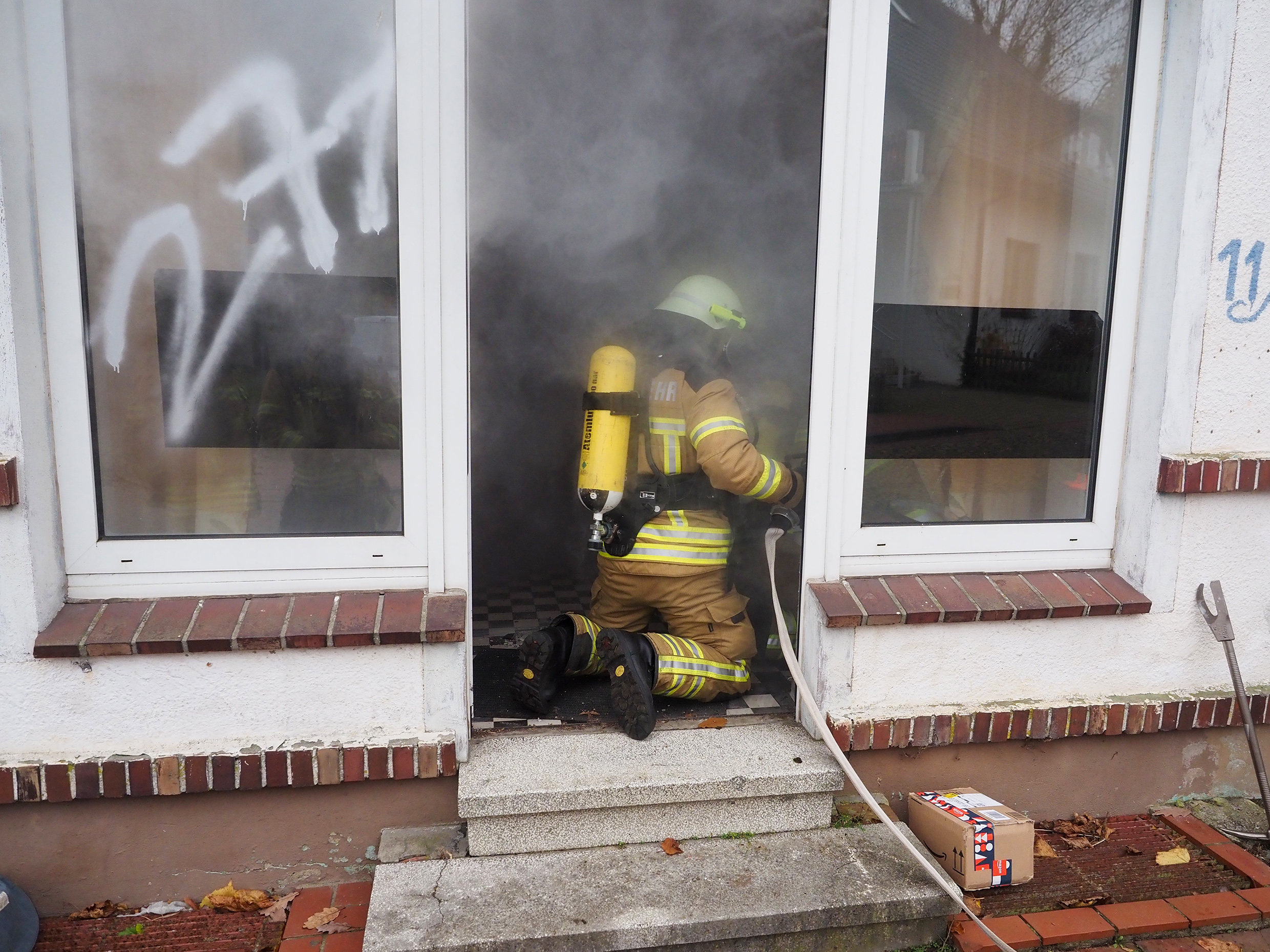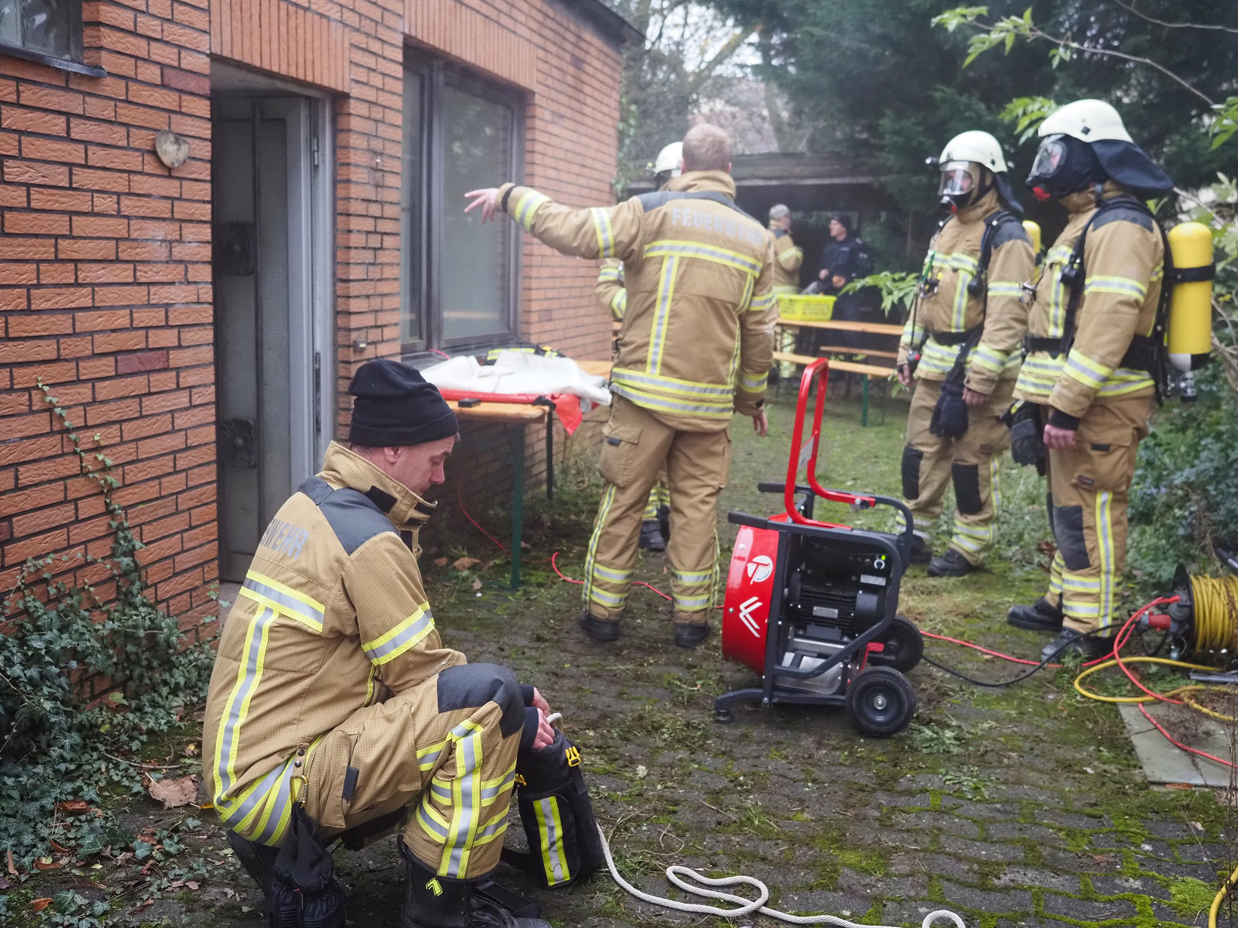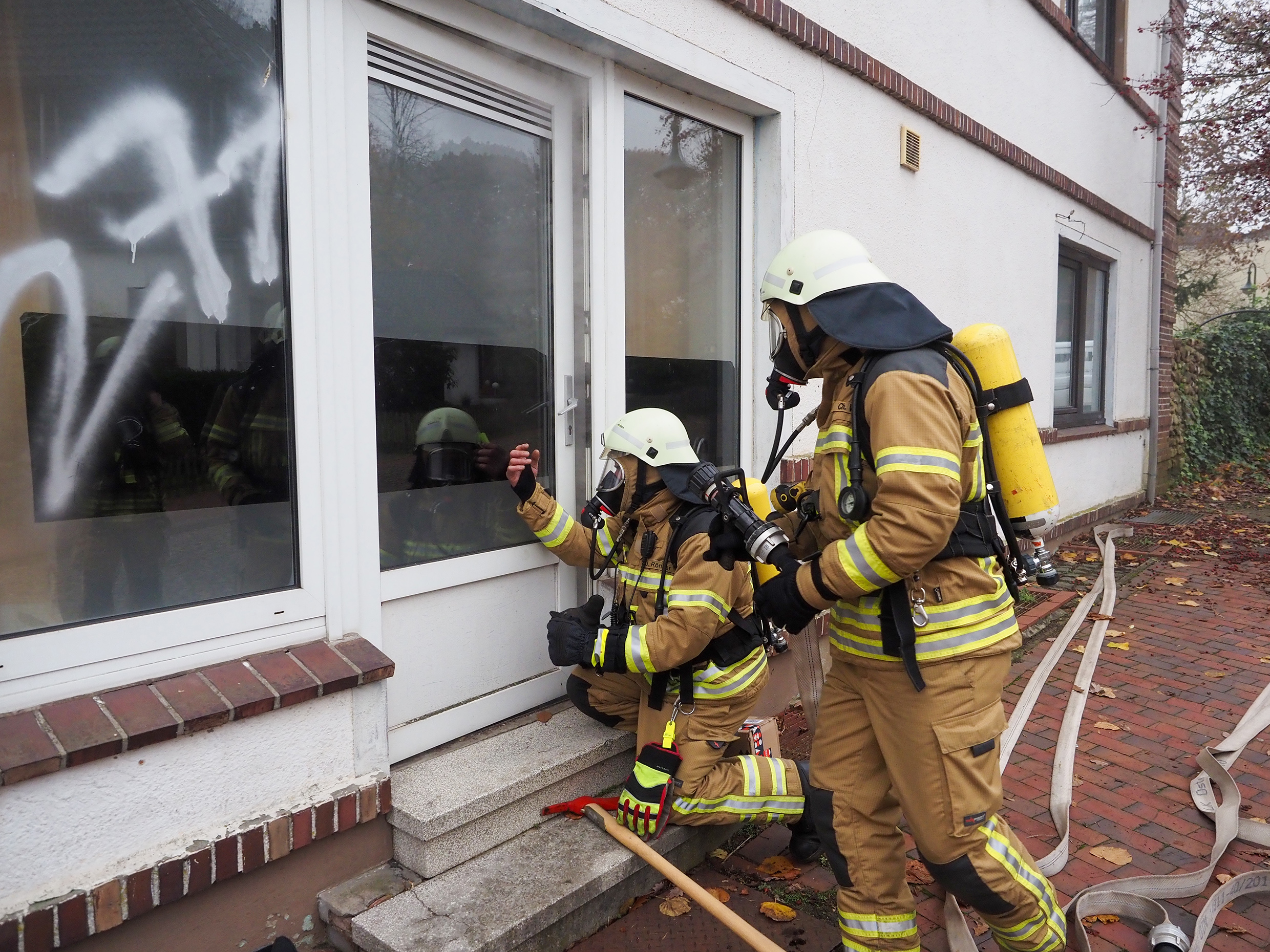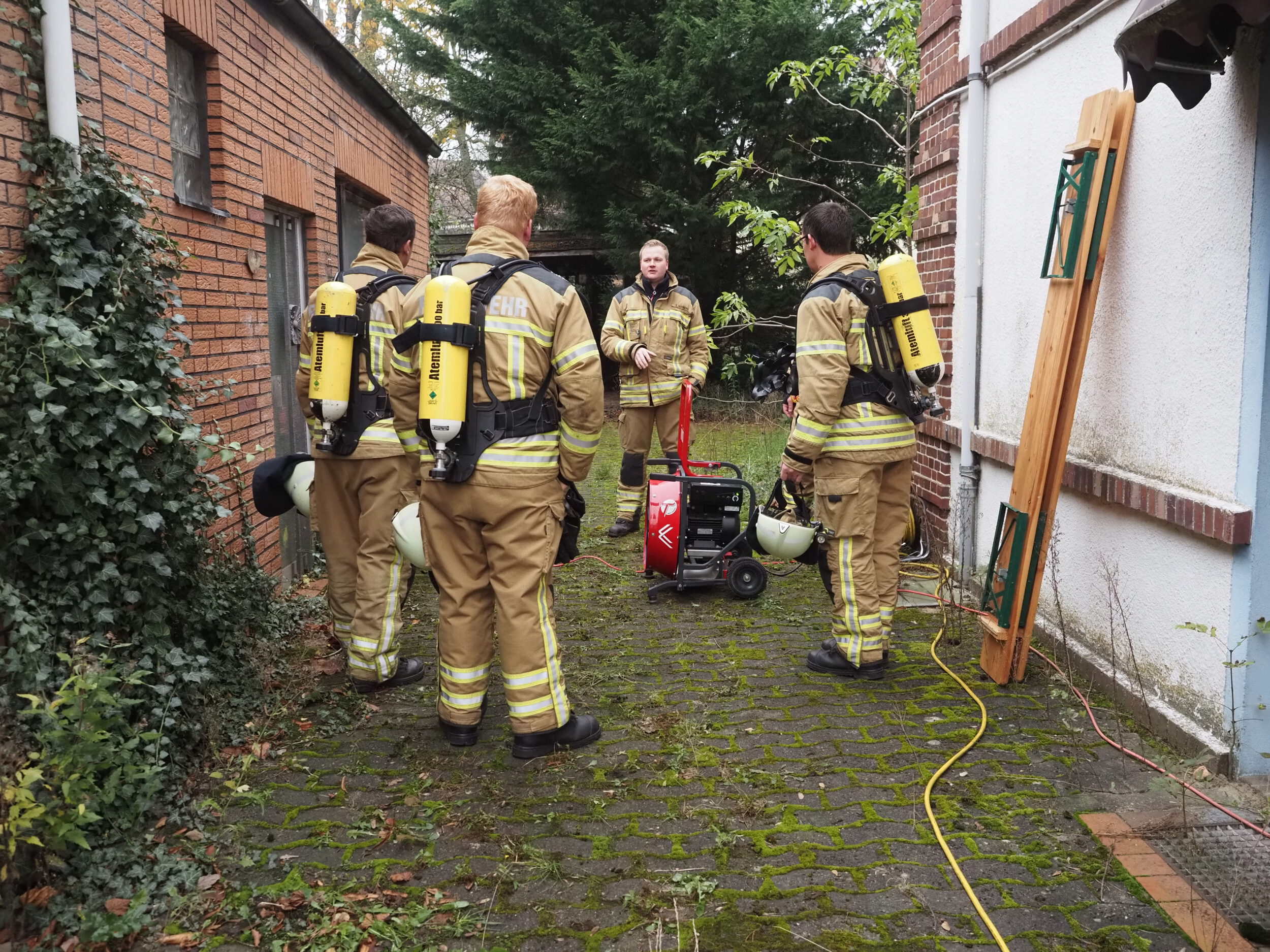 Zum Thema Rauch war ebenfalls die sogenannte „taktische Ventilation“ eine Ausbildungsstation. Hier werden Rauch und Hitze gezielt aus einem Gebäude verdrängt, um die Sicht zur Menschenrettung und Brandbekämpfung zu erleichtern, Rauch durch Atemluft zu verdrängen und die Temperatur im Brandobjekt zu senken. Der Feuerwehr standen für die praktischen Übungen zwei leer stehende Abbruchgebäude im Bereich „Hinter der Kirche“ zur Verfügung, in denen die Einsatzkräfte auch mit Wasser arbeiten konnten. „Solche Objekte sind optimal, um zu trainieren“, so Carsten Gloystein, „wir sind froh, die Gelegenheit hierfür zu haben“. Die Atemschutztrupps mussten unter fachkundiger Aufsicht der Ausbilder, die in dem völlig vernebelten Haus versteckten Übungspuppen finden und retten. Aber auch der Eigenschutz wurde geübt – die richtige Vorgehensweise beim sogenannten Atemschutzunfall, also die Notlage eigener Kräfte, war ebenfalls Bestandteil der Ausbildung.
