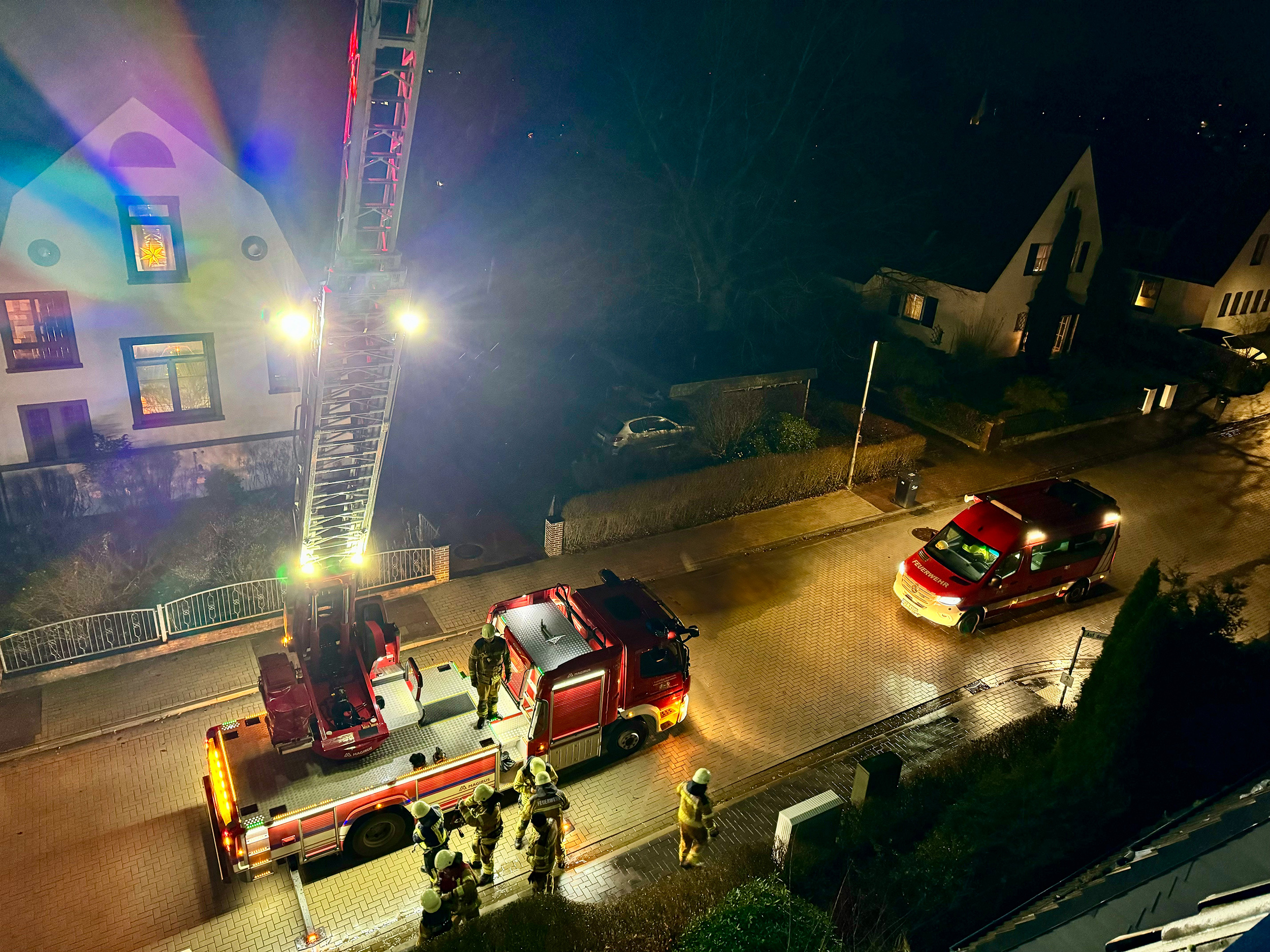 Aufwendig gestaltete sich der Einsatz, der die Weihnachtsfeier der Ortsfeuerwehr Osterholz-Scharmbeck um 22 Uhr jäh beendete: bei einem Mehrfamilienhaus an der Straße „Auf dem Paß“ lagen 18 große Pakete mit Isoliermaterial für anstehende Arbeiten ungesichert auf dem Dach und begannen bereits, vom Wind erfasst, zu Boden zu fallen. Die Einsatzstelle wurde mit Lichtmasten und Drehleiter ausgeleuchtet, während sich mehrere Trupps, gesichert mit entsprechendem Höhenrettungsgeschirr auf dem Dach daran machten, die Materialien sicher abzuseilen. Nachdem das Dach geräumt war, konnten die ca. 20 Einsatzkräfte nach zwei Stunden wieder einrücken.