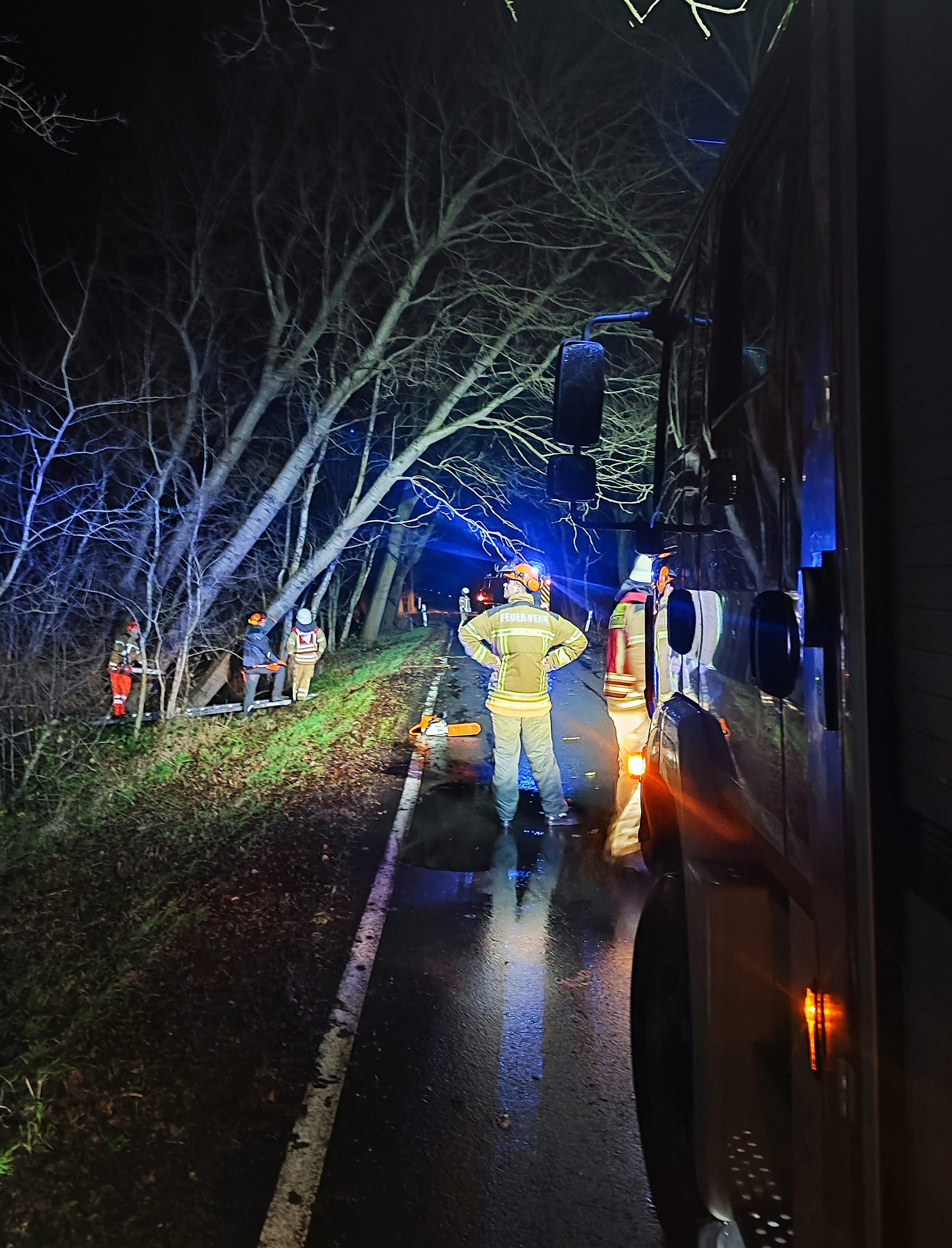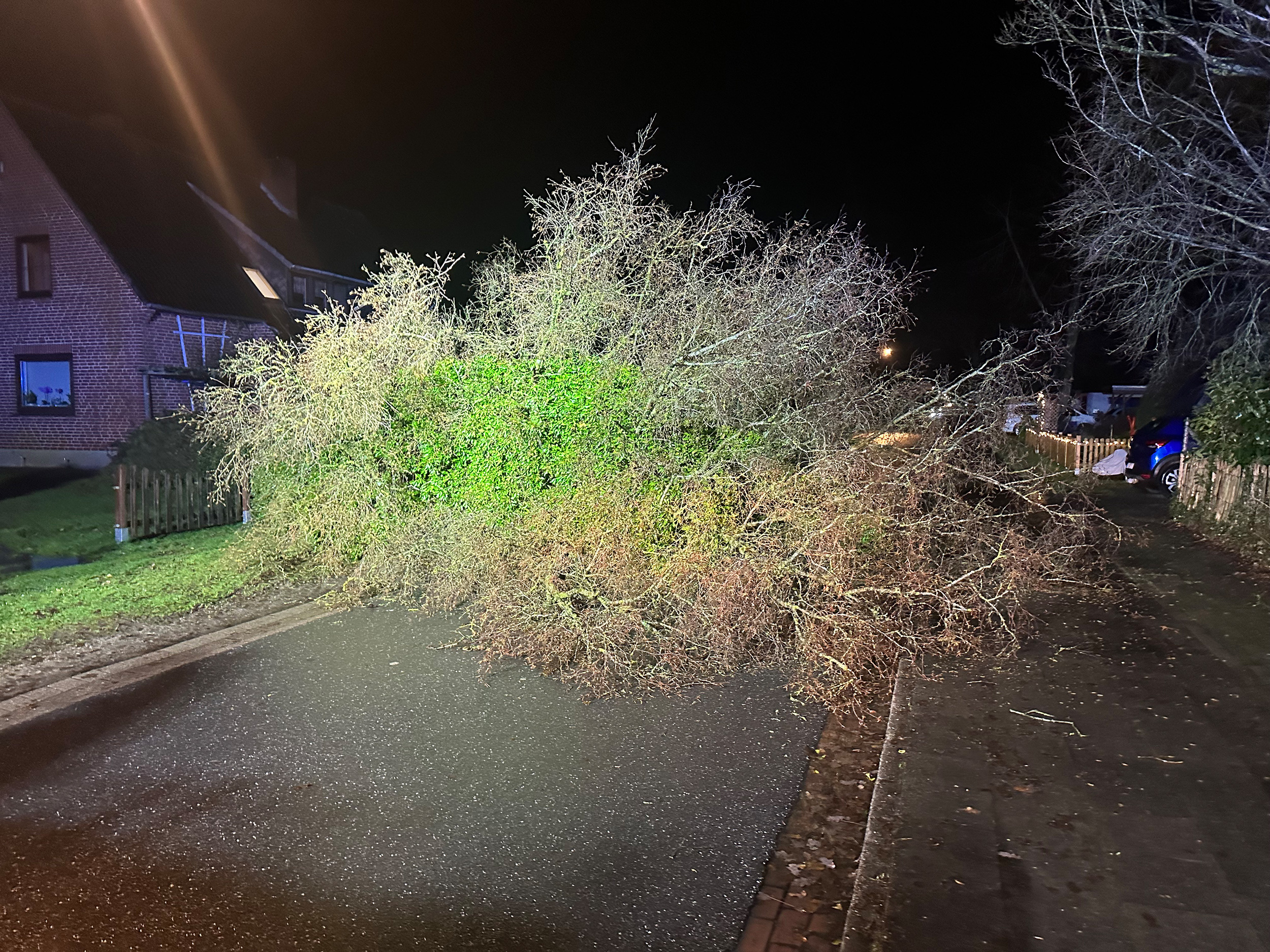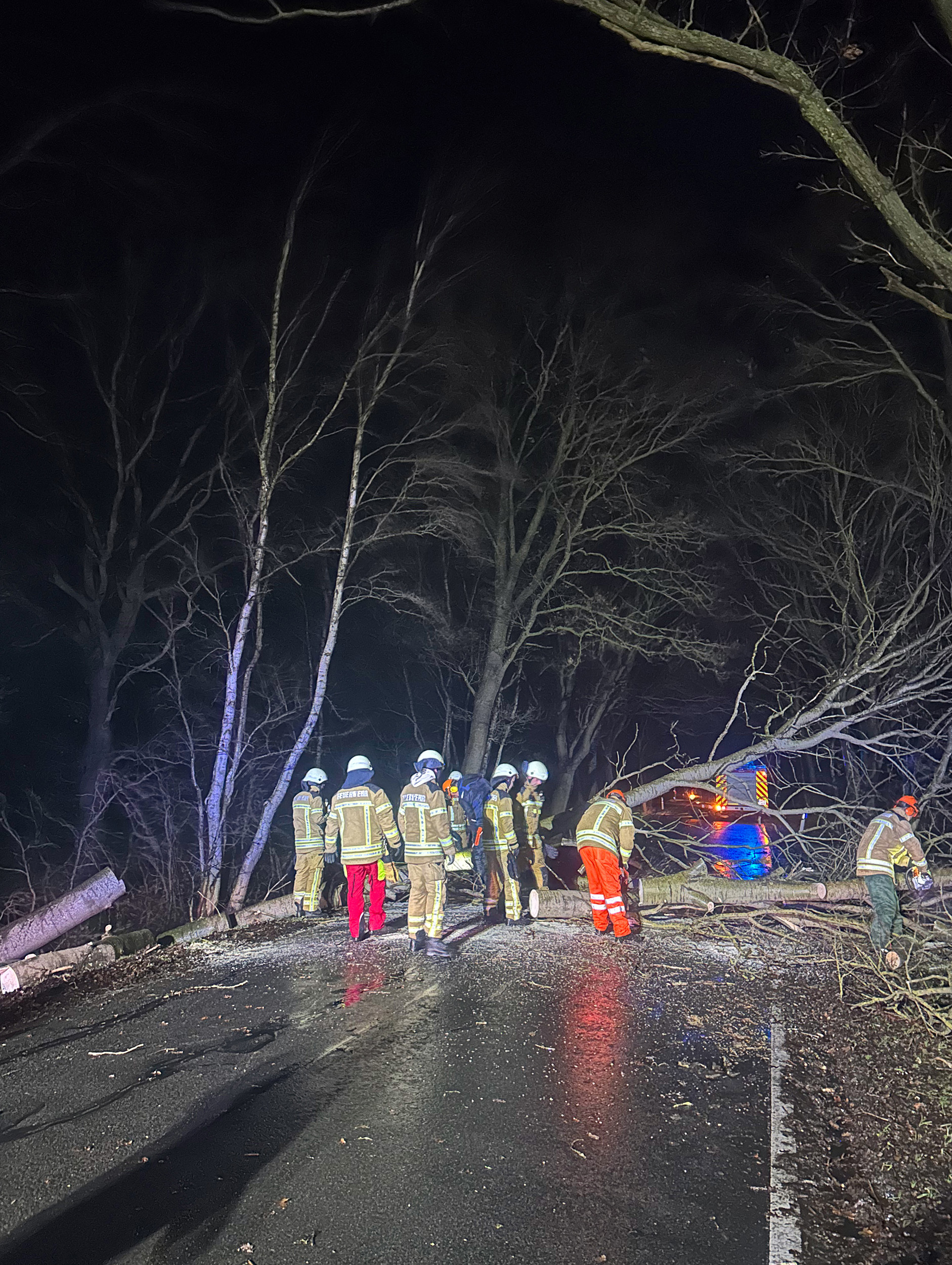 Die Ortsfeuerwehr Garlstedt wurde zwischen 23 Uhr und 10 Uhr am Folgetag zwei mal zu Einsätzen alarmiert. Zunächst musste auf der Bremerhavener Straße ein Baum beseitigt werden. Die zweite Einsatzstelle im Wacholderweg betraf eine Kiefer, die ein Überland-Telefonleitung beschädigt hatte. Auch dieser Baum wurde durch die Einsatzkräfte entfernt.
