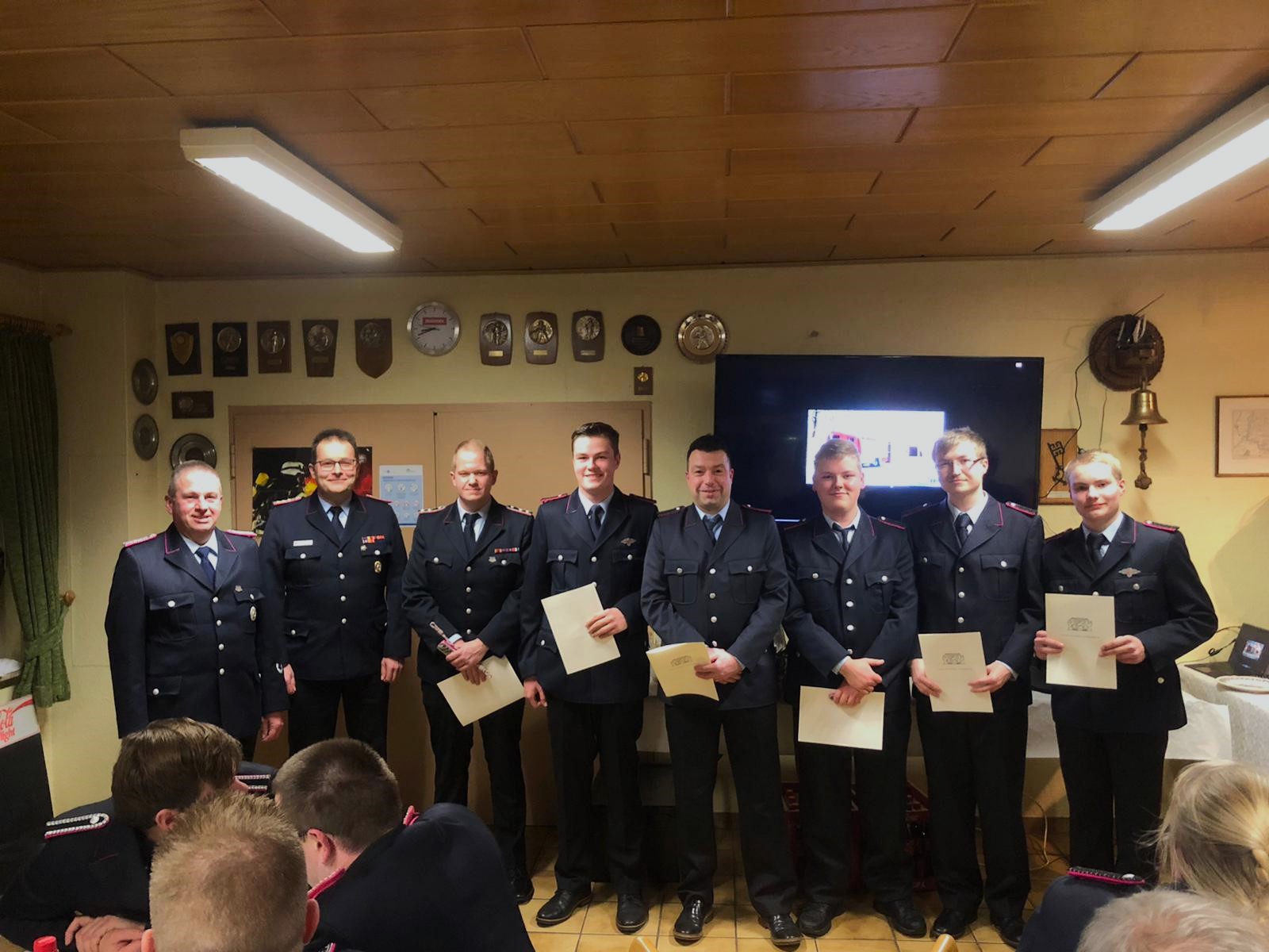 Nach erfolgreicher Teilnahme des Truppmann 1 Lehrgangs und das Erreichen der geforderten Dienstzeit beförderte Ortsbrandmeister Jens Beckmann die Kameraden Daniel Nowak, Niklas Hansen, Lucas Neubert, Markus Schwanewede und Johannes Knape zum Feuerwehrmann.