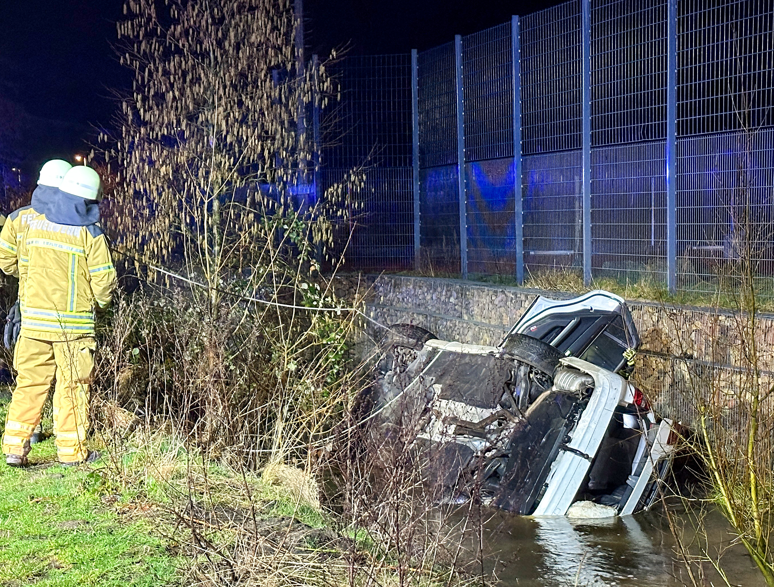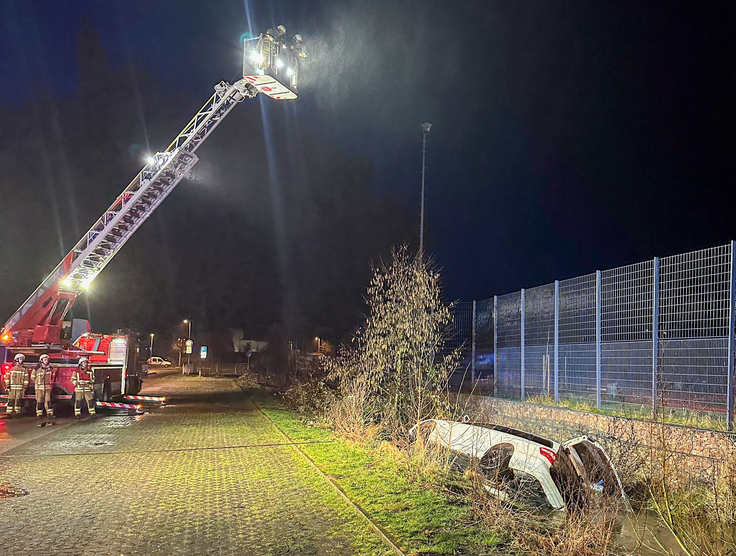 In der Nacht zum Montag wurde die Ortsfeuerwehr Osterholz-Scharmbeck mit den Stichwörtern „Verkehrsunfall / eingeklemmte Person/ Pkw auf Dach“ zum Bereich am Barkhof alarmiert. Vor Ort fanden die Einsatzkräfte einen Pkw vor, der seitlich im Wasser des dortigen Grabens lag. Ein Trupp in Waathosen begab sich mit Leinen gesichert sofort ins Wasser und kontrollierte das Fahrzeug, konnte jedoch keine Personen mehr im Inneren feststellen.