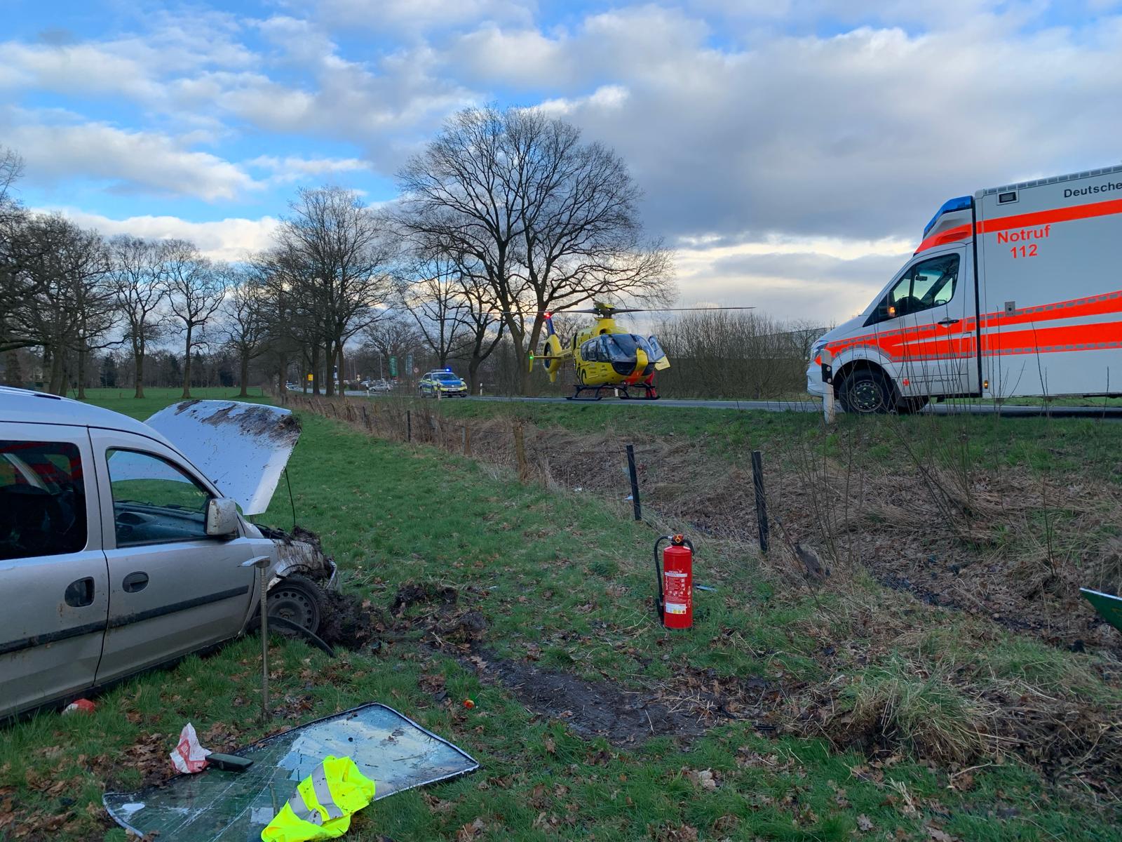 Ein Fahrer kam dort mit seinen Pkw von der Straße ab. Das Fahrzeug streifte zwei aufeinander folgende Bäume, überfuhr einen Graben und kam nach einem Überschlag auf einer Wiese zum Stehen. Da zunächst unklar war, ob der Fahrer eingeschlossen war, wurde zusätzlich die Ortsfeuerwehr Osterholz-Scharmbeck hinzu alarmiert. Da beim Eintreffen der Ortsfeuerwehr Heilshorn die verletzte Person bereits aus dem Fahrzeug befreit war, konnten die Einsatzkräfte aus Osterholz-Scharmbeck die Anfahrt jedoch abbrechen. Der Fahrer wurde an den Rettungsdienst übergeben. Zur weiteren Behandlung wurde durch den Rettungstransporthubschrauber „Christoph 6 “ ein Notarzt zur Einsatzstelle gebracht.