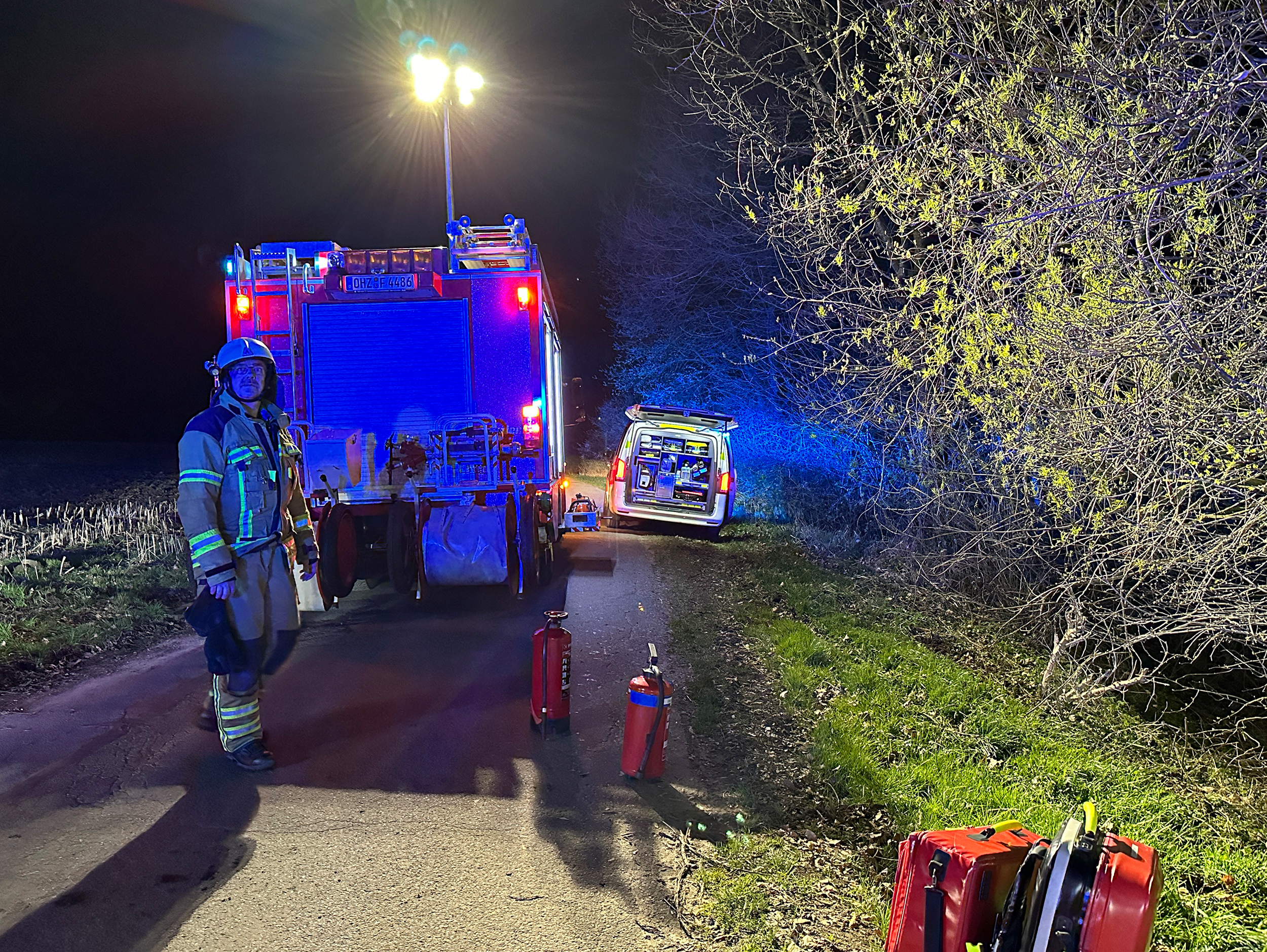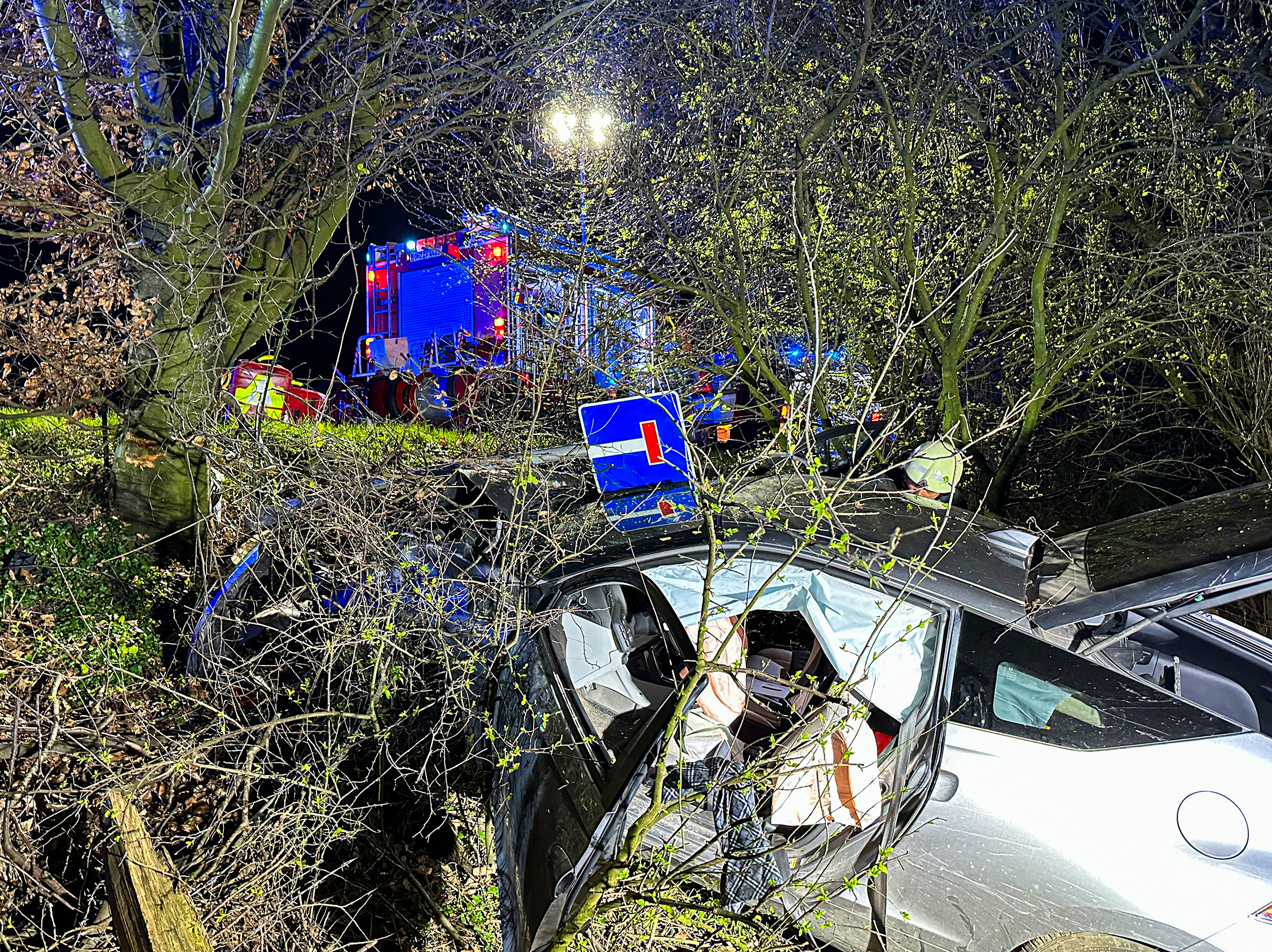 Die Ortsfeuerwehr Osterholz-Scharmbeck wurde in der Nacht zum Dienstag nach Buschhausen alarmiert. Im Bereich Bahrenwinkel war ein Pkw mit zwei Personen schwer mit einem Baum kollidiert. Mindestens eine Person sollte nach erster Rückmeldung im Fahrzeug eingeklemmt sein. Am Einsatzort bestätigte sich die Lage, Rettungsdienst und Polizei waren schon vor Ort. Der verunfallte Pkw lag nach der Kollision mit dem Baum einige Meter entfernt im Straßenseitenraum, beide Personen befanden sich noch im Fahrzeug. Die Feuerwehr stellte den Brandschutz sicher und leuchtete den Unfallort aus. In enger Abstimmung mit dem Notarzt konnten Fahrer und Beifahrer mit leichtem Gerät durch die Feuerwehr aus dem Fahrzeug befreit und dem Rettungsdienst übergeben werden. Anschließend wurde die Einsatzstelle der Polizei übergeben und die Feuerwehr rückte wieder ein.