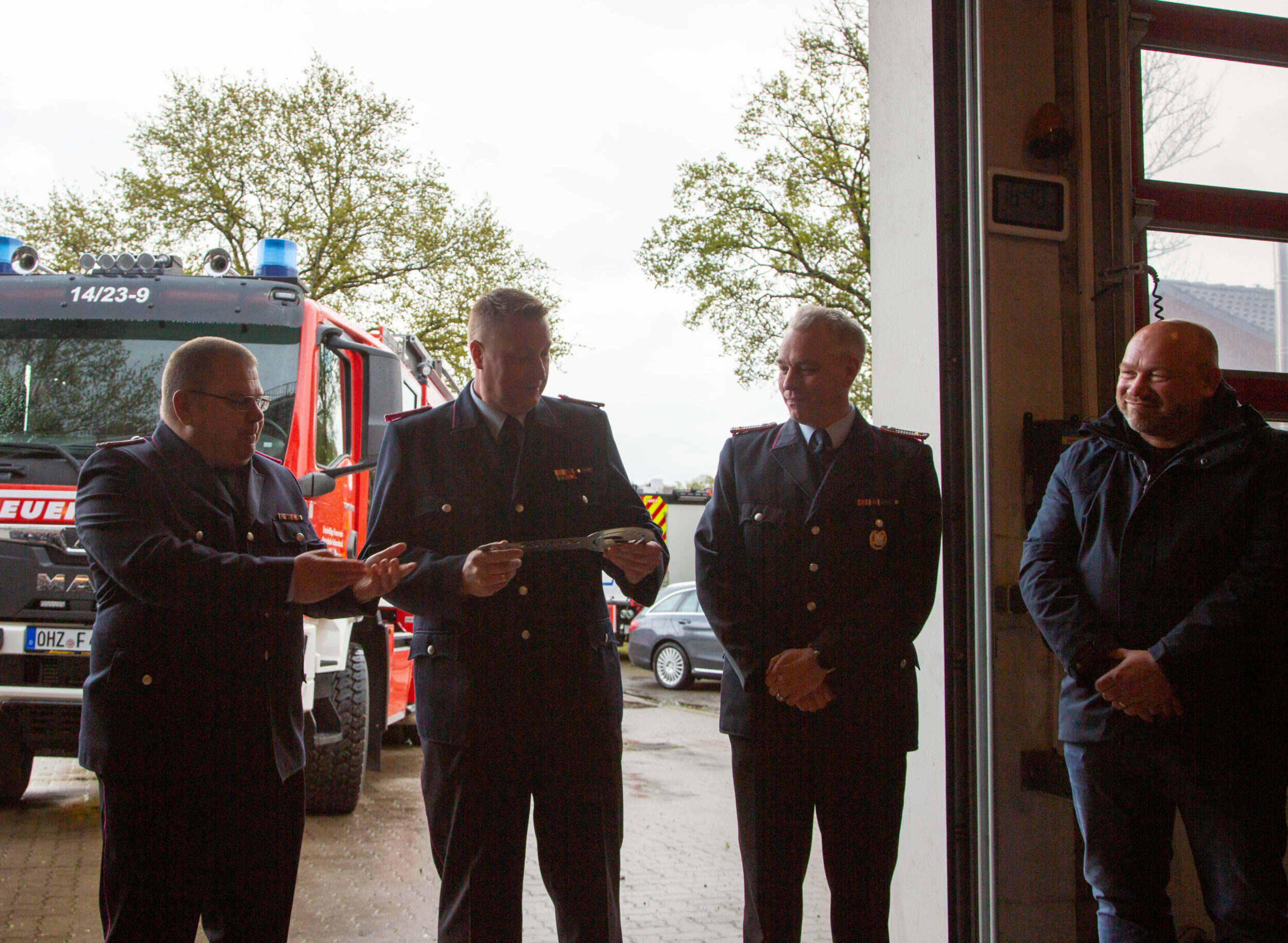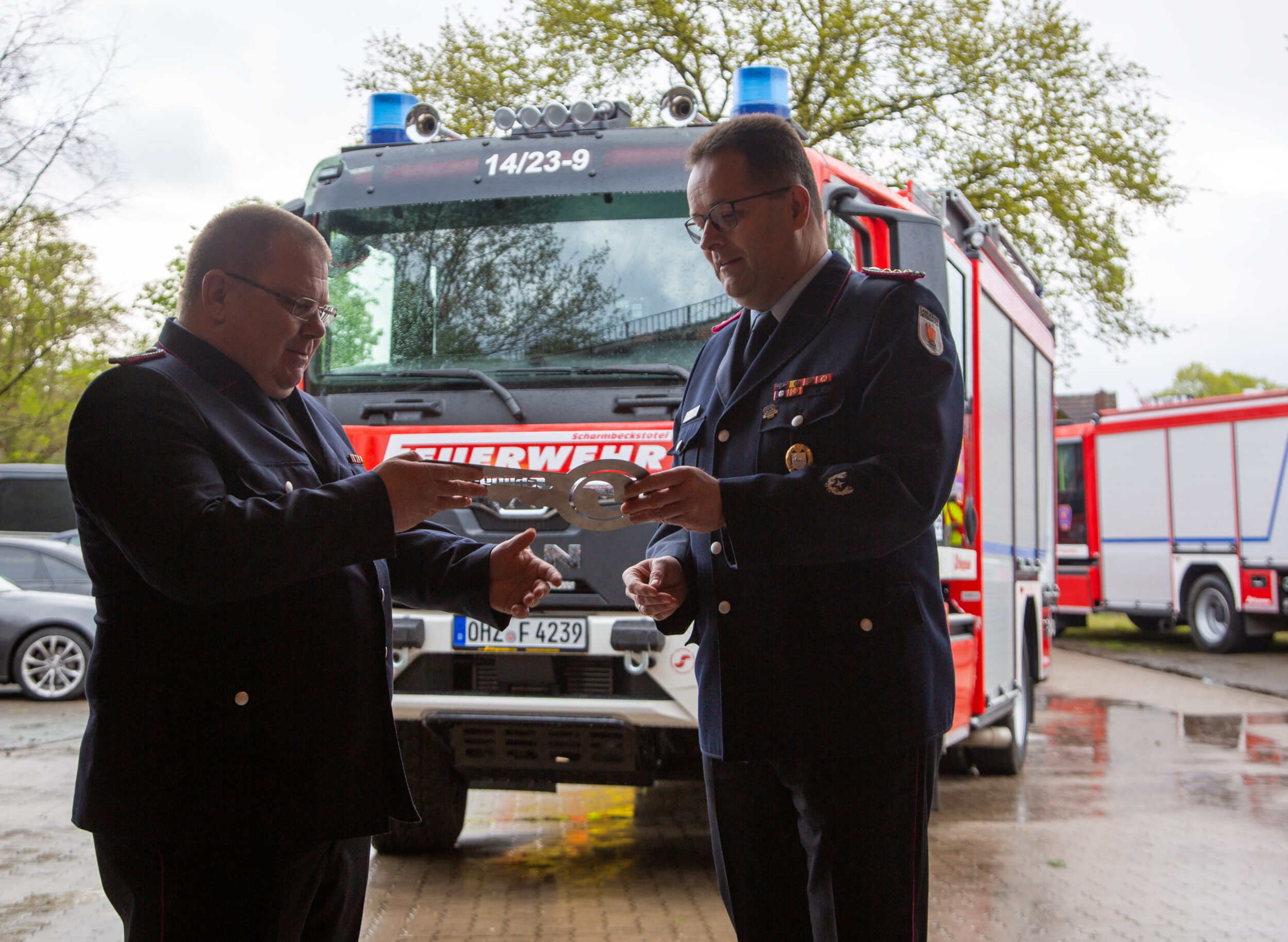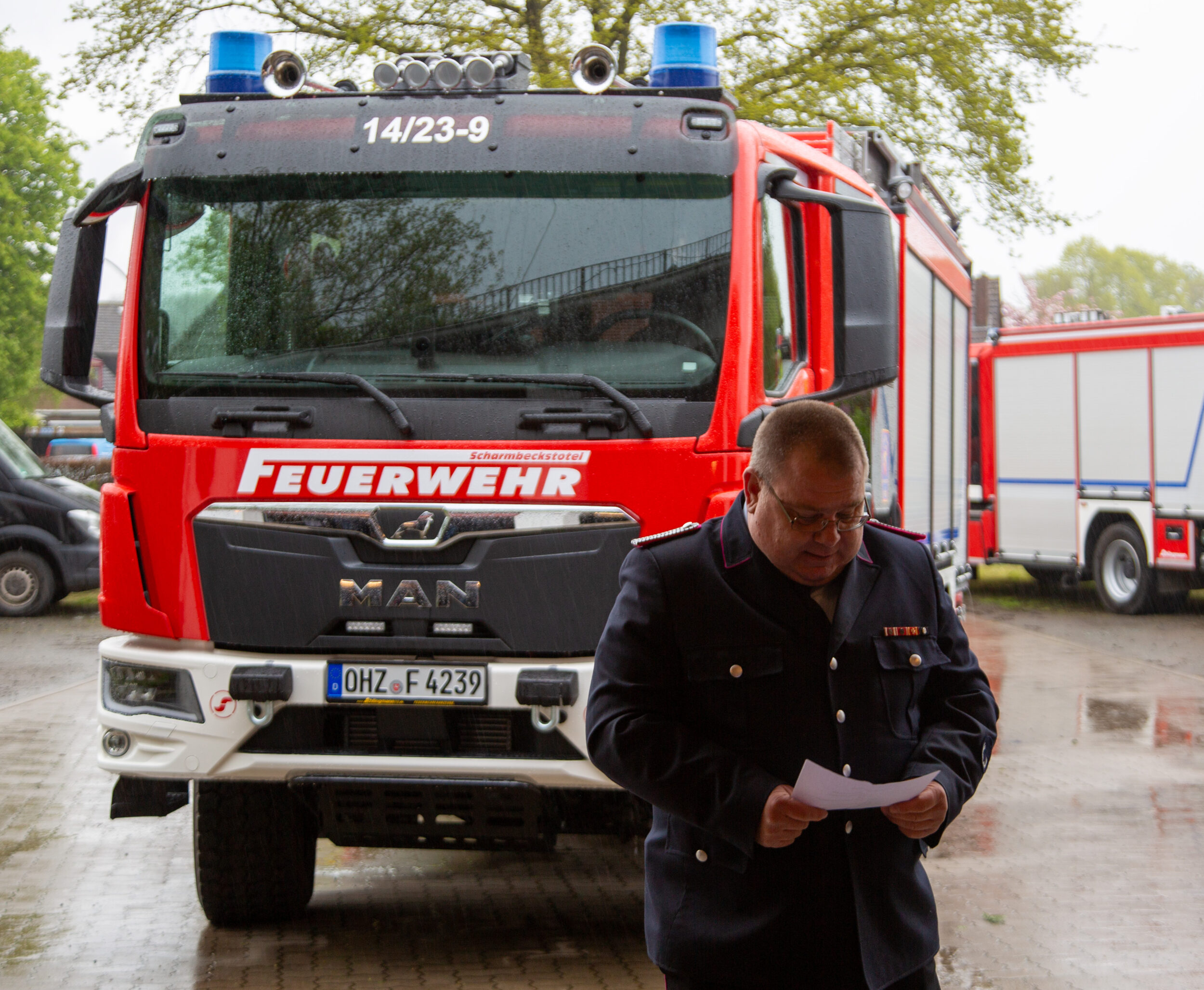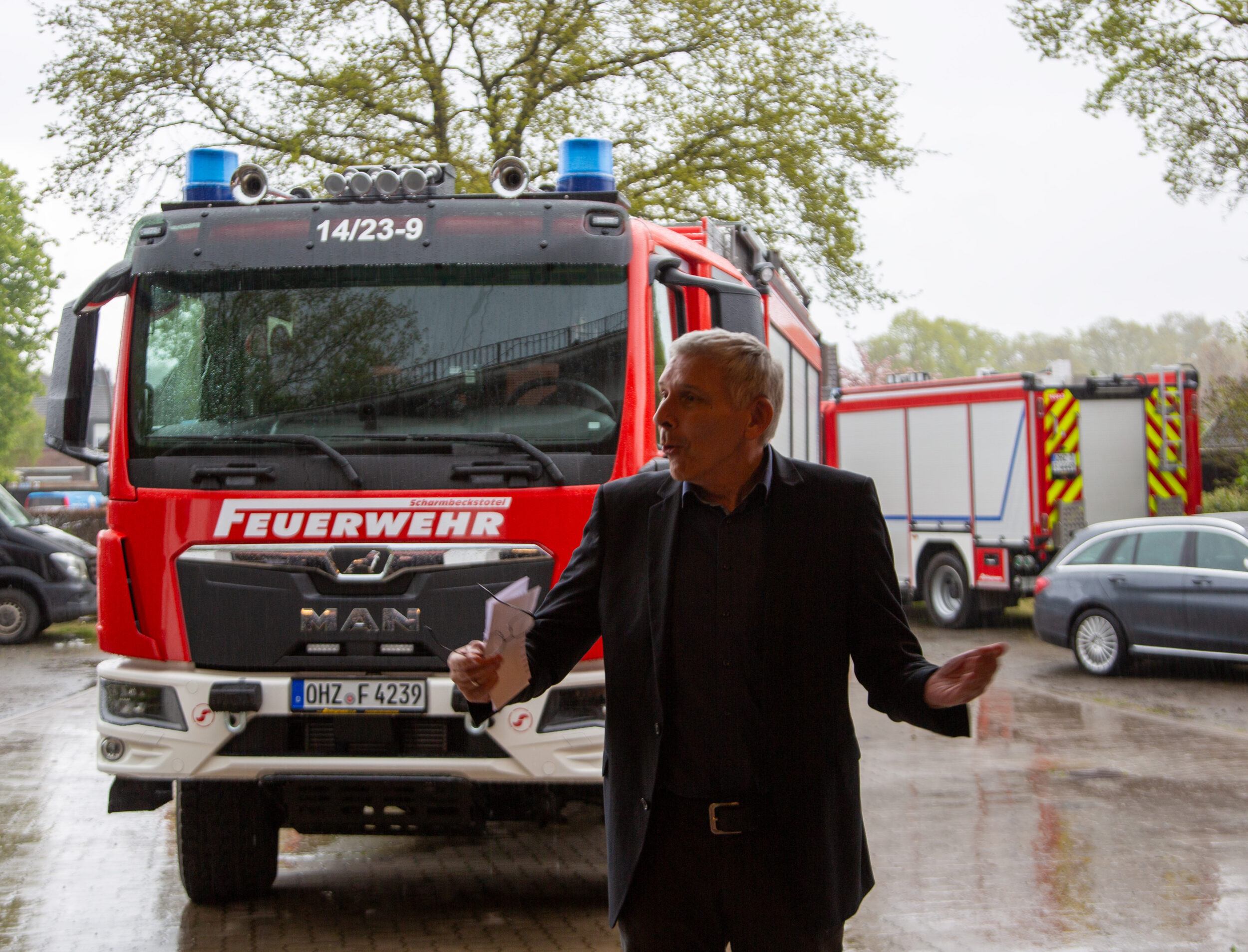 Das 355.000 EUR teure Tanköschfahrzeug war bereits 2021 durch die Verwaltung bestellt worden. „Um so mehr freuen wir uns, dass es nun hier ist“, sagte der Bürgermeister, bevor er den symbolischen Schlüssel an Stadtbrandmeister Jörg Bernsdorf weitergab. Dieser, wie auch Ralph Meierdiercks dankten explizit dem vorherigen Führungsduo der Ortsfeuerwehr Scharmbeckstotel, Andreas Lilienthal und Torben Breden, die maßgeblich an Planung und Beschaffung beteiligt gewesen waren. Bei Torben Breden schloss sich dann auch der Kreis des Schlüssels – als amtierender Gerätewart nahm er das Fahrzeug offiziell in seine Obhut.